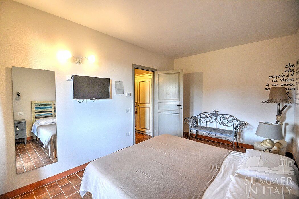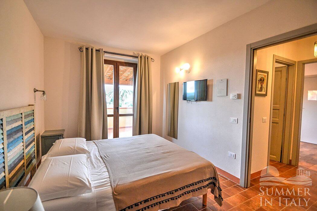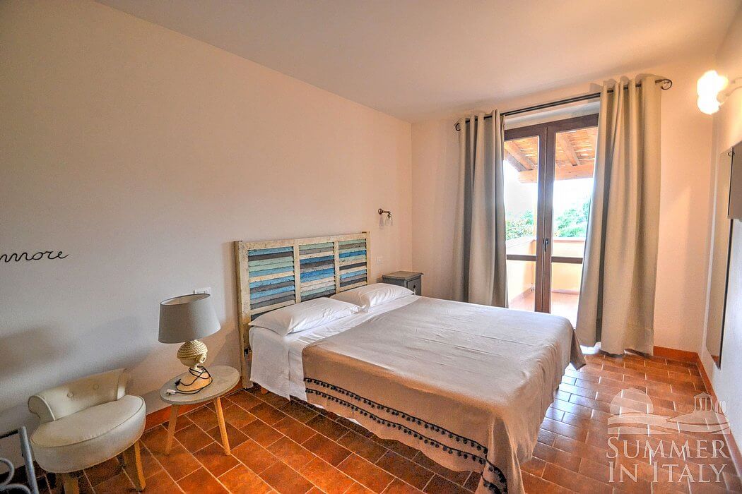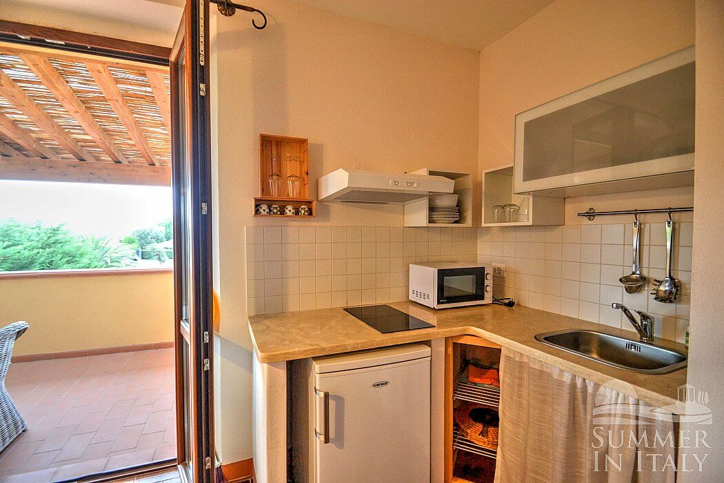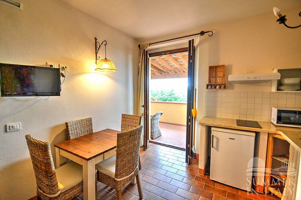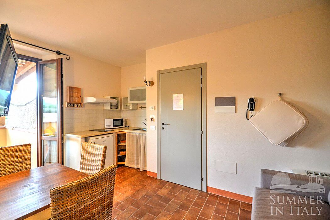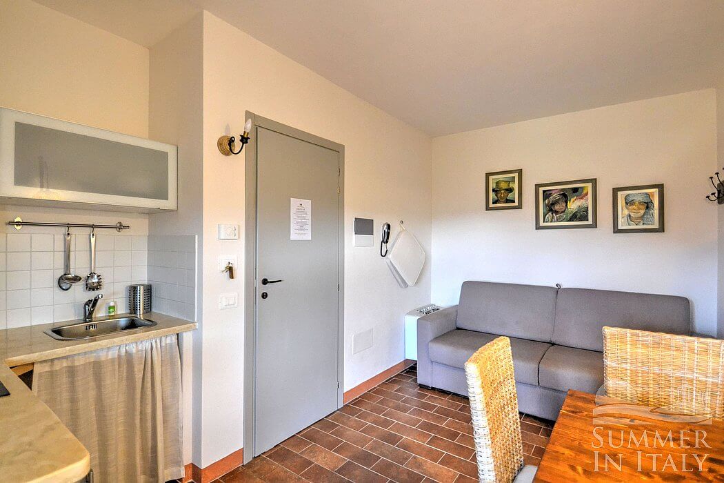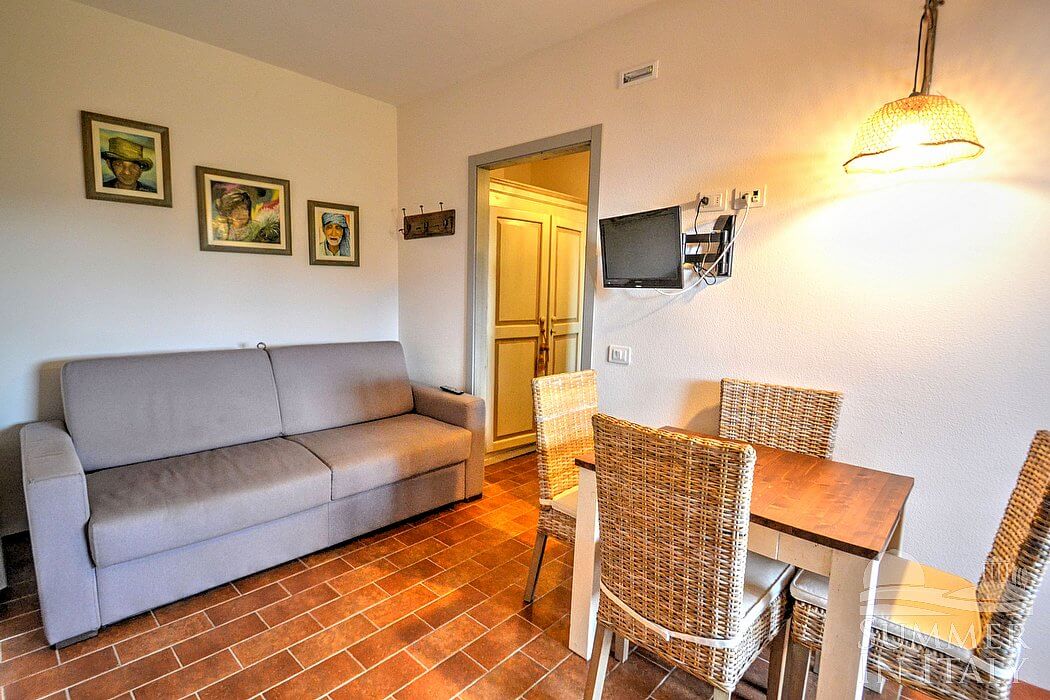 The living room is paved with terracotta tiles. The furnishings are cozy and comfortable. The furnishings include a divan that unfolds into a double bed. In the living room you will also find a cooking area. The kitchenette is equipped with a two-burner electric cooker, a small electric oven, a small refrigerator with freezer and an Italian-style coffee-maker. The dining table can accommodate four guests. In this room you will find a satellite television (local channels). From the living room you will be able to enter the terrace through a French door. The room is equipped with an air conditioning/heating unit.