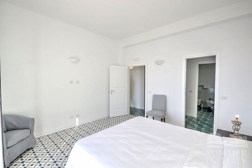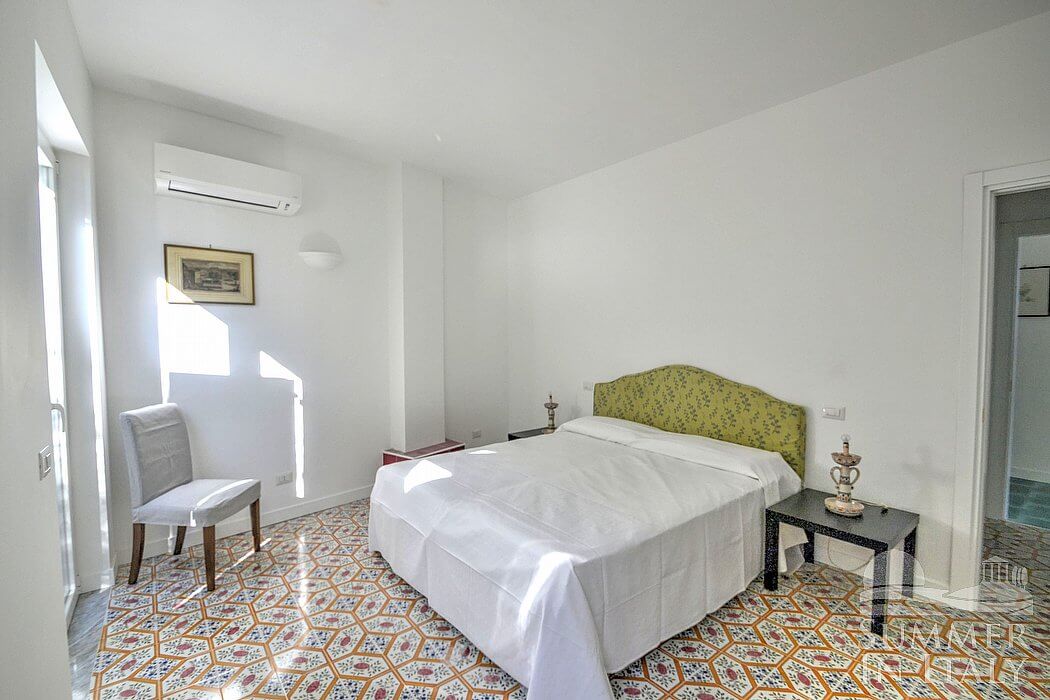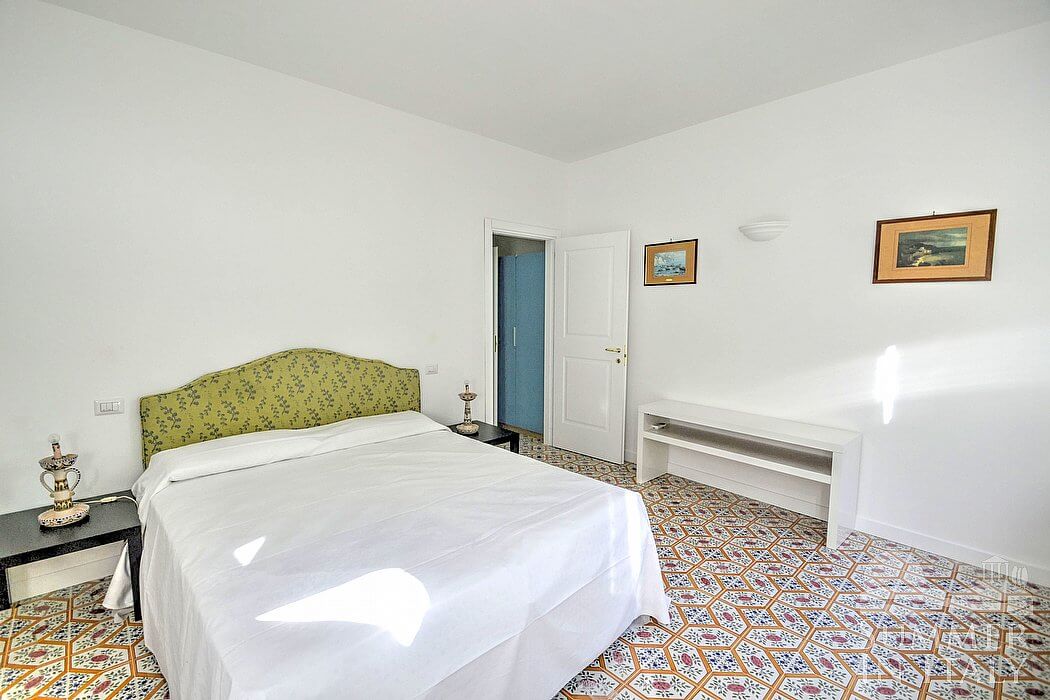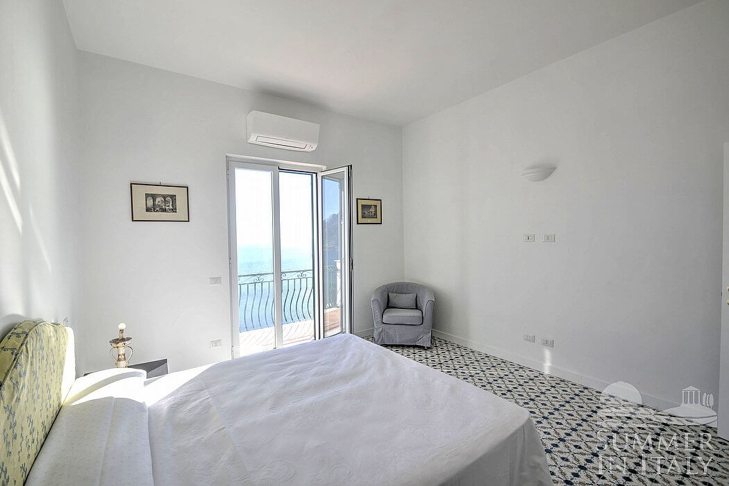 You will be able to enter the first bedroom through a corridor. The bedroom has a matrimonial bed (160 cm/62 inches, wider than a queen-size bed). In this room you will find a satellite television (local channels). From the bedroom you will be able to enter the terrace with a view of the sea and of the coast of Amalfi through a French door. The bedroom is equipped with an air conditioning/heating unit. This bedroom has an en-suite bathroom, equipped with a washbasin, a toilet, a fully enclosed shower and a hairdryer.