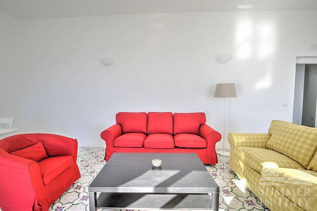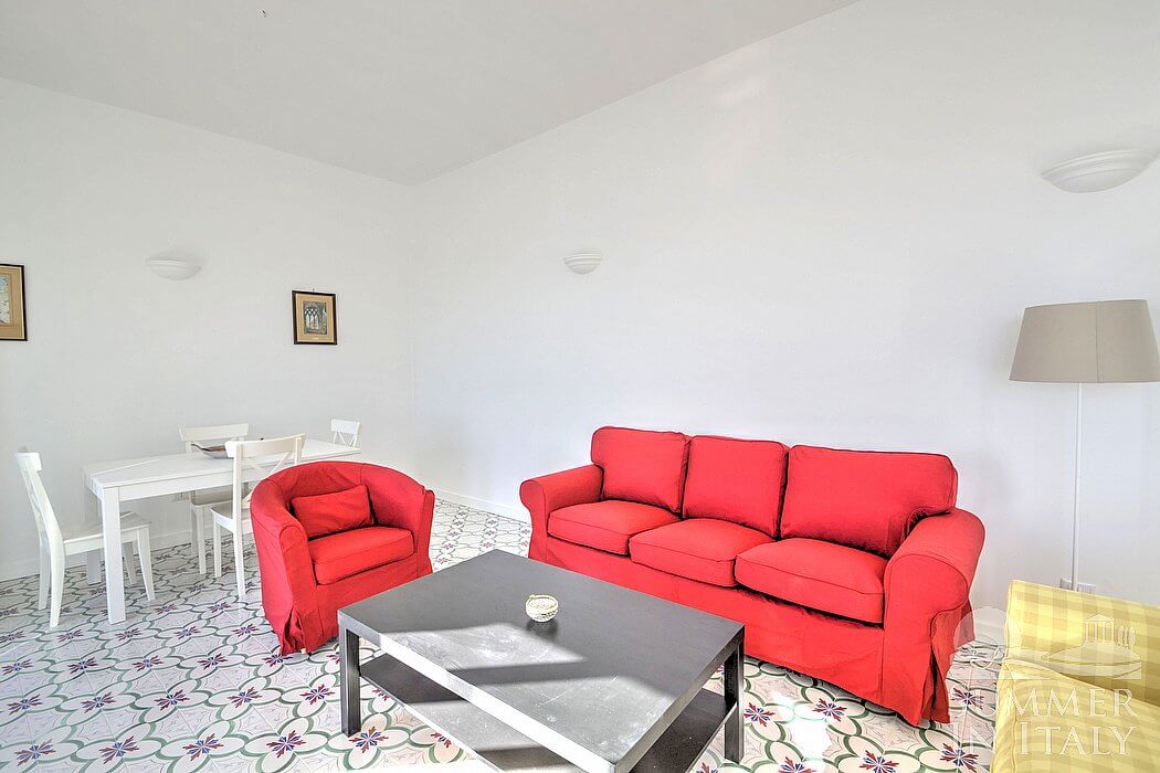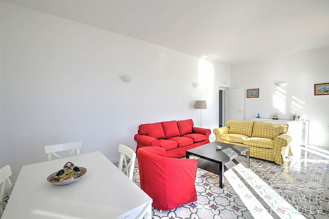 The living room is paved with tiles with handmade decoration, in the characteristic style of the Amalfi Coast. The furnishings are bright and agreeable. The furnishings include two sofas and an armchair. The dining table can accommodate four guests. In this room you will find a satellite television (local channels). From the living room you will be able to enter the terrace with a view of the sea and of the coast of Amalfi through two French doors. The room is equipped with an air conditioning/heating unit.
