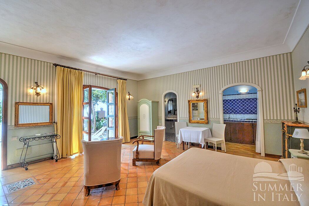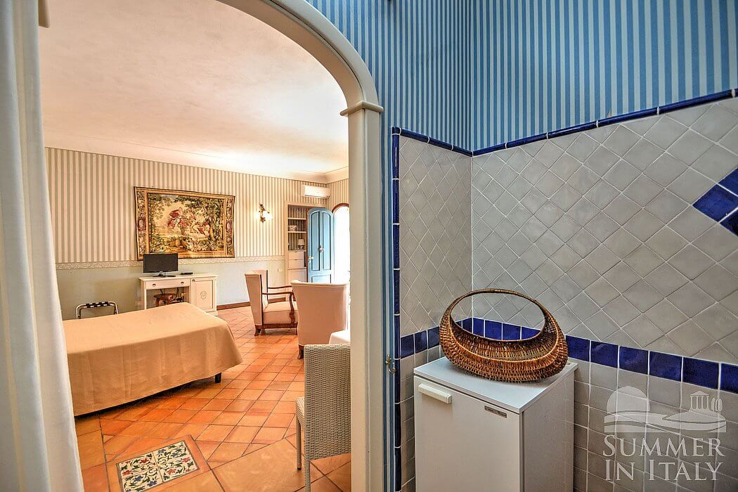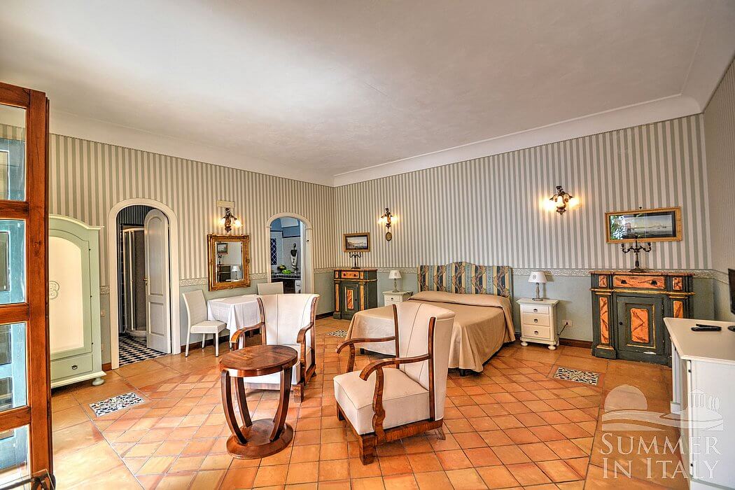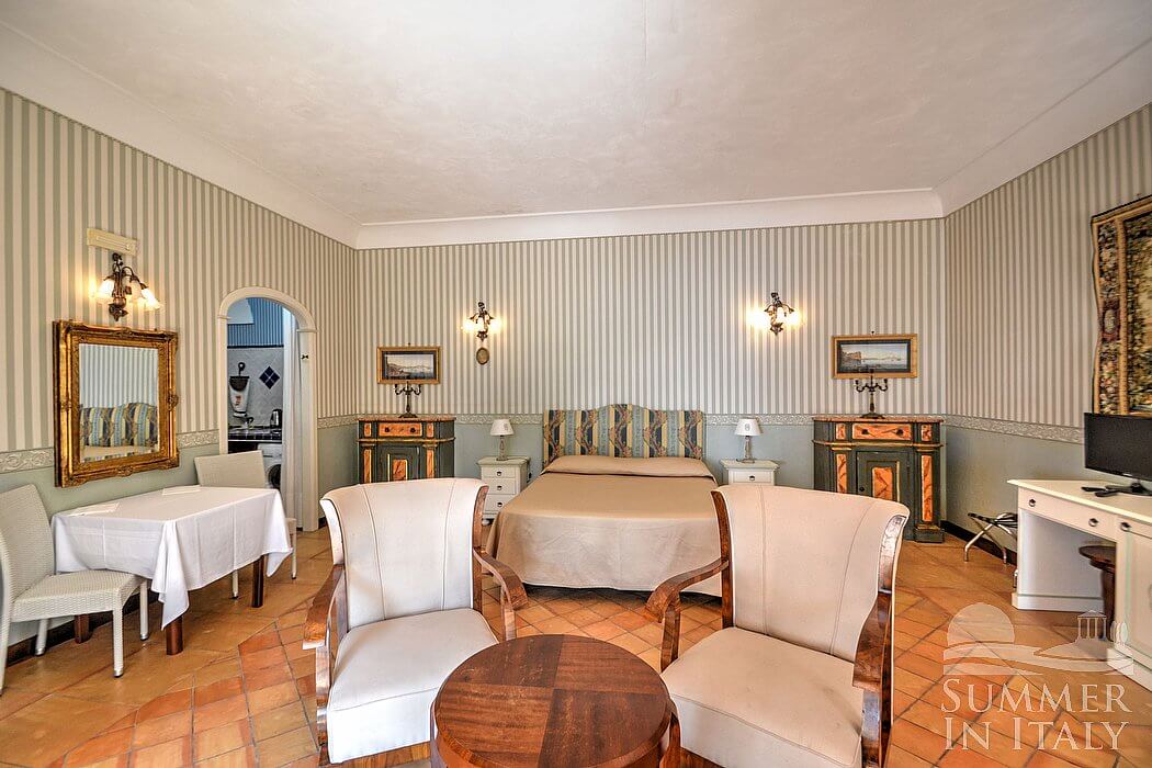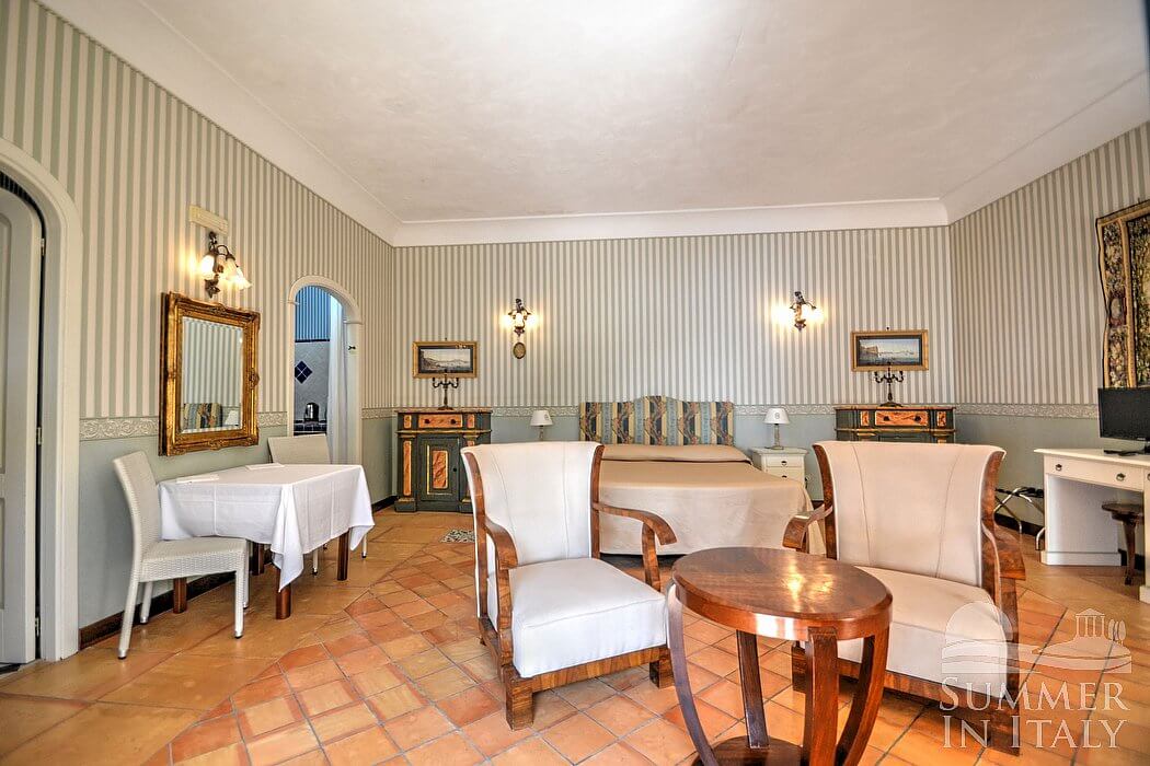 The living room is paved with terracotta tiles. The furnishings are elegant and refined, featuring some antique pieces. Here you will find a matrimonial bed (160 cm/63 inches, wider than a queen-size bed), as well as two armchairs and a desk. In this room you will find a television (local channels). From the living room you will be able to enter the terrace with a view of the sea through a French door. Here you will also find a mini refrigerator.