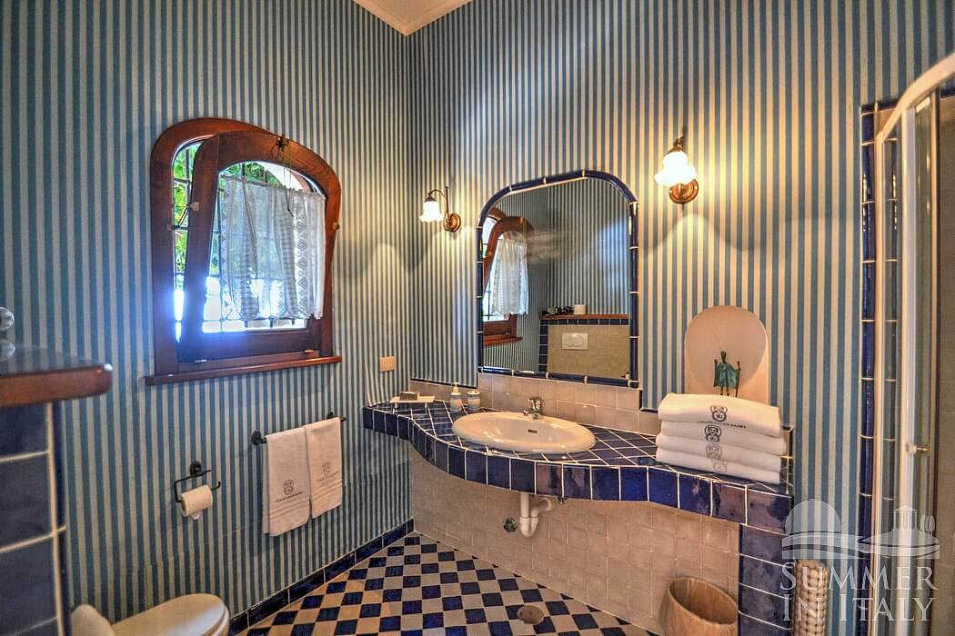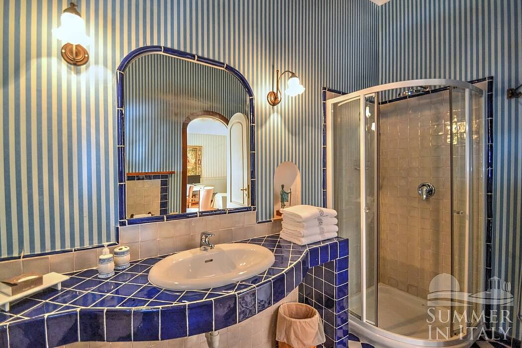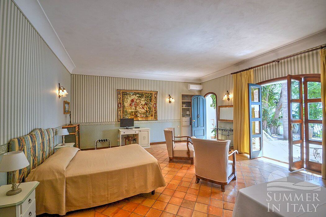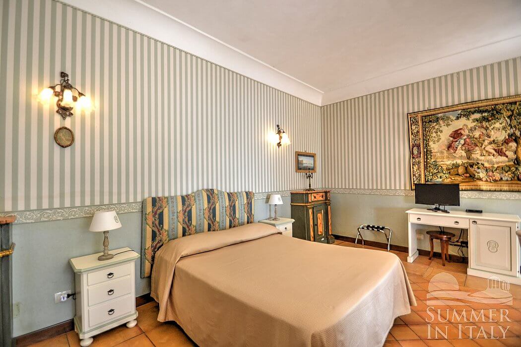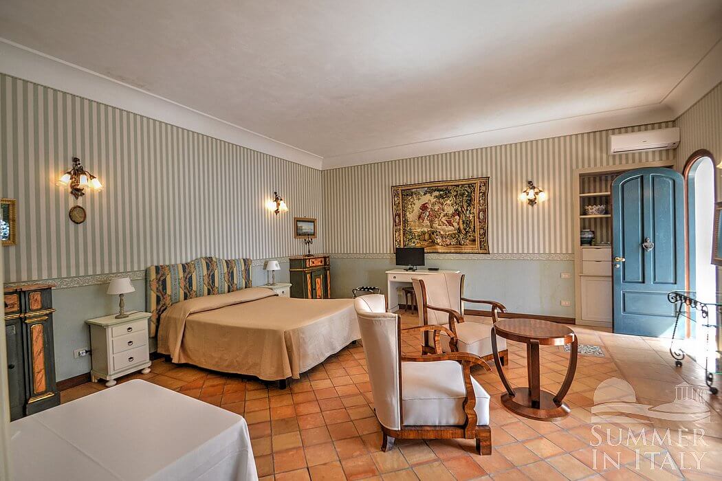 The living room is paved with terracotta tiles. The furnishings are elegant and refined, featuring some antique pieces. Here you will find a matrimonial bed (160 cm/63 inches, wider than a queen-size bed), as well as two armchairs and a desk. In this room you will find a television (local channels). From the living room you will be able to enter the terrace with a view of the sea through a French door. Here you will also find a mini refrigerator.