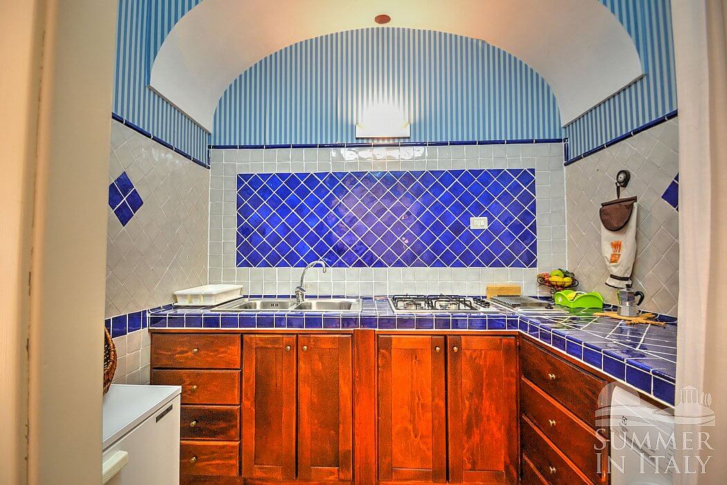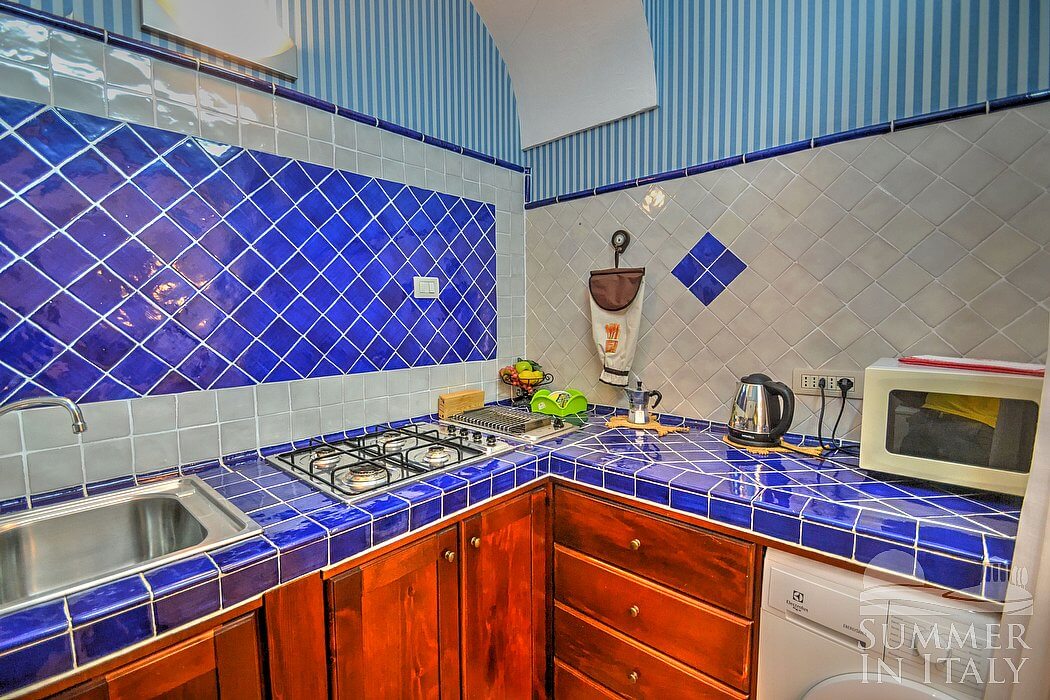 You will be able to enter the kitchen from the living room. The kitchen has no door, but it is closed by a curtain. It is equipped with a four-burner gas cooker, an electric oven, a small refrigerator with freezer, a microwave oven and an Italian-style coffee-maker. Here you will also find a washing machine. The dining table can accommodate two guests.