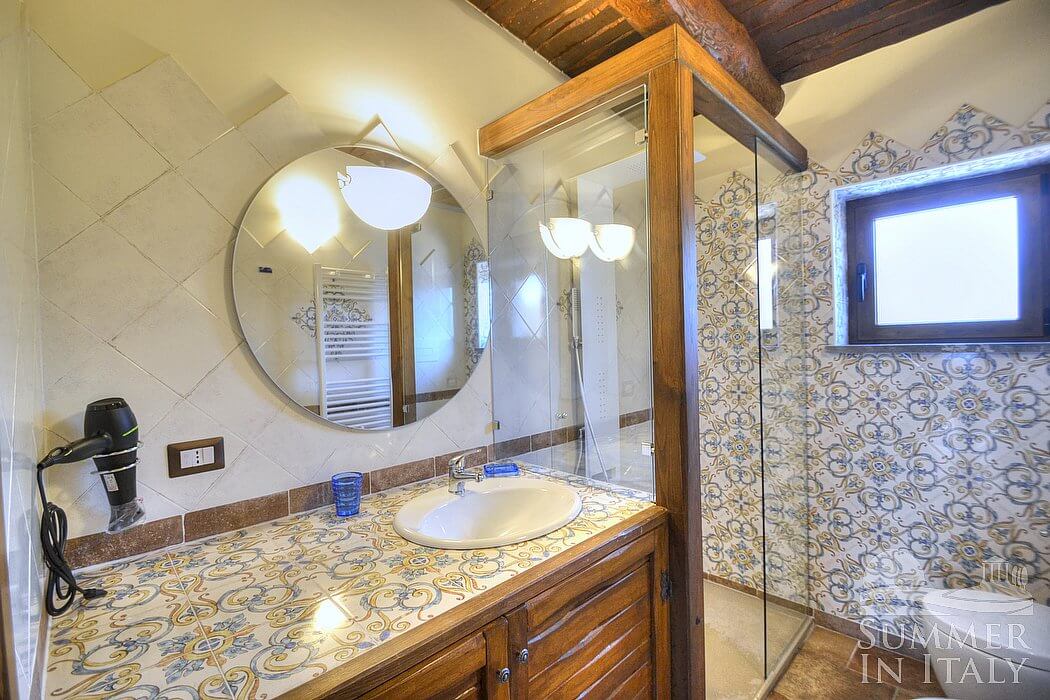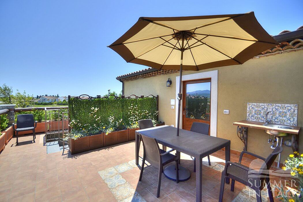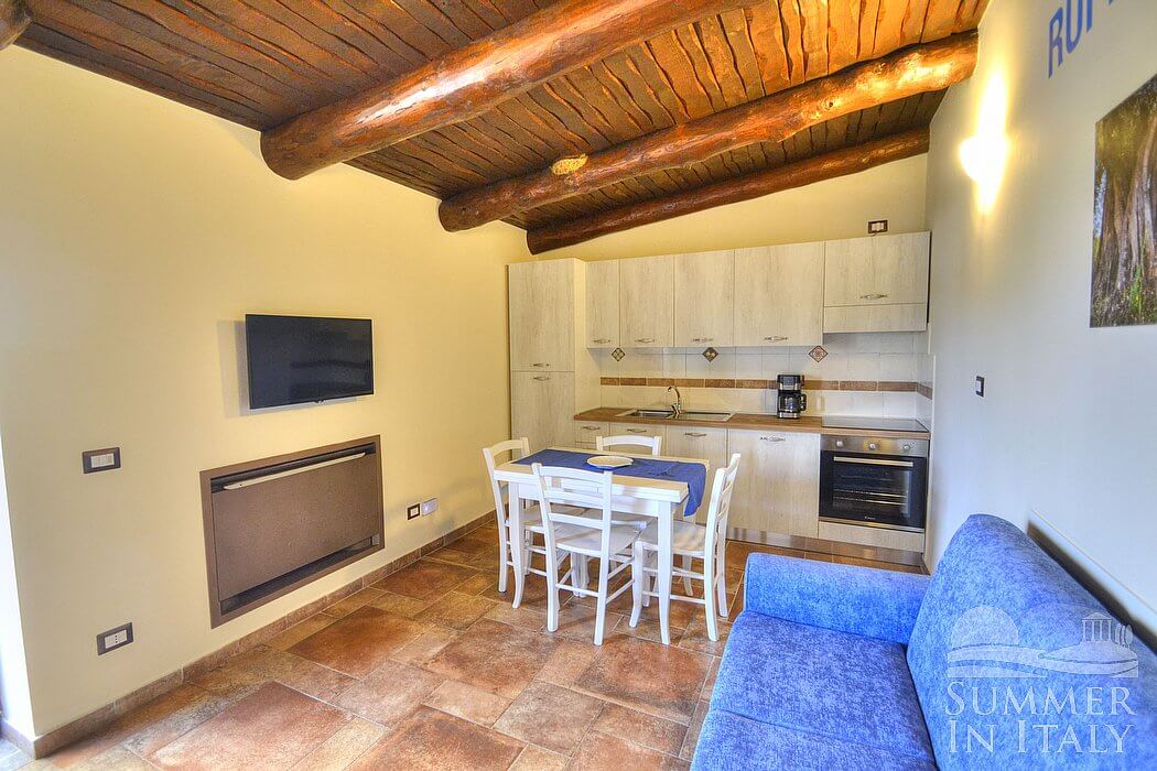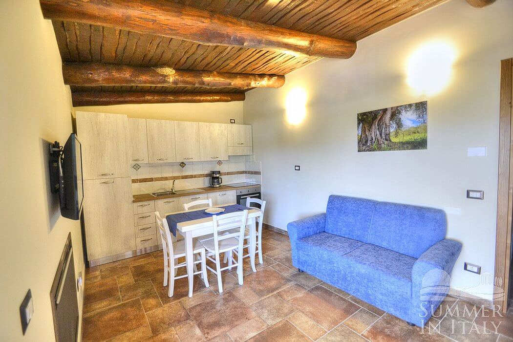 The kitchen is paved with terracotta tiles. The ceiling is made of wood. It is equipped with a four-burner induction cooker, an electric oven, a refrigerator with freezer, a dishwasher, an Italian-style coffee-maker, an American-style coffee-maker (bring your filters!) and a kettle. The dining table can accommodate four guests. The furnishings of the kitchen include a divan bed for one guest. The kitchen is also equipped with a smart TV. From the kitchen a French door will take you to the first terrace. The kitchen is equipped with an air conditioning/heating unit.
