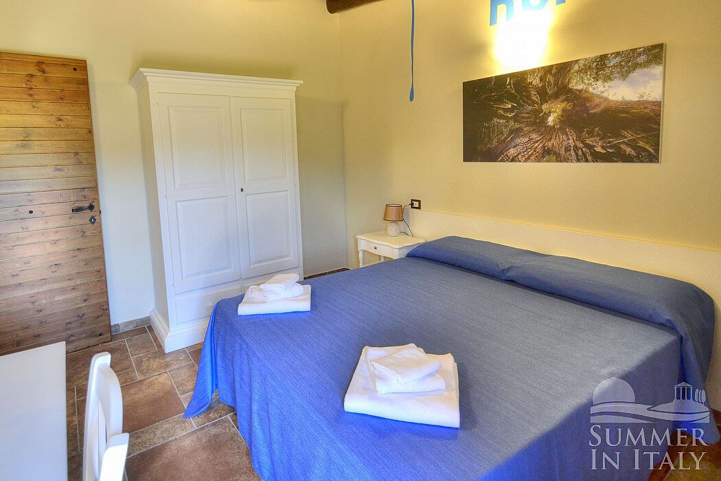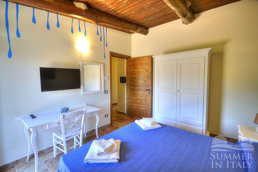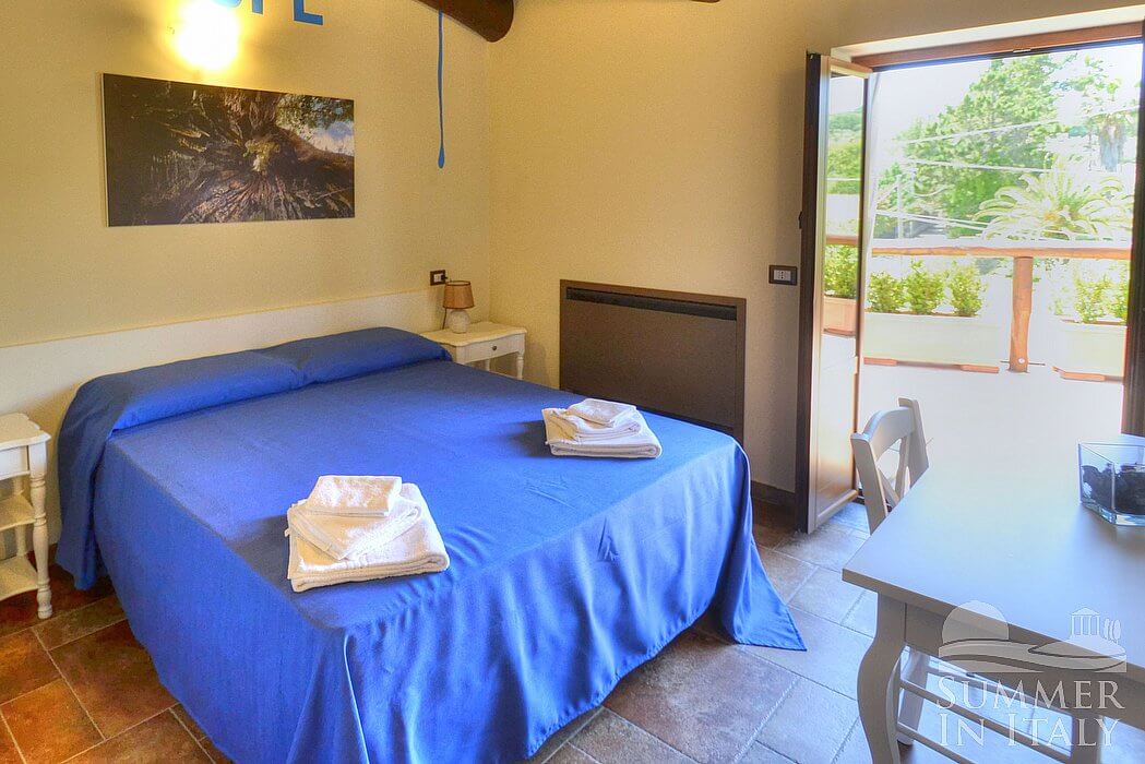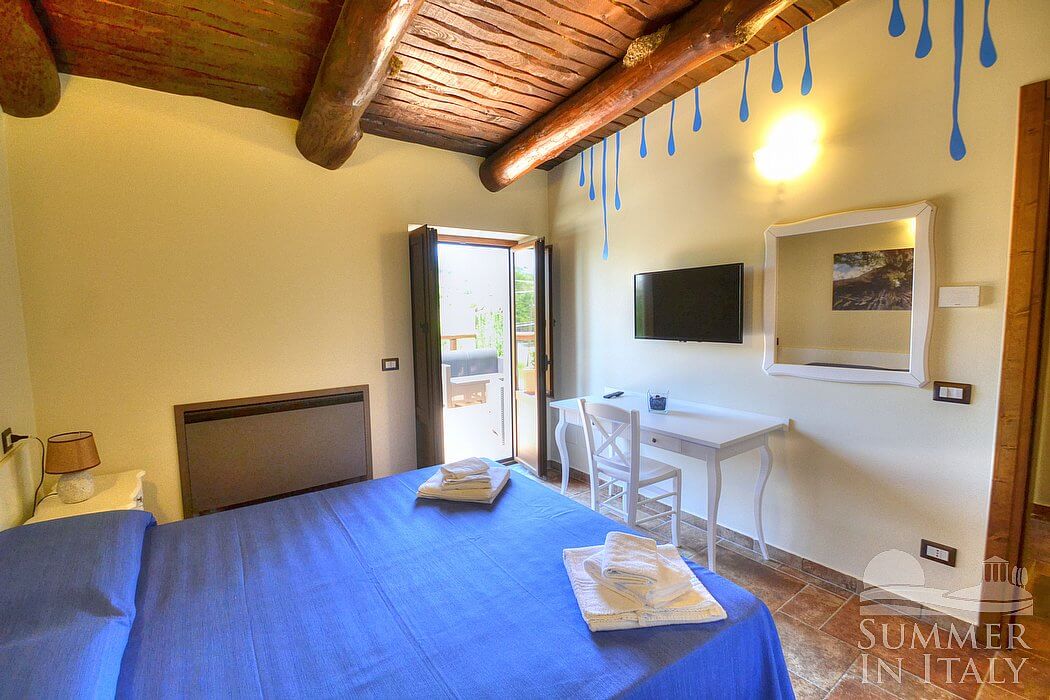 You will be able to enter the first bedroom through a corridor. The bedroom has a matrimonial bed (160 cm/63 inches, wider than a queen-size bed). The furnishings include a desk. In this room you will find a smart TV. From the bedroom you will be able to enter the second terrace through a French door. The bedroom is equipped with an air conditioning/heating unit.