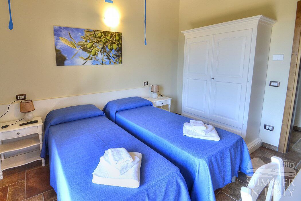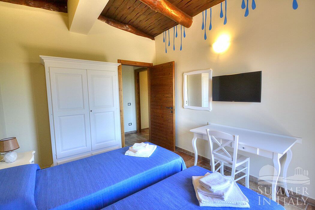 You will be able to enter the second bedroom through a corridor. It has two twin beds (80 cm/32 inches). The furnishings include a desk. In this room you will find a smart TV. From the bedroom you will be able to enter the third terrace through a French door. The bedroom is equipped with an air conditioning/heating unit.