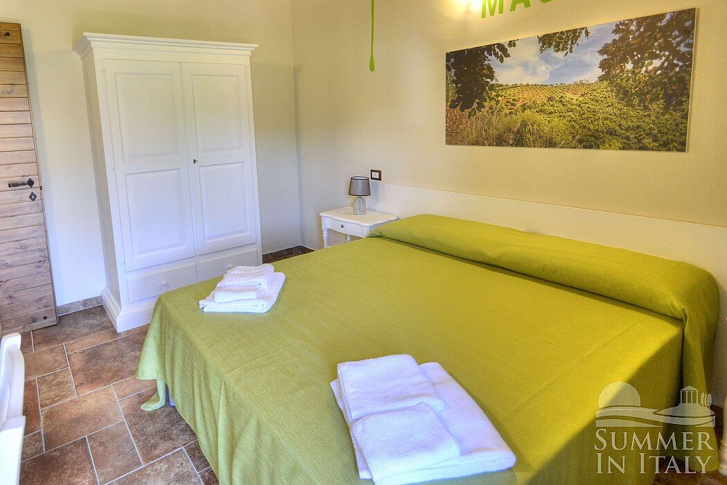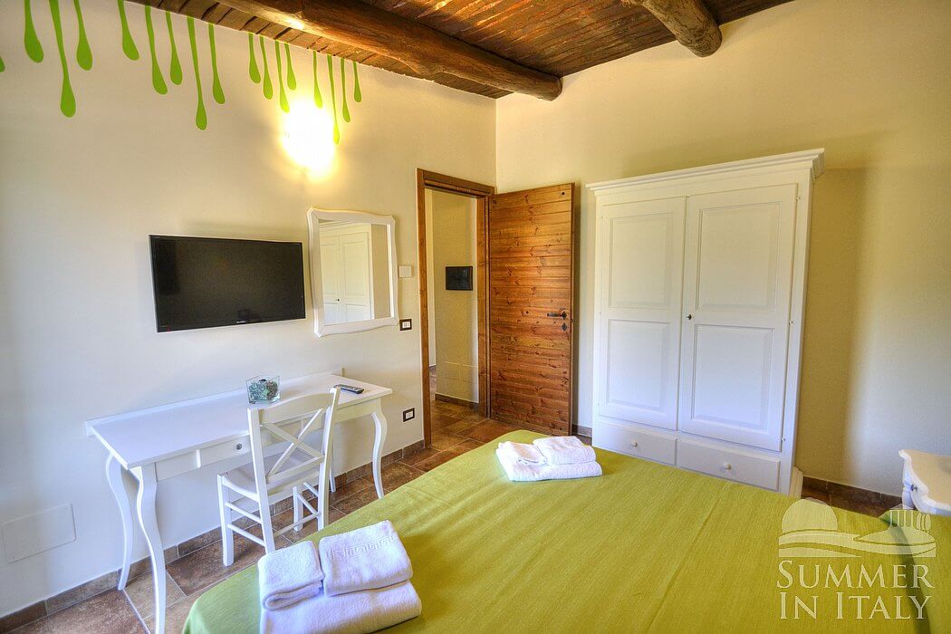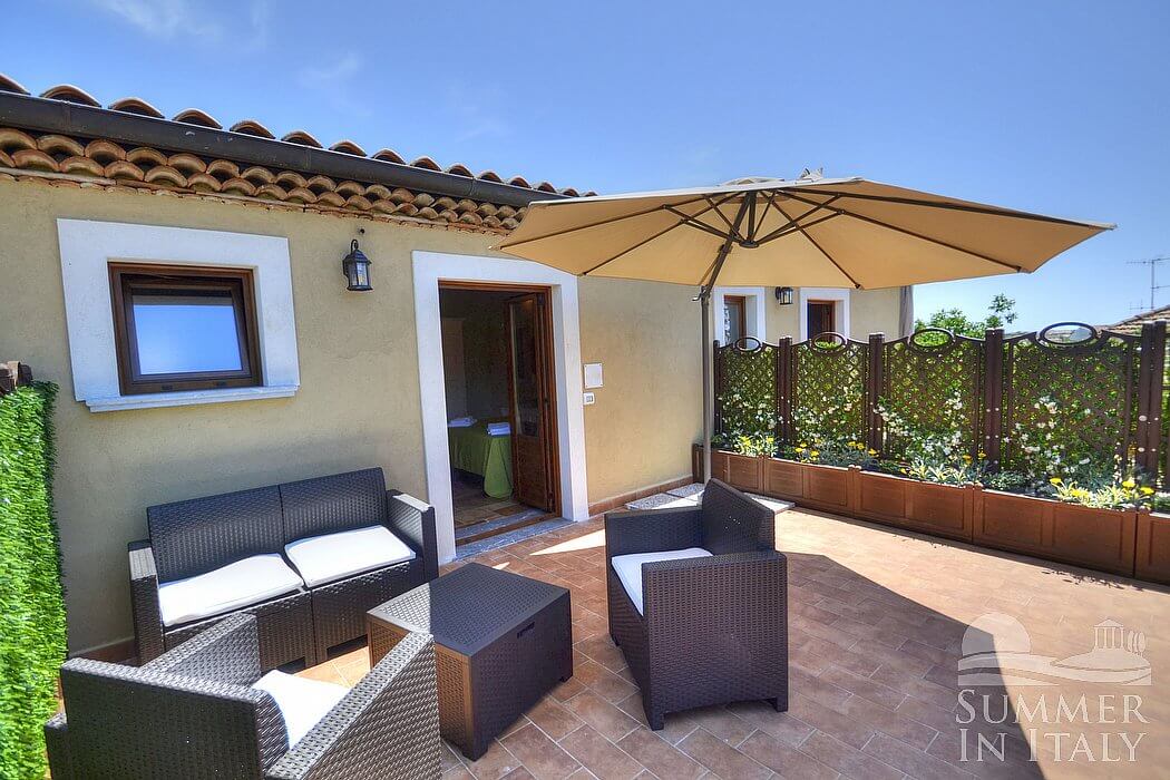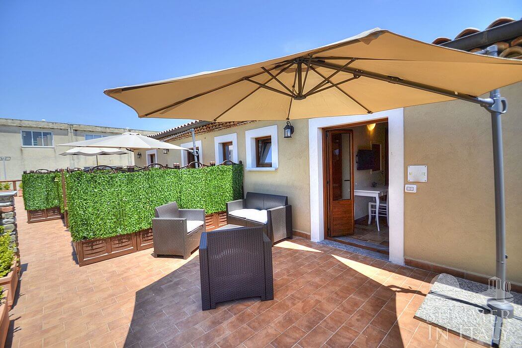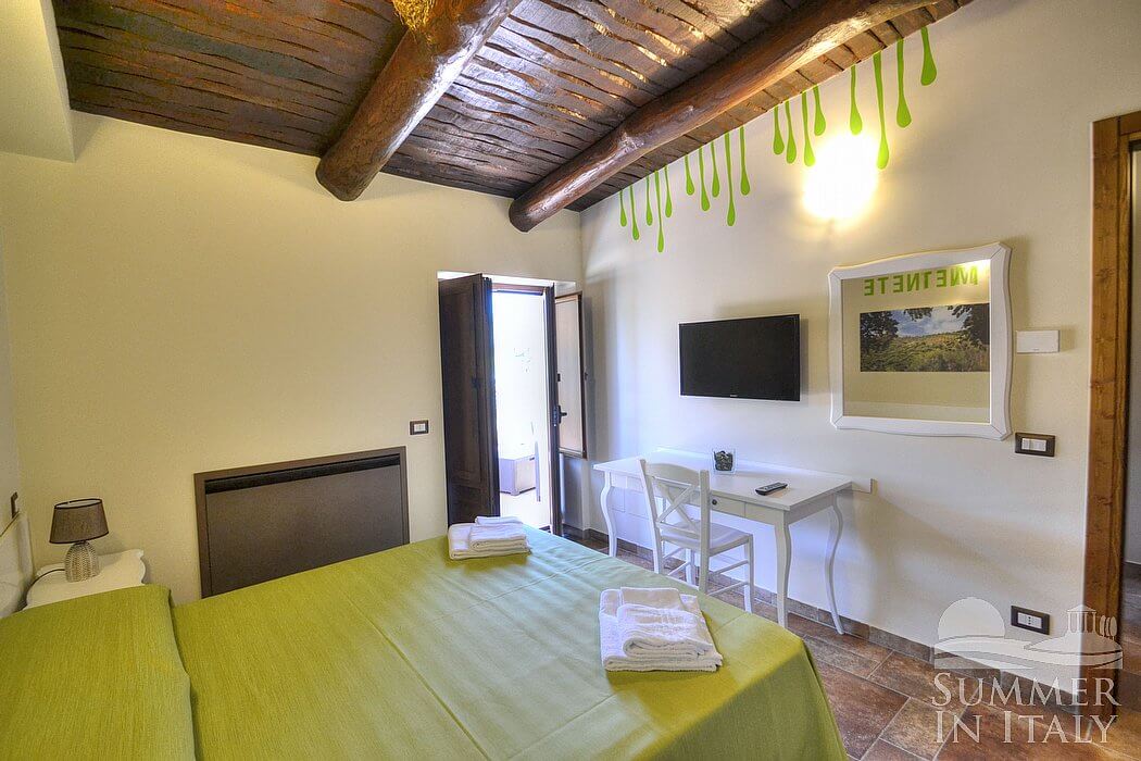 You will be able to enter the first bedroom through a corridor. The bedroom has a matrimonial bed (160 cm/63 inches, wider than a queen-size bed). The furnishings include a desk. In this room you will find a smart TV. From the bedroom you will be able to enter the second terrace through a French door. The bedroom is equipped with an air conditioning/heating unit.