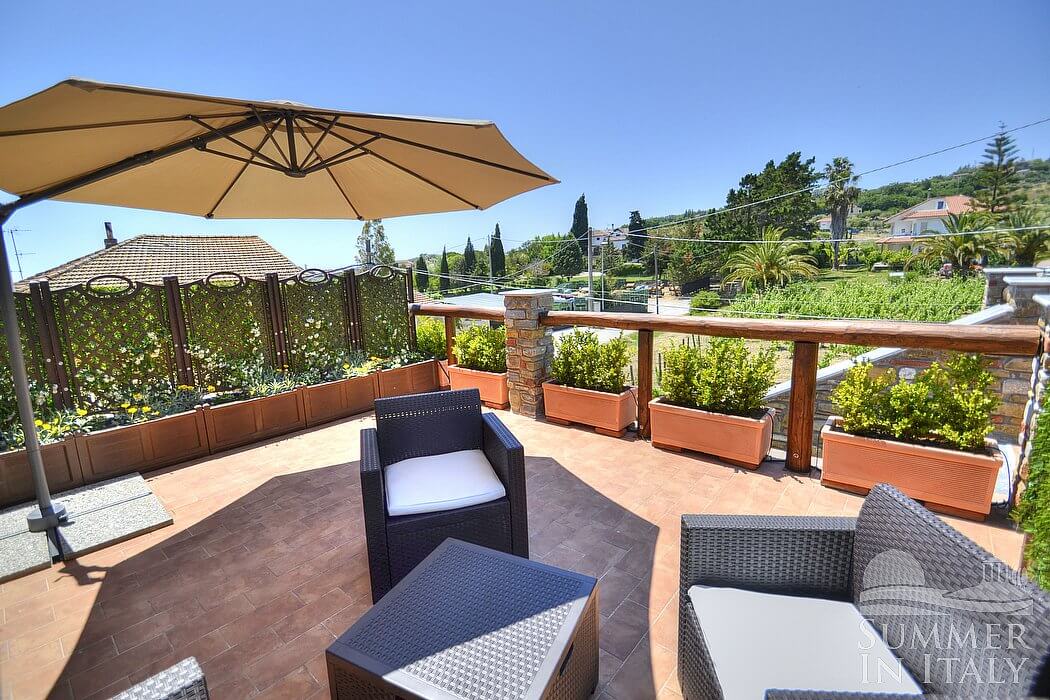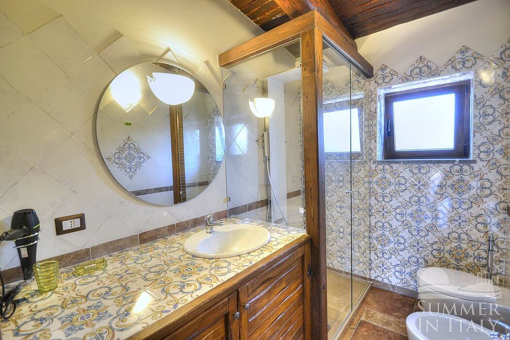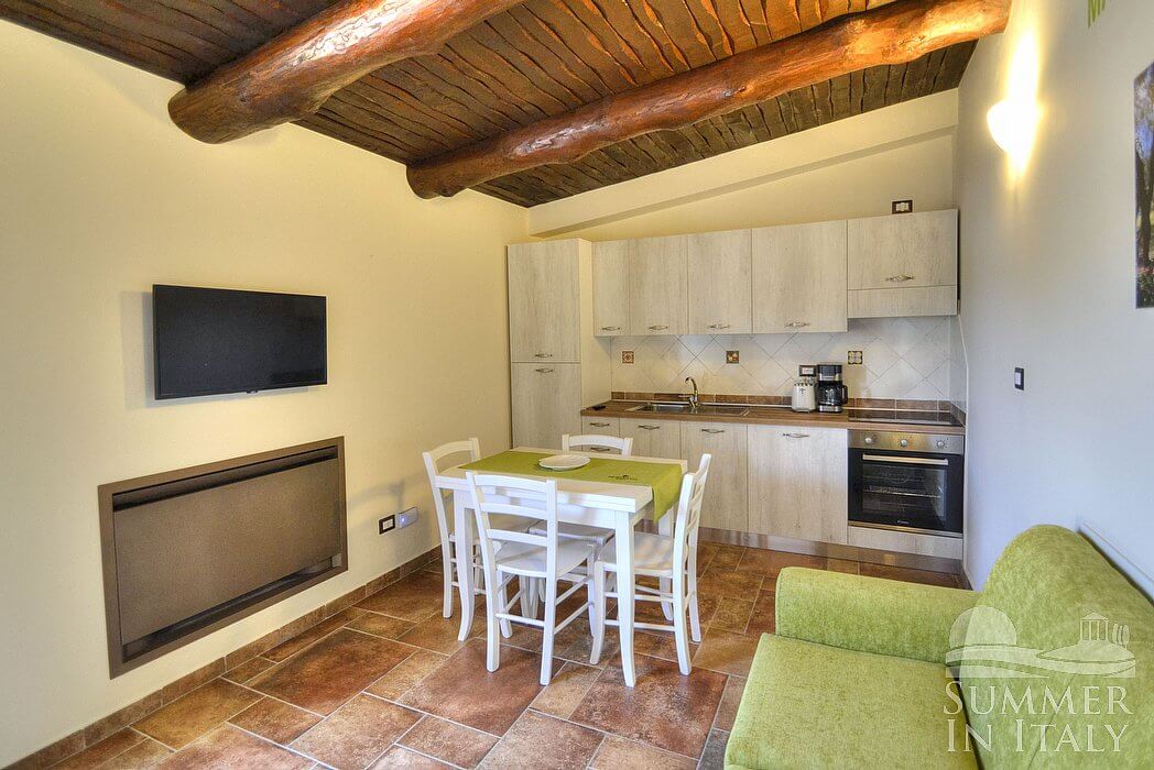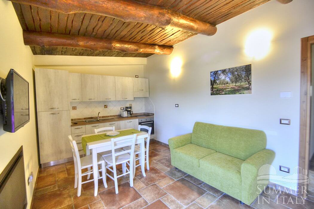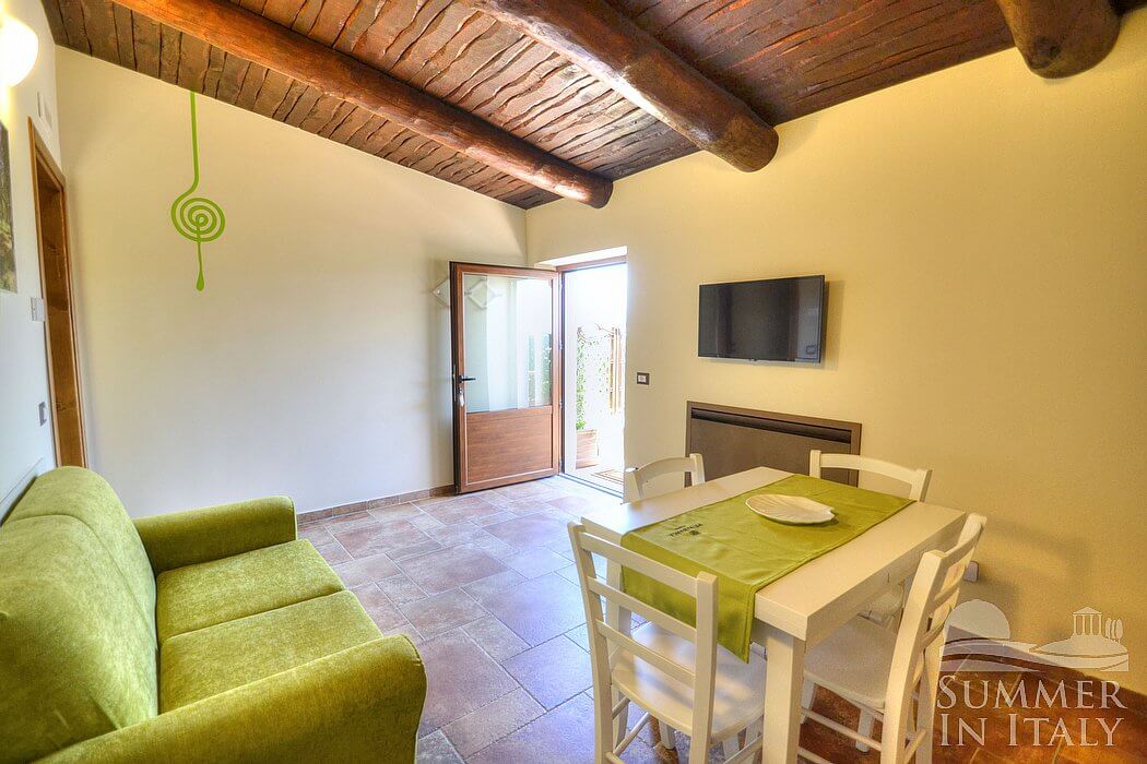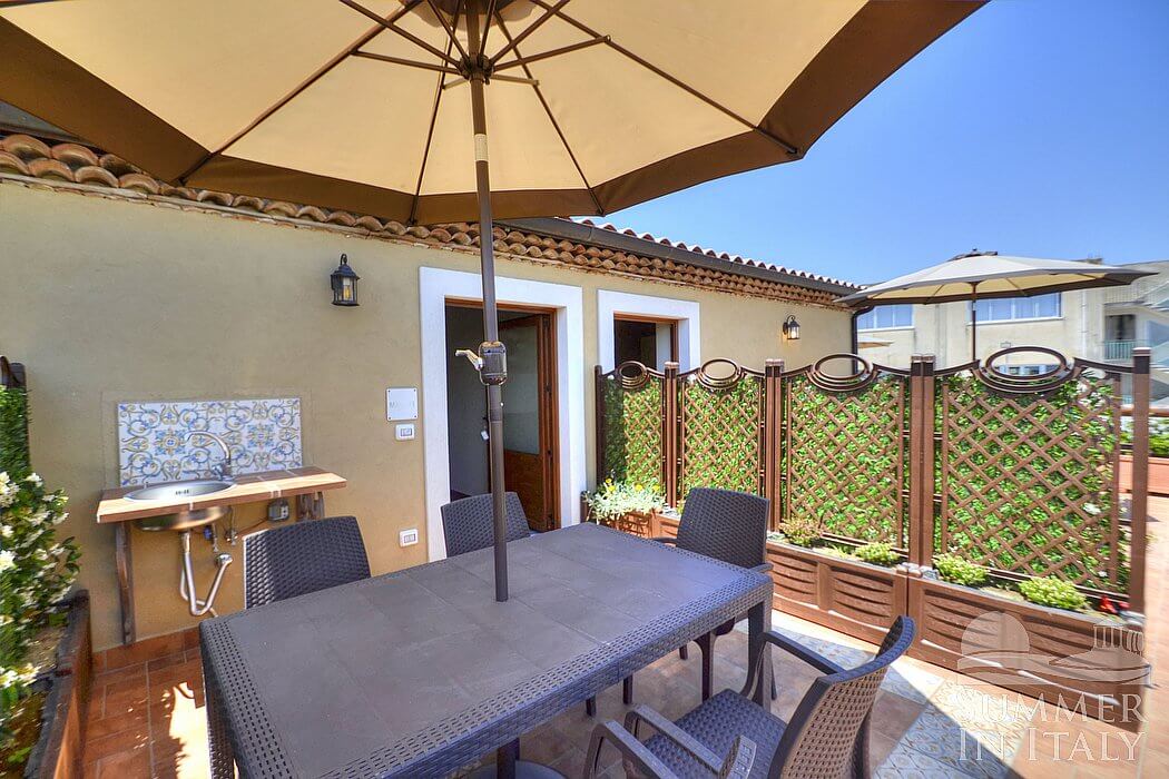 The kitchen is paved with terracotta tiles. The ceiling is made of wood. It is equipped with a four-burner induction cooker, an electric oven, a refrigerator with freezer, a dishwasher, an Italian-style coffee-maker, an American-style coffee-maker (bring your filters!) and a kettle. The dining table can accommodate four guests. The furnishings of the kitchen include a divan bed for one guest. The kitchen is also equipped with a smart TV. From the kitchen a French door will take you to the first terrace. The kitchen is equipped with an air conditioning/heating unit.