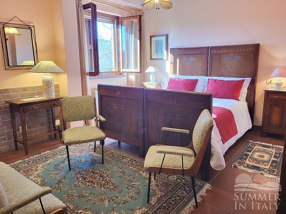 You will be able to enter the living room from the garden through an external access. The floor is paved with terracotta tiles. The ceiling has characteristic exposed wood beams and terracotta tiles. The furnishings are warm and welcoming, and include two sofas and an armchair. There is a big and age-old fireplace made of stone. The living room is shared with the other guests staying at the complex.