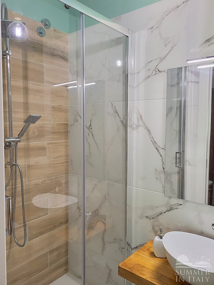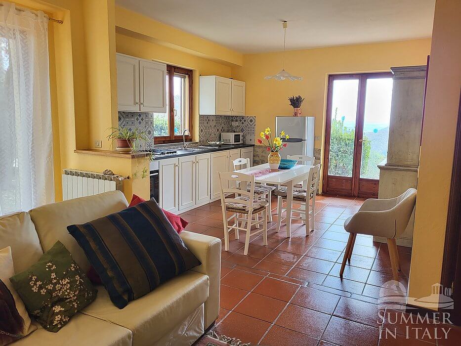The living room is paved with terracotta tiles. The furnishings are warm and welcoming, and include an armchair and a divan that unfolds into a double bed (available upon request with an additional cost -- please contact our staff in advance). There is a nice fireplace, for decorative purposes only. In the living room you will also find a cooking area. The kitchenette is equipped with a four-burner gas cooker, an electric oven, a refrigerator with freezer, a dishwasher, an Italian-style coffee-maker and a kettle. The dining table can accommodate six guests. From the living room you will be able to enter the garden through a French door. The room also has a window.