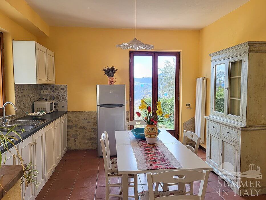 The swimming pool is 7 meters (23 feet) large by 14 meters (46 feet) long, from 90 centimeters (2.9 feet) to 1.4 meters (4.6 feet) deep. The area is equipped with tables, chairs, sun umbrellas, sun loungers and an external shower, and it is partly shaded by awnings. From the swimming pool you will enjoy a lovely view of the greenery and of Monte Santa Maria Tiberina. You will share the pool with guests staying at 7 other apartments. The swimming pool is open from mid-May until the end of September.