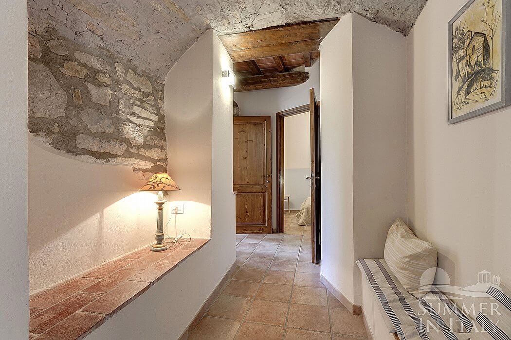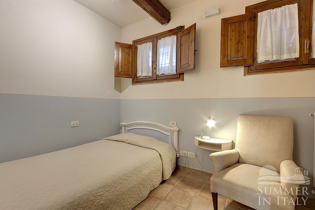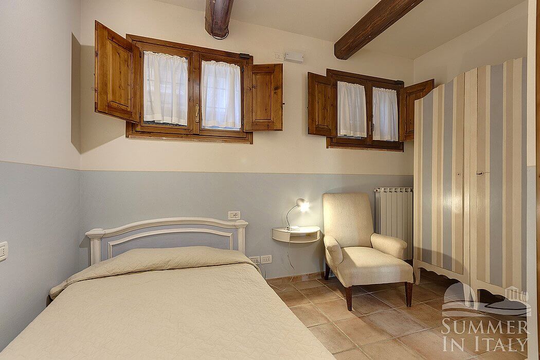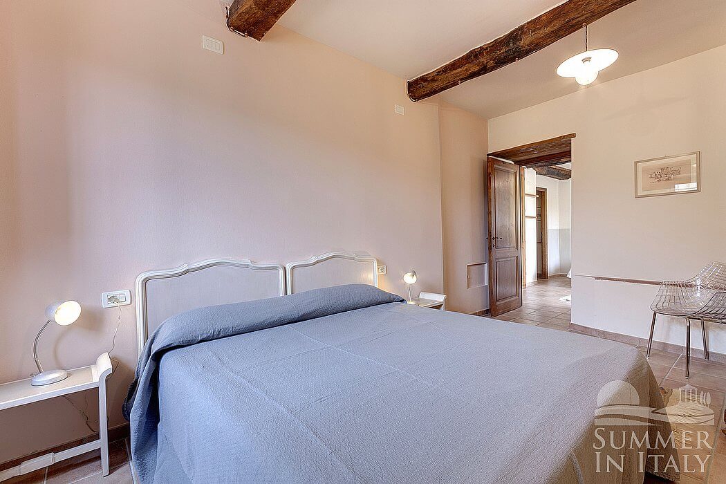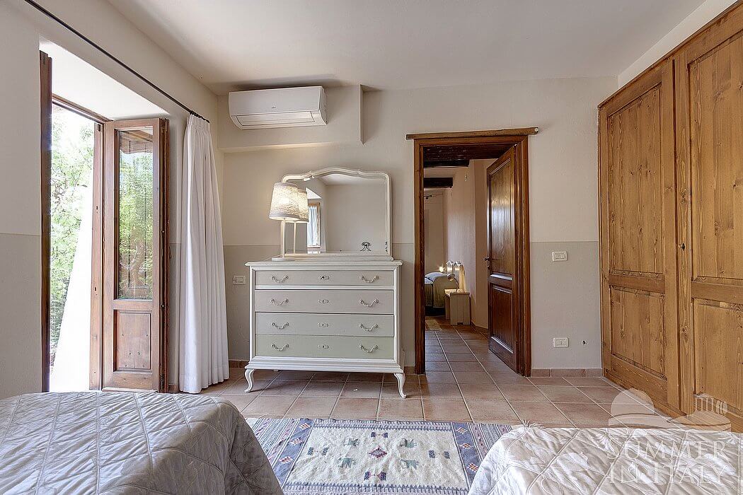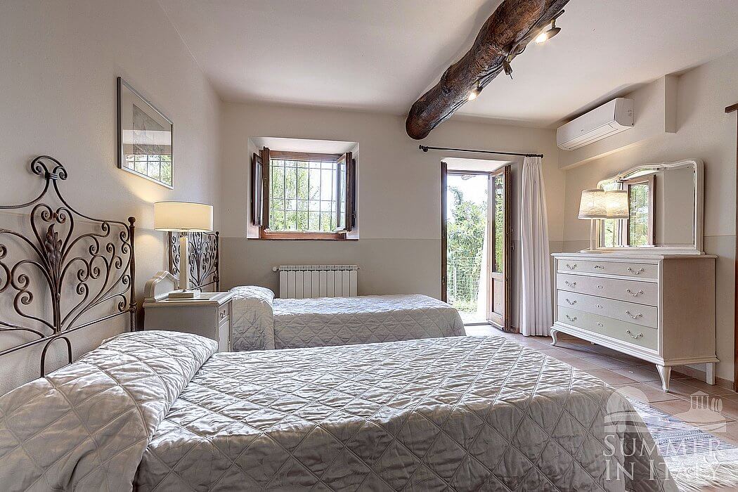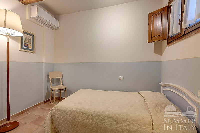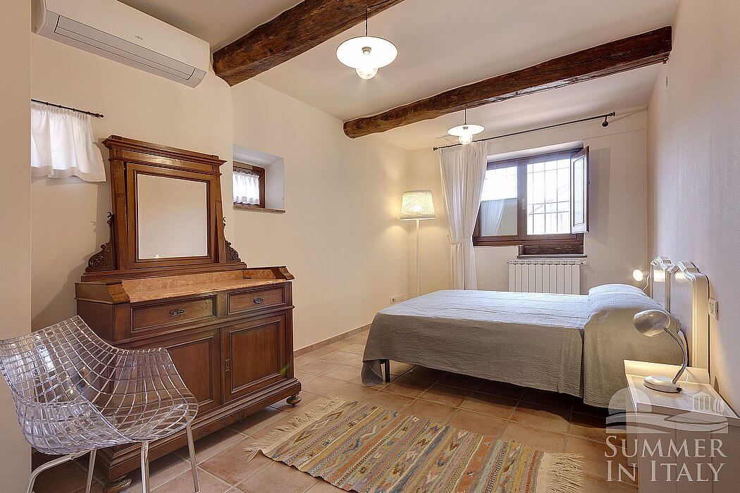 You will be able to enter the second bedroom from the first bedroom. The ceiling has characteristic exposed wood beams and terracotta tiles. The room has a matrimonial bed (160 cm/63 inches, wider than a queen-size bed). The room also has two small high windows, as well as a window with a view of the greenery and of the hills. The bedroom is equipped with an air conditioning/heating unit.