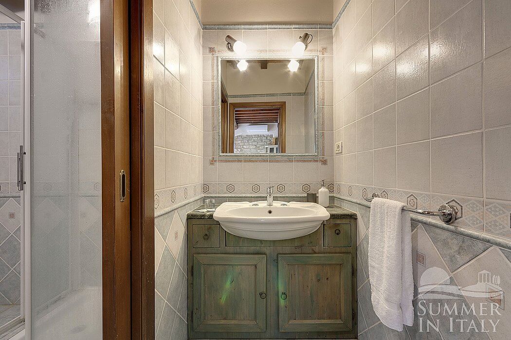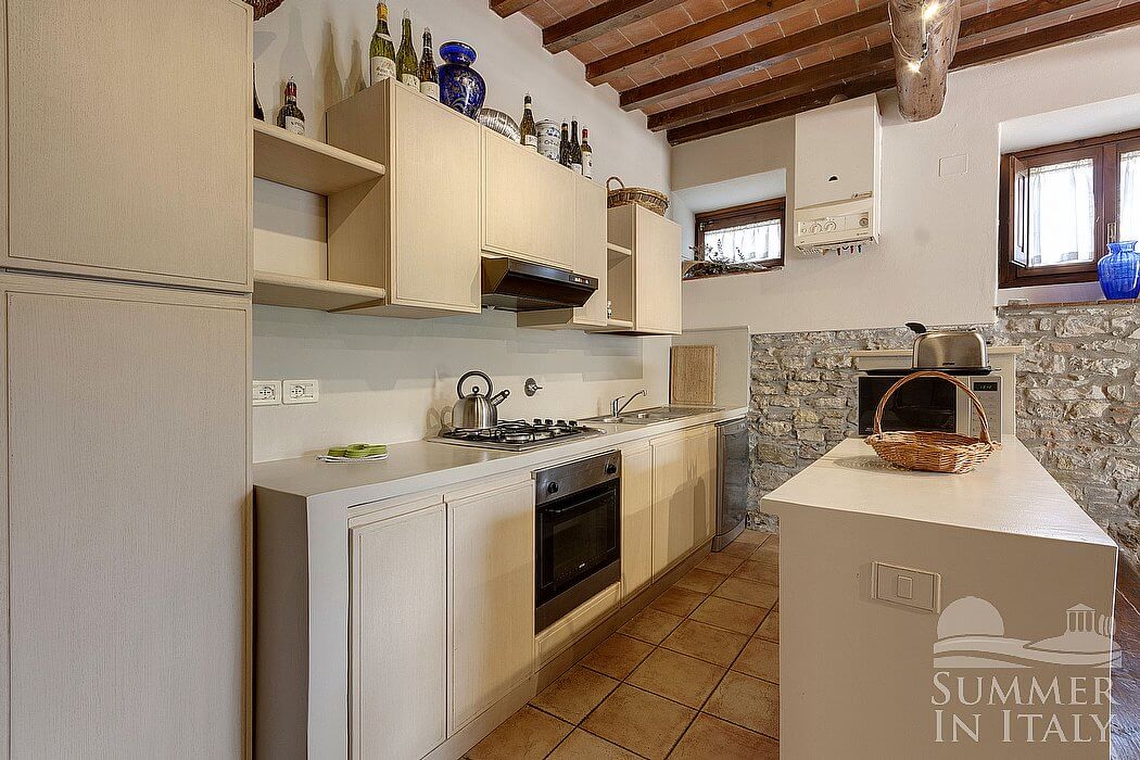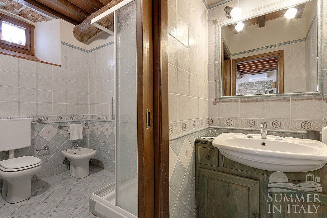 The living room is paved with Tuscan terracotta tiles. The ceiling is sloped and has characteristic exposed wood beams and terracotta tiles. The furnishings are rural and characteristic of the Tuscan house. The furnishings include two armchairs and a divan that unfolds into a double bed. There is an age-old fireplace made of stone, for decorative purposes only. In the living room you will also find a cooking area. The kitchenette is equipped with a four-burner gas cooker, an electric oven, a refrigerator with freezer, a dishwasher, an Italian-style coffee-maker and a toaster. The dining table can accommodate six guests. In this room you will find a television (local channels). The room has two windows with a view of the greenery and of the hills. It is equipped with an air conditioning/heating unit.