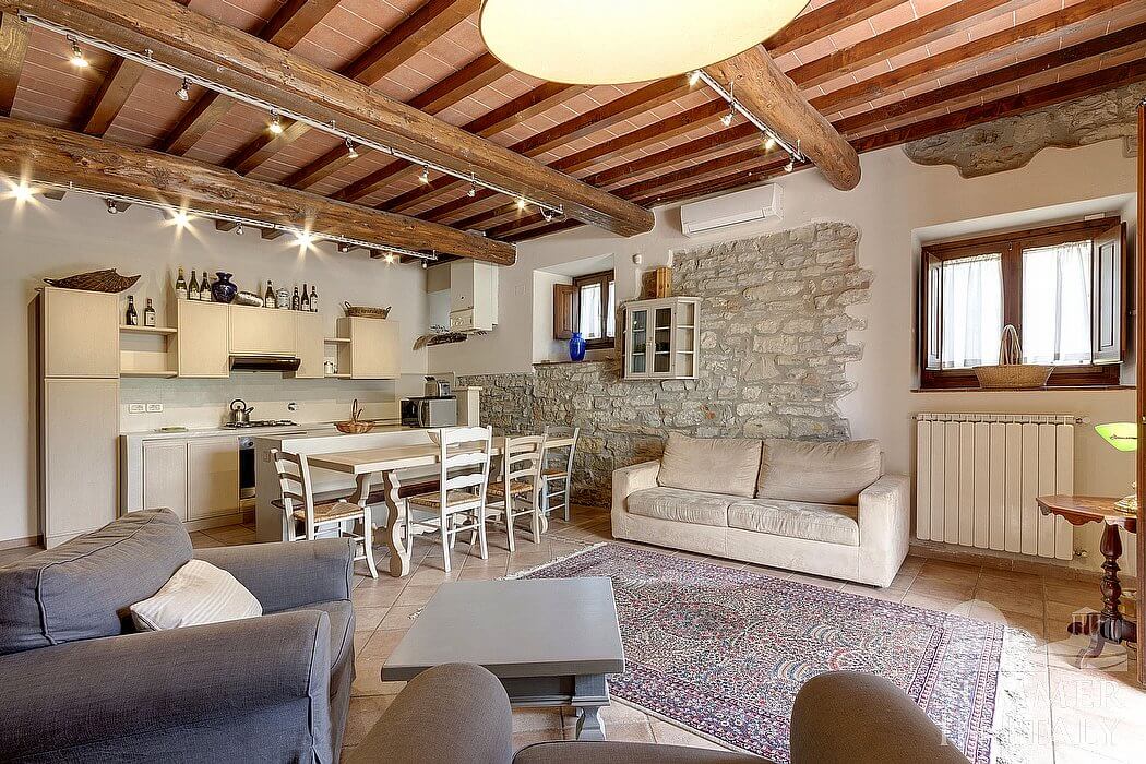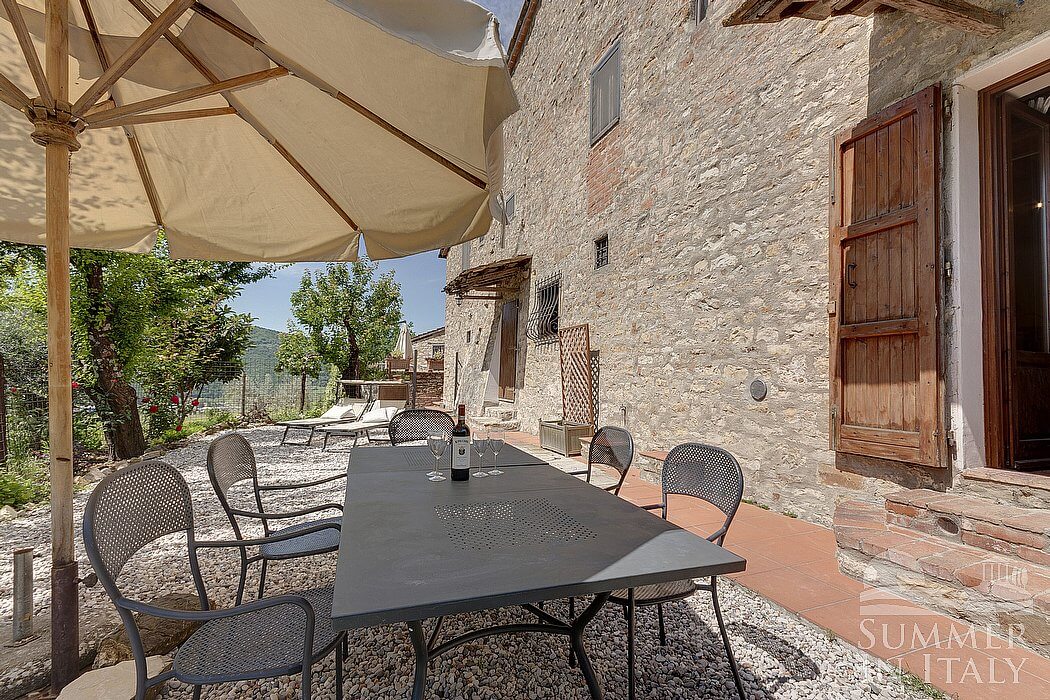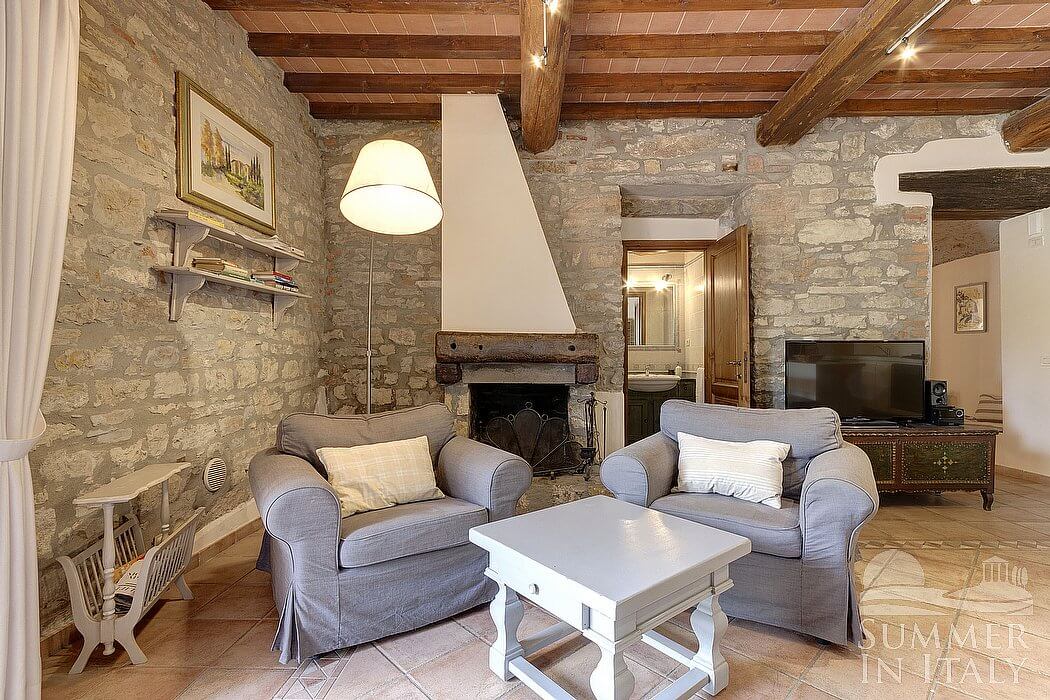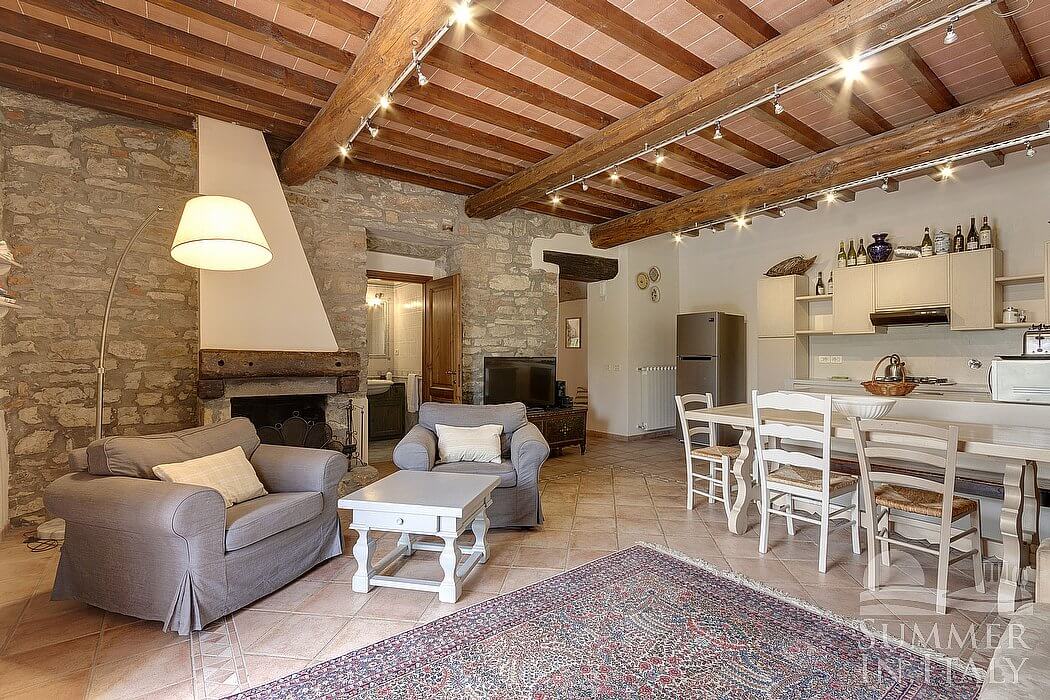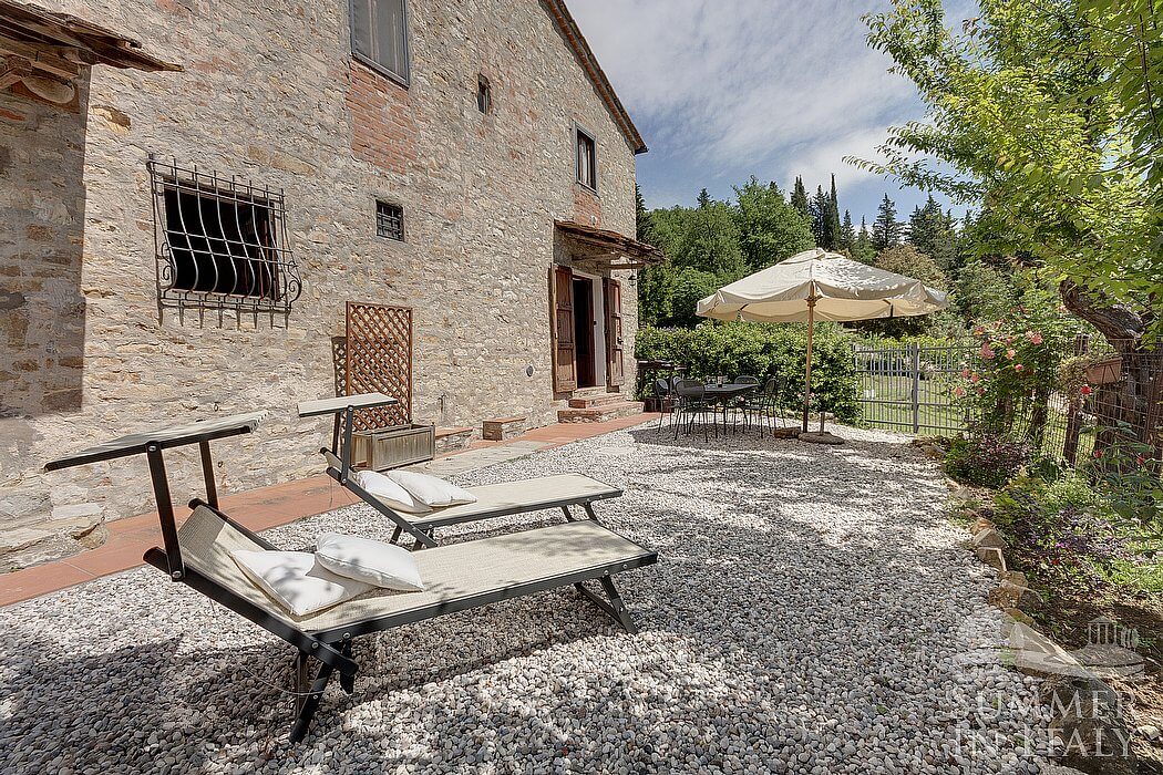 The complex has been obtained from an age-old farm house made of stone which is located in the hills of the Chianti Fiorentino, the Northern part of the Chianti area. In the complex you will find six holiday houses, attached one to each other. Each house features a direct access from the garden, with a reserved patio or terrace. All around the complex, you will enjoy a 360 degree view of the green hills where you can discern ordered lines of vineyards, or large areas covered with olive groves and towering cypress trees.