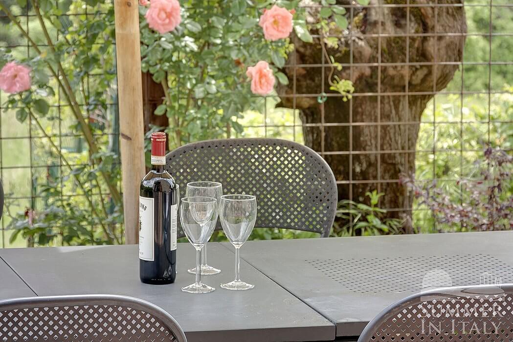 The garden is 5000 square meters (54000 square feet) large. It is partly shaded by ancient olive trees and by tall cypresses. The garden is equipped with wood sofas, as well as with chairs and an hammock. Here you will be able to have fun with a ping pong table and a football table. Here you will also find a barbecue. From the garden you will enjoy an enchanting view of the Tuscan hills and of the vineyards. You will share the garden with the other guests staying at the complex.