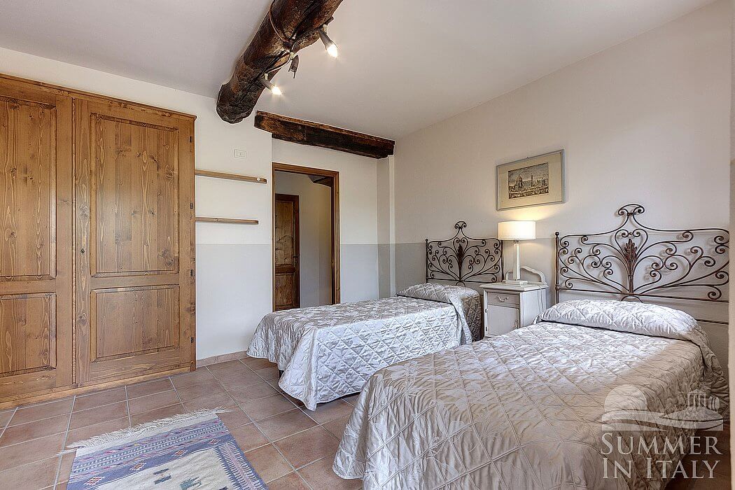 Important notice: members of your party will need to walk through this bedroom to reach the second bedroom. The first bedroom is paved with Tuscan terracotta tiles. The furnishings are cozy and comfortable. It has two twin beds (80 cm/32 inches). In this room you will find a CD player with FM radio. From the bedroom you will be able to enter the patio with a view of the hills through a French door. The bedroom is equipped with an air conditioning/heating unit.