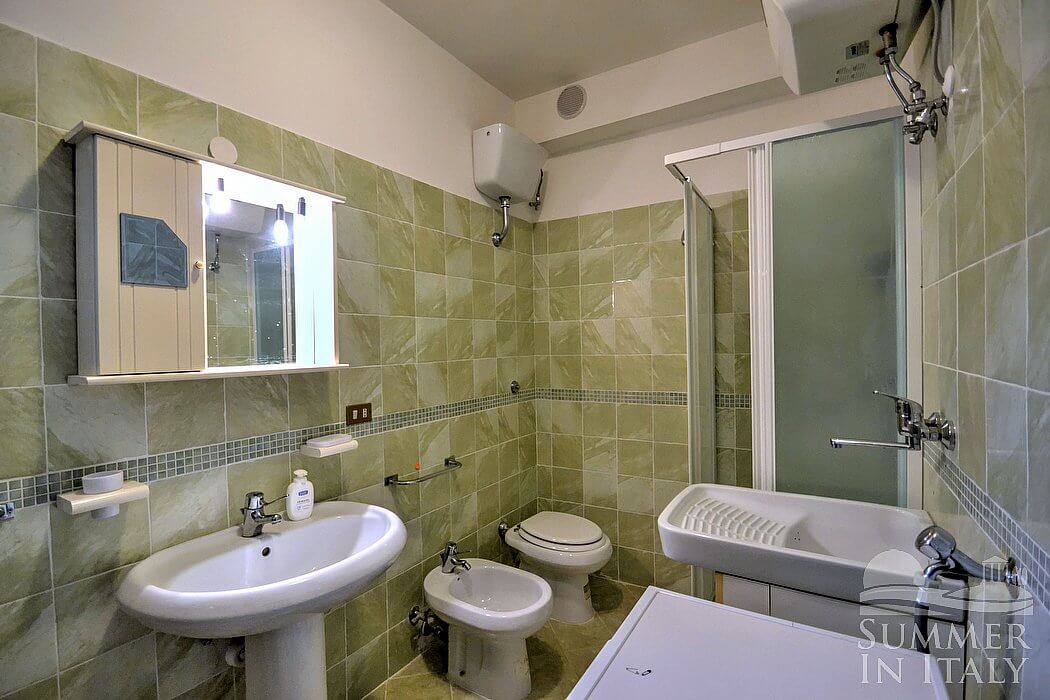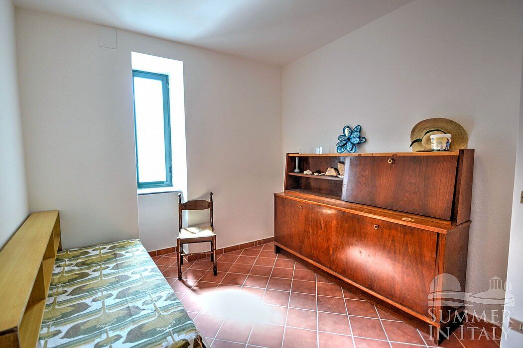 The living room is paved with terracotta tiles. The furnishings are simple and comfortable, and include three armchairs. There is a practical fireplace. In the living room you will also find a cooking area. The kitchenette is equipped with a four-burner gas cooker, an electric oven, a refrigerator with freezer and an Italian-style coffee-maker. The two dining tables can accommodate six guests. In this room you will find a television (local channels). The room has a window.