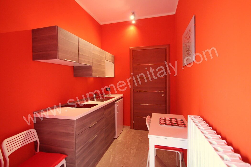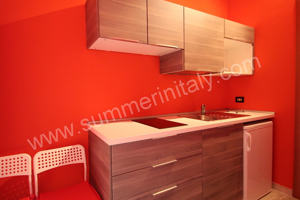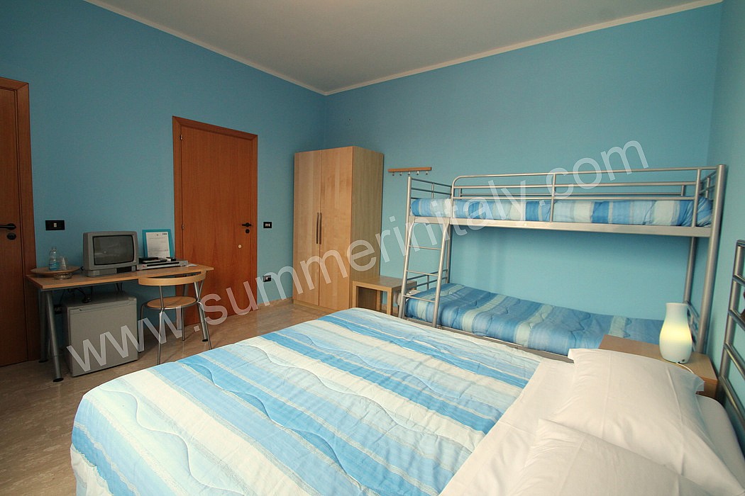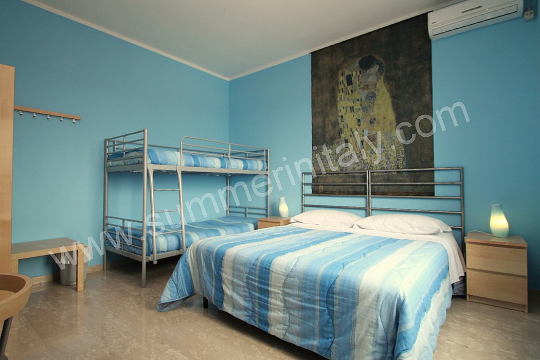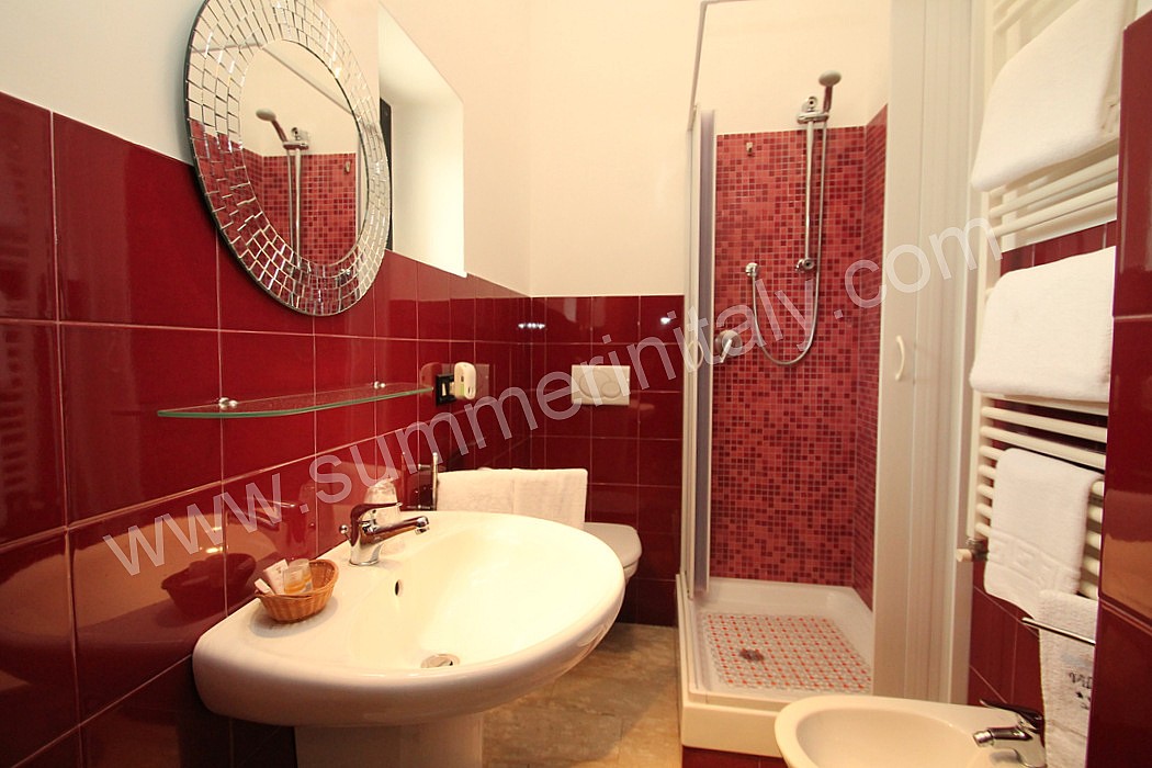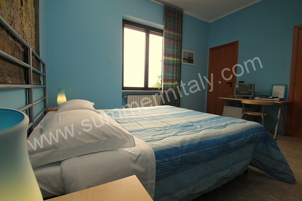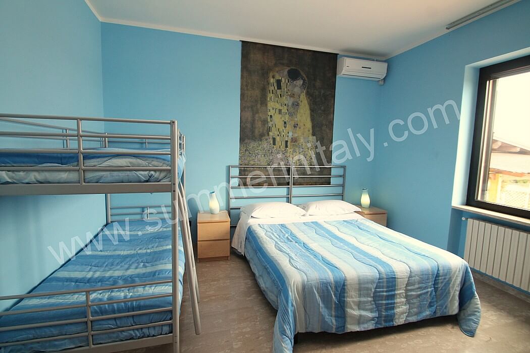 You will be able to enter the bedroom from the kitchen. The bedroom has a wrought iron matrimonial bed (160 cm/62 inches, wider than a queen-size bed) and a wrought iron bunk bed (two single beds, one on top of the other). The furnishings include a desk. In this room you will find a television (local channels). The room has a double-glazed window with a view of the swimming pool. The bedroom is equipped with an air conditioning/heating unit. Here you will also find a mini refrigerator. This bedroom has an en-suite bathroom, tiled with lucid red majolica tiles and equipped with a washbasin, a toilet, a fully enclosed shower and a hairdryer.