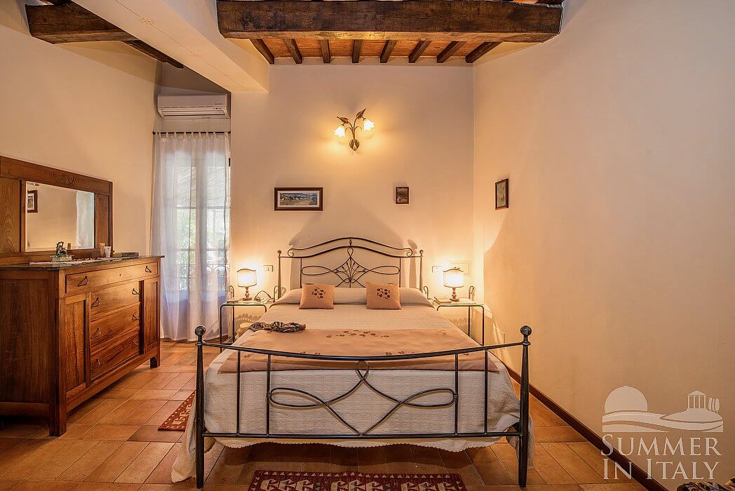 The living room is paved with terracotta tiles. The ceiling is sloped and has characteristic exposed wood beams and terracotta tiles. The furnishings are simple and comfortable. The furnishings include a divan that unfolds into a double bed. In the living room you will also find a cooking area. The kitchenette is equipped with a four-burner gas cooker, an electric oven, a refrigerator with freezer, a dishwasher, a microwave oven, an Italian-style coffee-maker, an American-style coffee-maker (bring your filters!) and a kettle. The dining table can accommodate four guests. In this room you will find a television (local channels). From the living room you will be able to enter the patio through a French door. The room also has a window. It is equipped with an air conditioning/heating unit. Here you will also find a safe and a telephone.