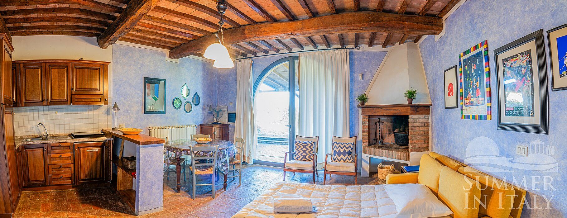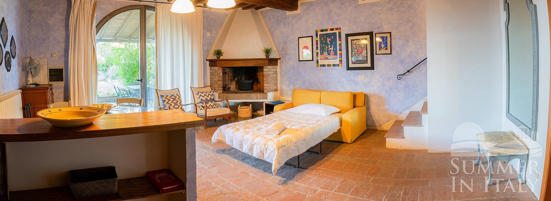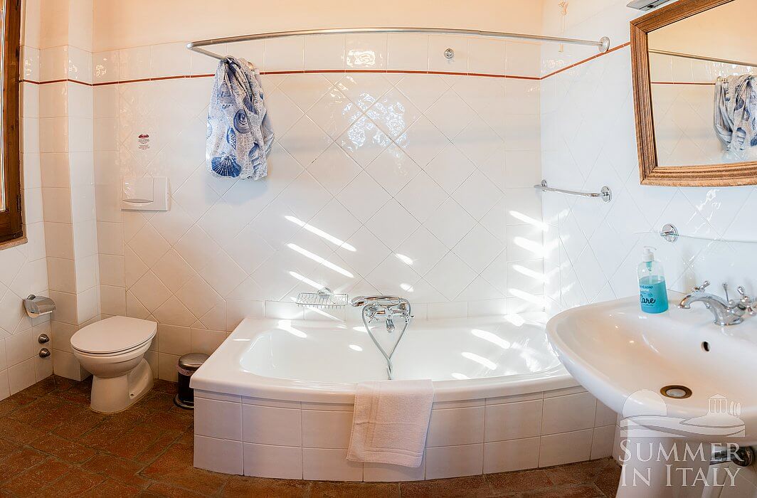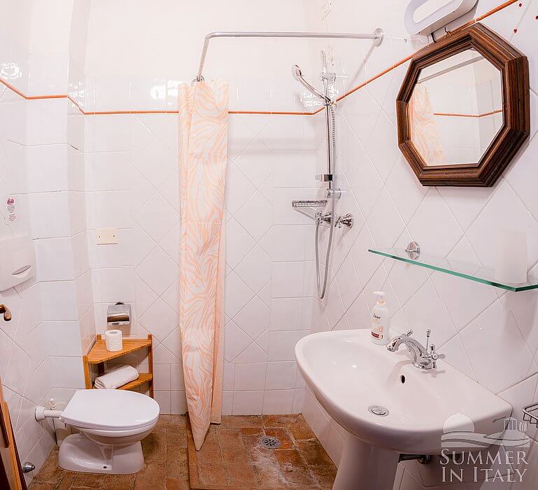 The furnishings of the living room are cozy and comfortable, and include a divan bed for one guest. There is a nice fireplace made of bricks. In the living room you will also find a cooking area. The kitchenette is equipped with a four-burner gas cooker, a refrigerator with freezer, a dishwasher and an Italian-style coffee-maker. The dining table can accommodate five guests. In this room you will find a satellite television (local channels). From the living room you will be able to enter the garden through a French door.