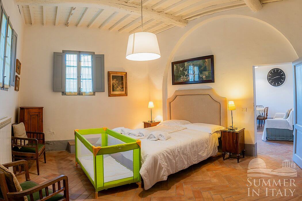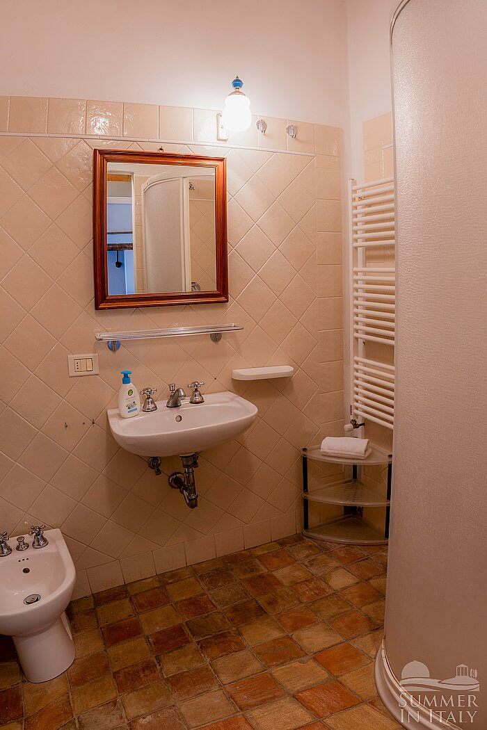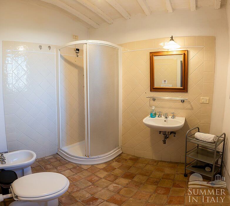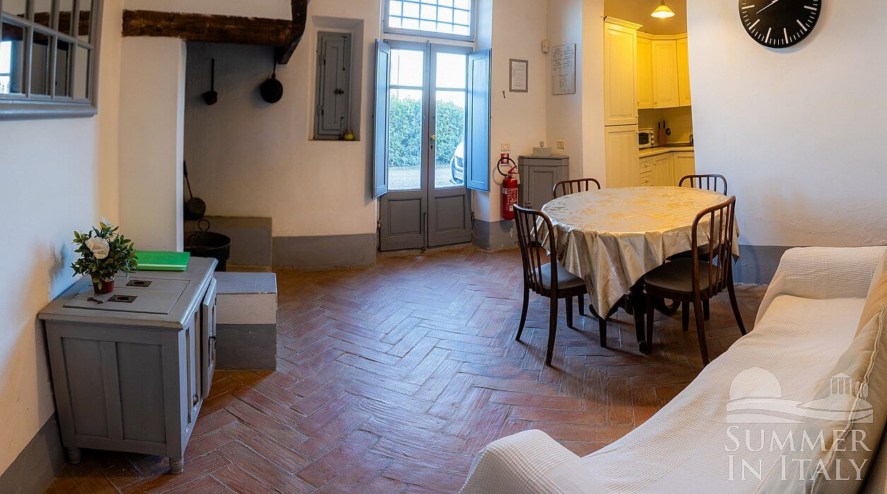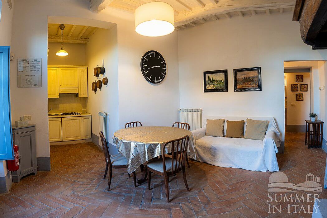 The living room is paved with ancient terracotta tiles. The ceiling has white exposed wood beams. The furnishings are cozy and comfortable, and include a sofa. There is a big and age-old fireplace. In the living room you will also find a cooking area. The kitchenette is equipped with a four-burner gas cooker, a refrigerator with freezer, a dishwasher and an Italian-style coffee-maker. The dining table can accommodate four guests. In this room you will find a satellite television (local channels).