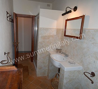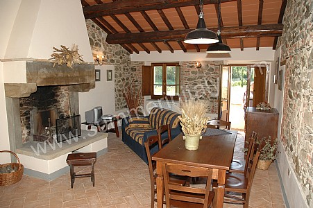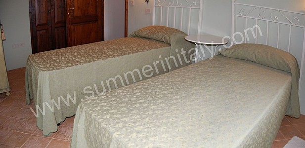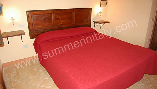 The living room is paved with terracotta tiles. The ceiling has characteristic exposed wood beams. The furnishings are simple and comfortable. The furnishings include a small sofa. There is a big fireplace made of stone. In the living room you will also find a cooking area. The kitchenette is equipped with a four-burner gas cooker, an electric oven, a refrigerator with freezer and an Italian-style coffee-maker. The dining table can accommodate four guests. In this room you will find a satellite television (local channels). The room has three windows.