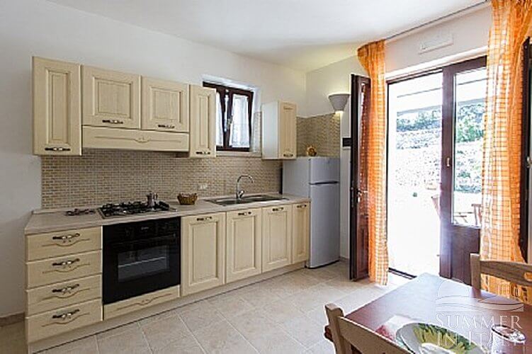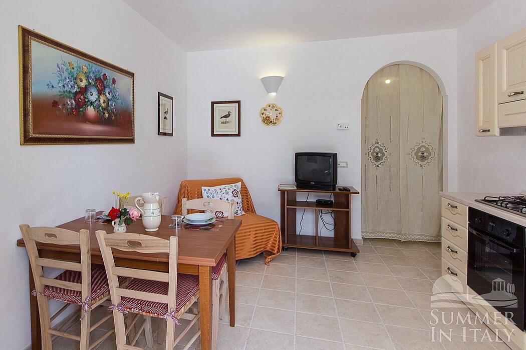 The furnishings of the living room are cozy and comfortable. The furnishings include a sofa. In the living room you will also find a cooking area. The kitchenette is equipped with a four-burner gas cooker, an electric oven, a refrigerator with freezer and an Italian-style coffee-maker. The dining table can accommodate three guests. In this room you will find a television (local channels).