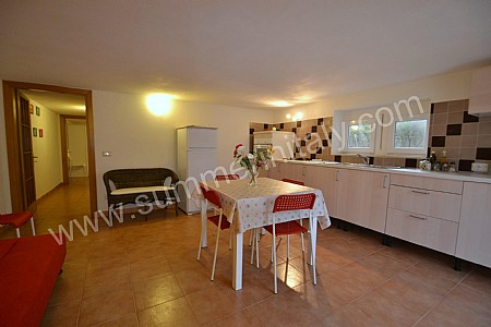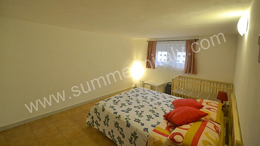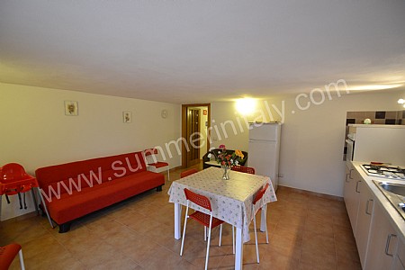 The furnishings of the living room are modern and welcoming. The furnishings include an armchair and a divan that unfolds into a double bed. The dining table can accommodate four guests. From the living room you will be able to enter the patio through a French door. The room has two double-glazed small windows with a view of the courtyard.