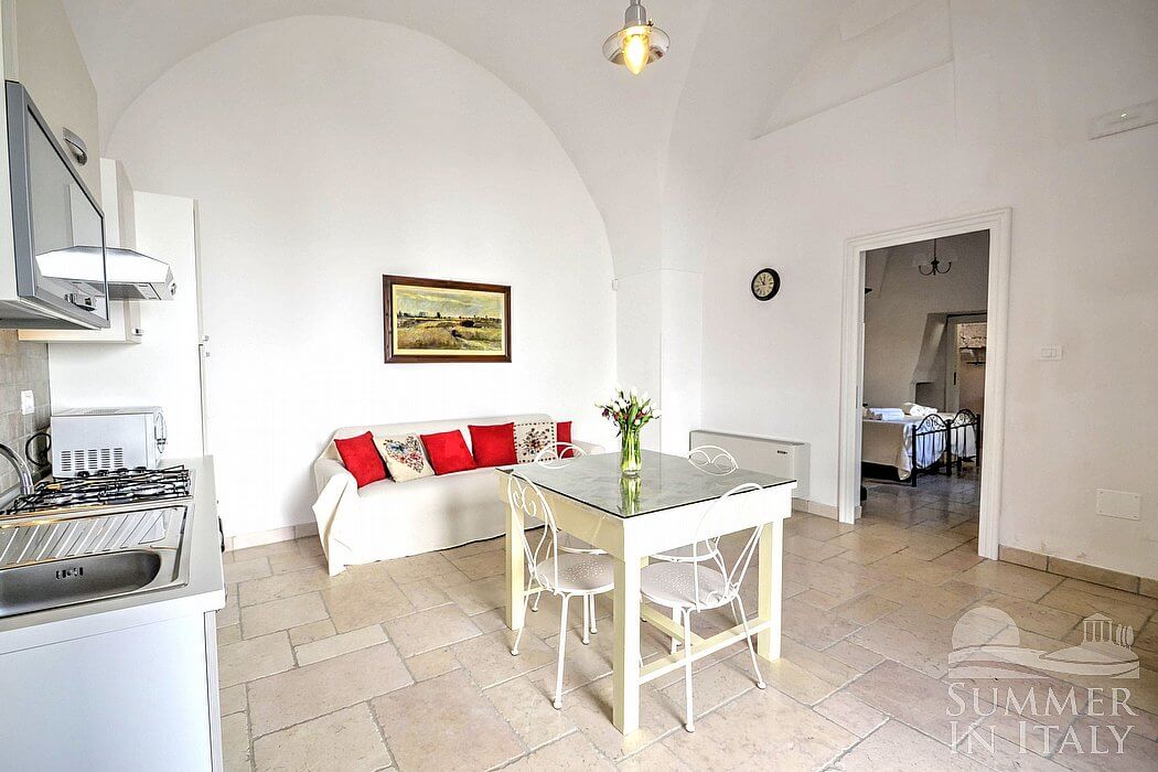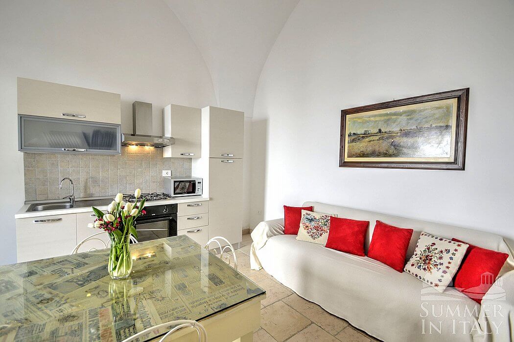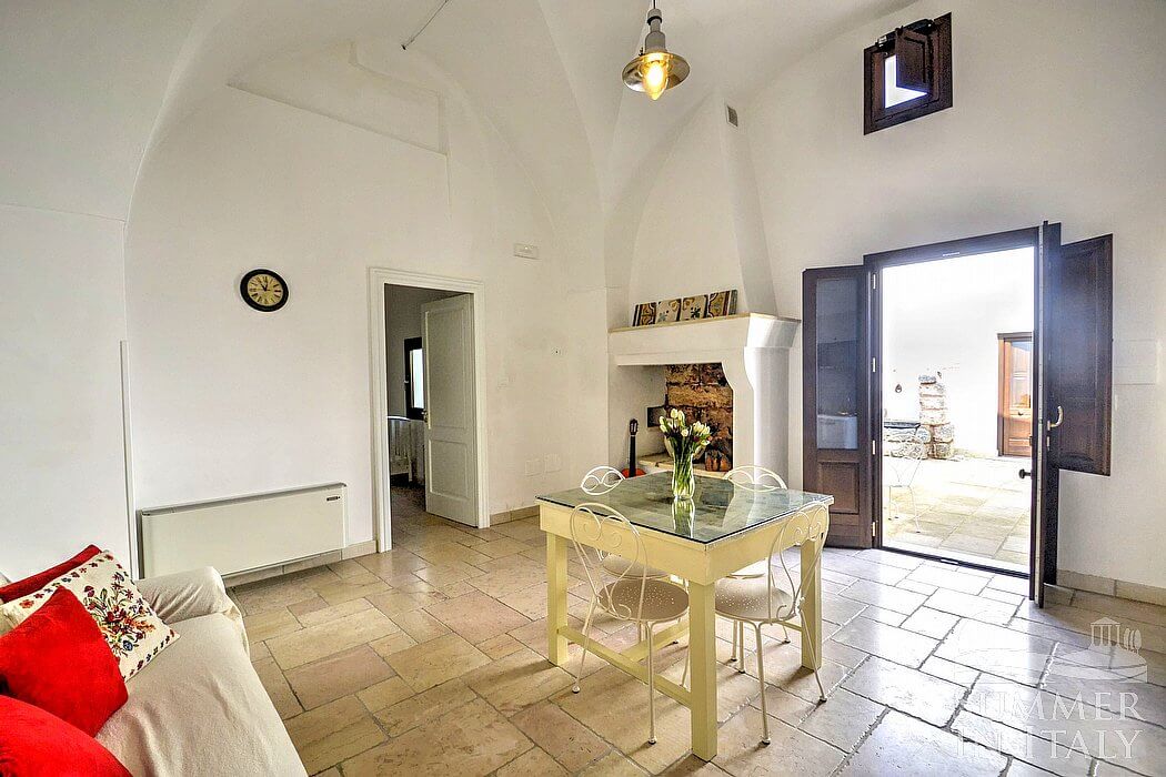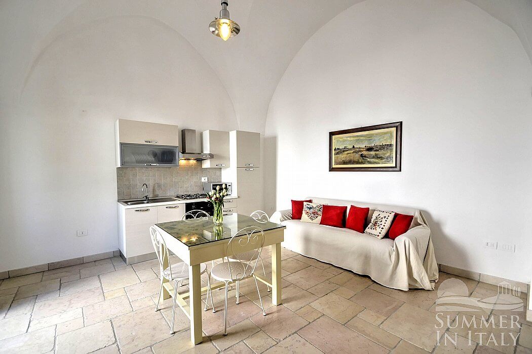 The living room is paved with characteristic stone tiles. The ceiling boasts a star vault. The furnishings are rural and characteristic of the house of Apulia. The furnishings include a divan bed for one guest. In this room an additional twin bed (80 cm/32 inches) is available (if requested in advance) to make it a double room. There is a big and age-old fireplace made of stone. In the living room you will also find a cooking area. The kitchenette is equipped with a four-burner gas cooker, an electric oven, a refrigerator with freezer, a microwave oven and an Italian-style coffee-maker. The dining table can accommodate four guests. The room has a small high window. It is equipped with an air conditioning/heating unit.