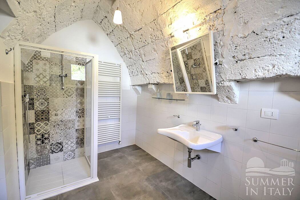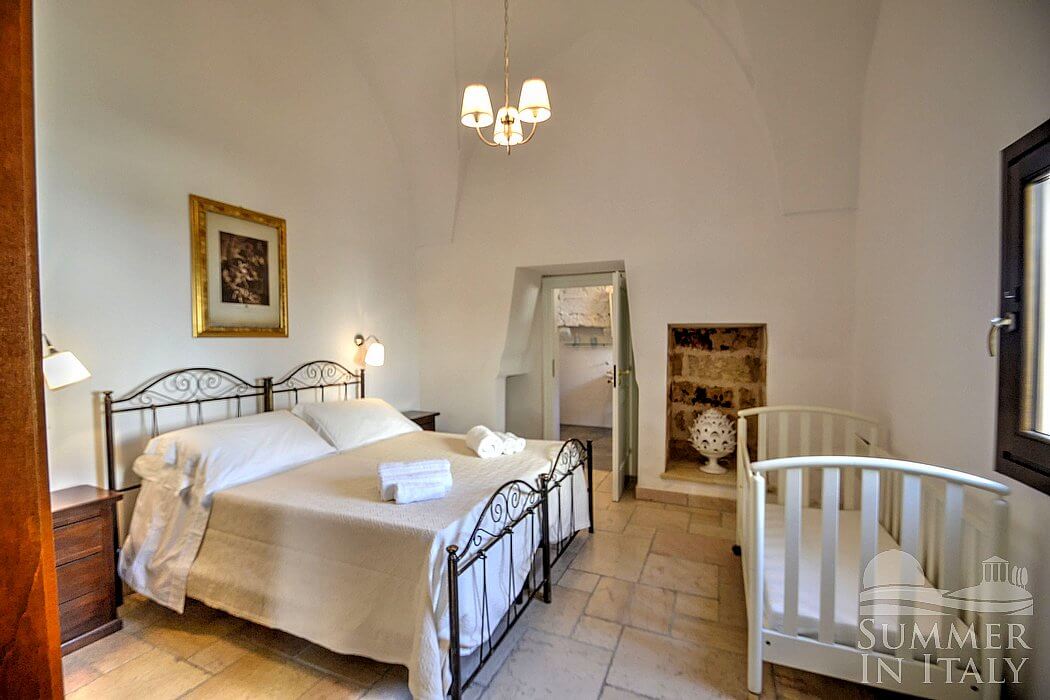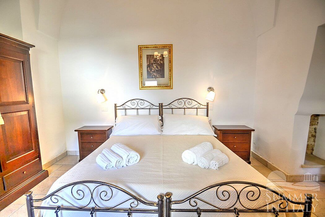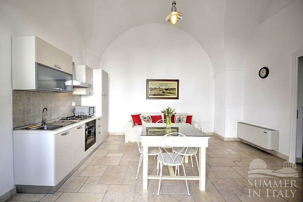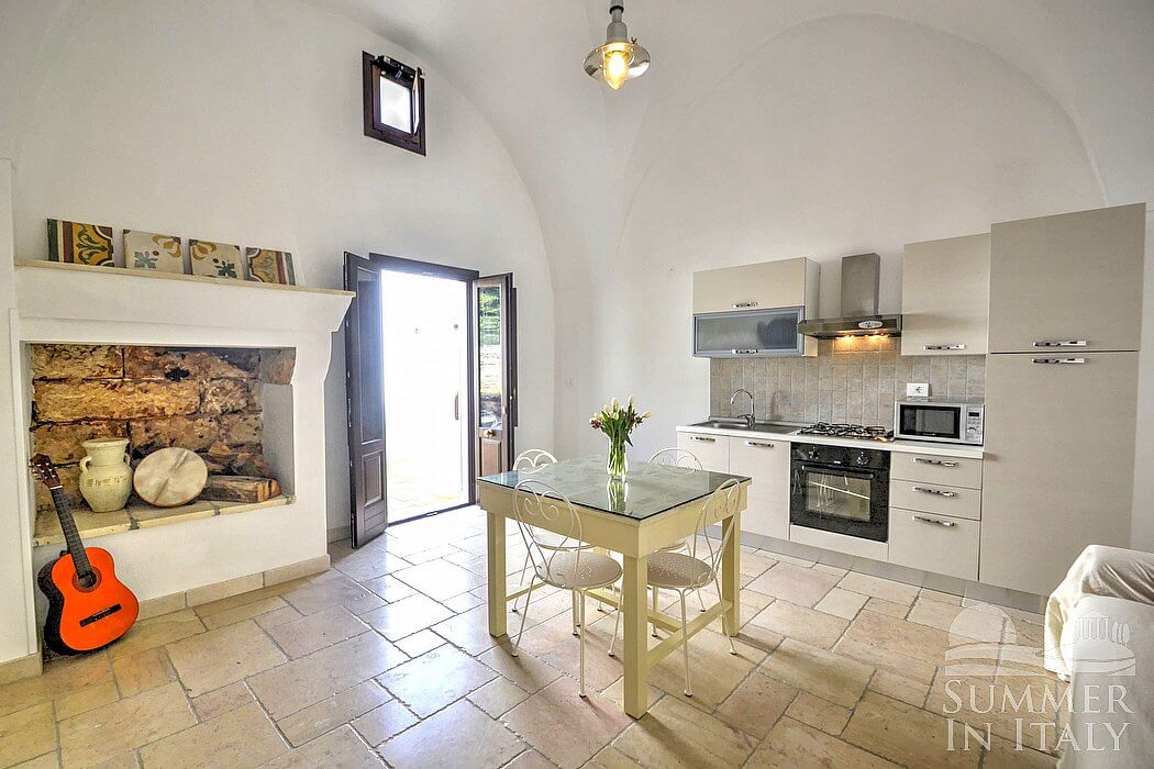 The living room is paved with characteristic stone tiles. The ceiling boasts a star vault. The furnishings are rural and characteristic of the house of Apulia. The furnishings include a divan bed for one guest. In this room an additional twin bed (80 cm/32 inches) is available (if requested in advance) to make it a double room. There is a big and age-old fireplace made of stone. In the living room you will also find a cooking area. The kitchenette is equipped with a four-burner gas cooker, an electric oven, a refrigerator with freezer, a microwave oven and an Italian-style coffee-maker. The dining table can accommodate four guests. The room has a small high window. It is equipped with an air conditioning/heating unit.