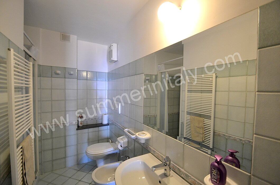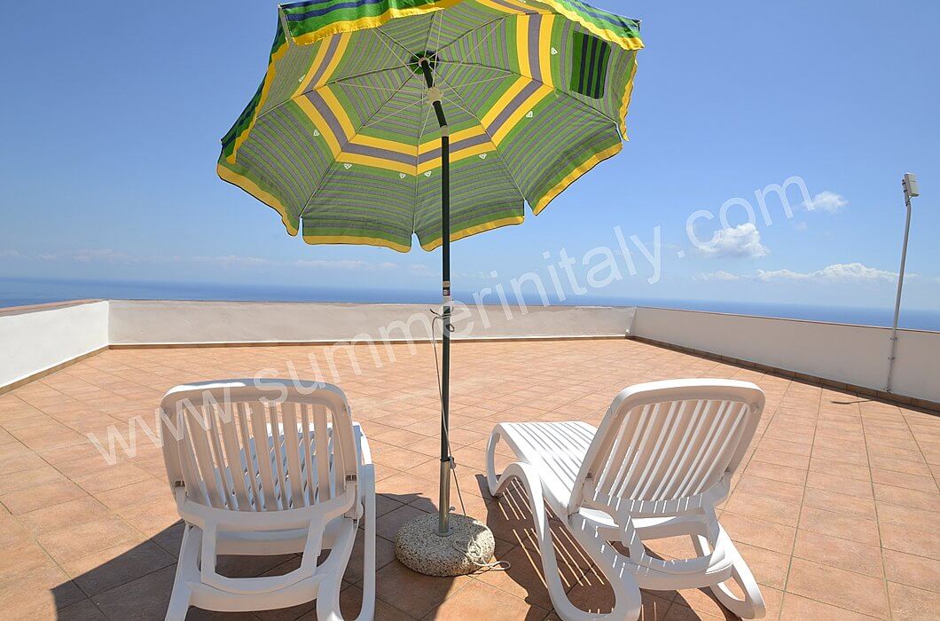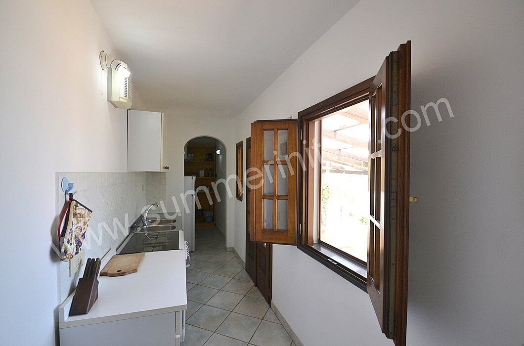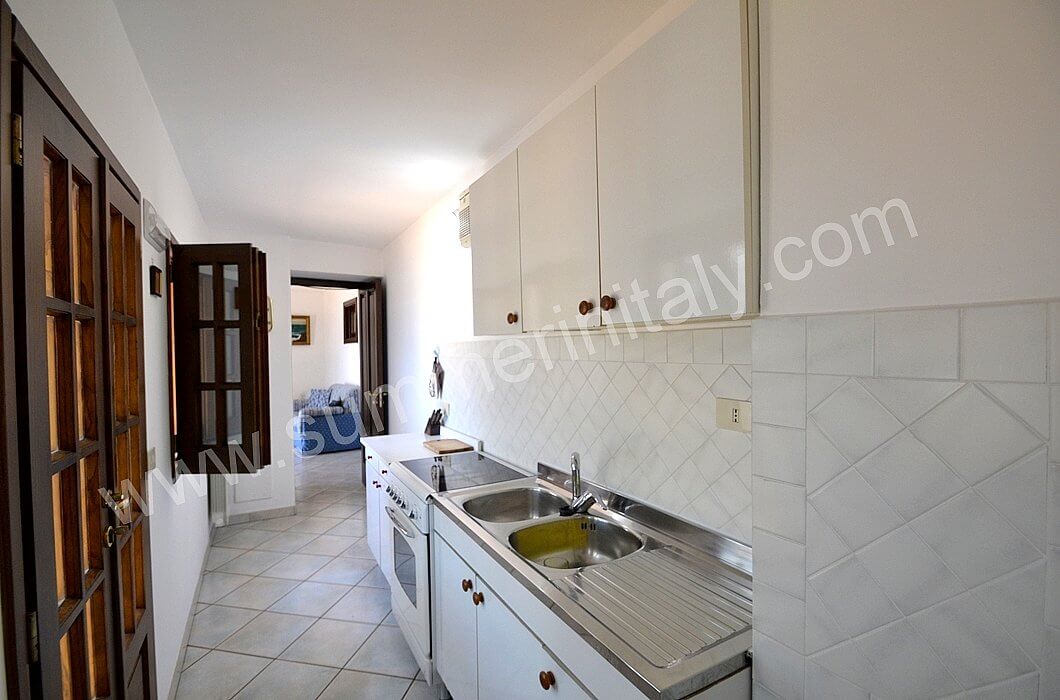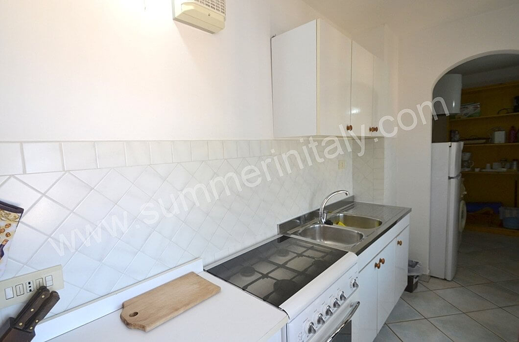 You will be able to enter the kitchen from the living room through an access area. It is equipped with a four-burner gas cooker, an electric oven, a refrigerator with freezer and an Italian-style coffee-maker. Here you will also find a washing machine. From the kitchen a double-glazed French door will take you to the terrace with a view of the sea.