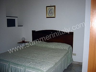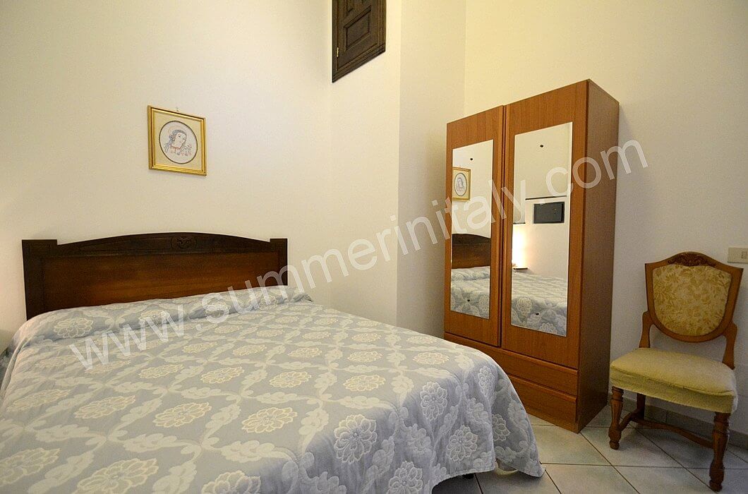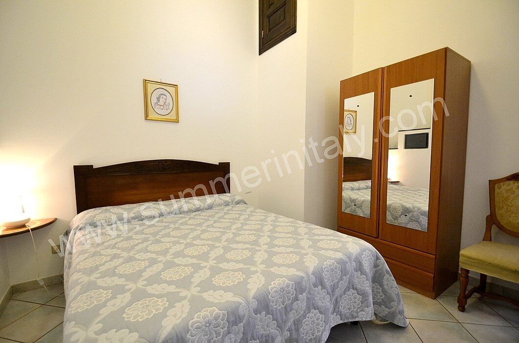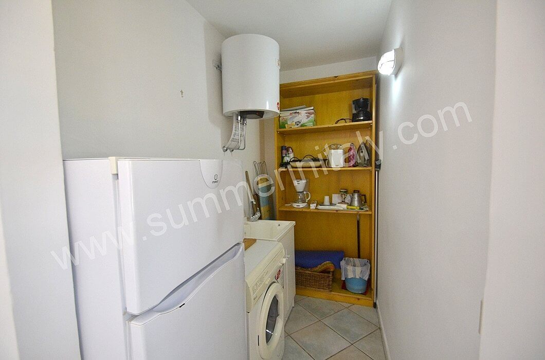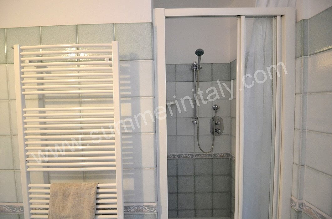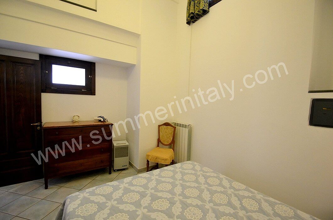 You will be able to enter the kitchen from the living room through an access area. It is equipped with a four-burner gas cooker, an electric oven, a refrigerator with freezer and an Italian-style coffee-maker. Here you will also find a washing machine. From the kitchen a double-glazed French door will take you to the terrace with a view of the sea.