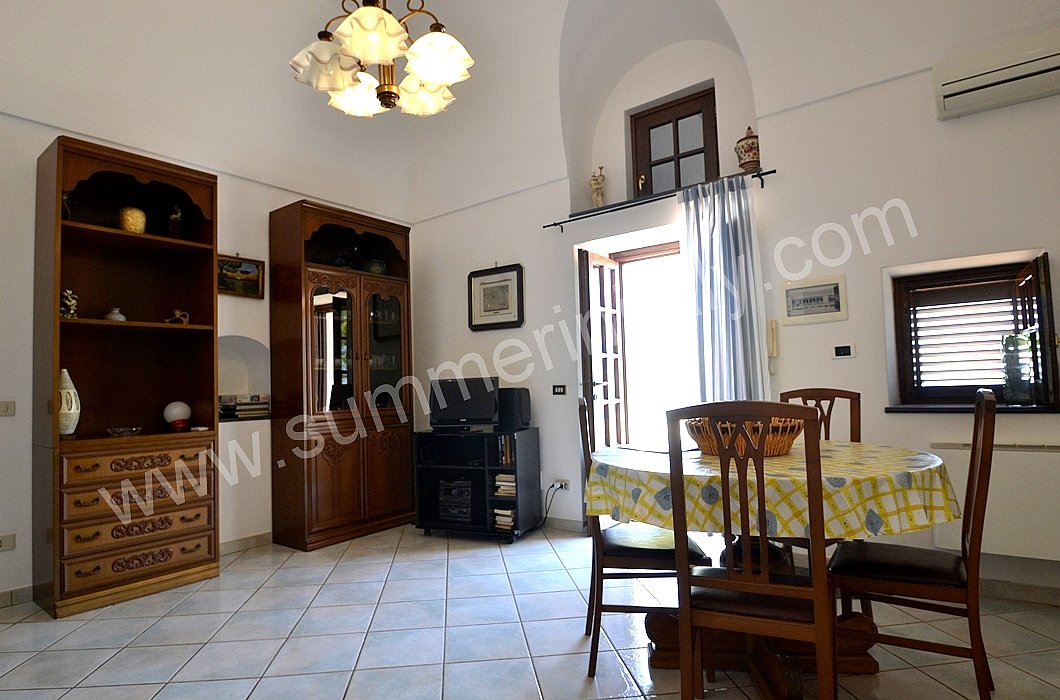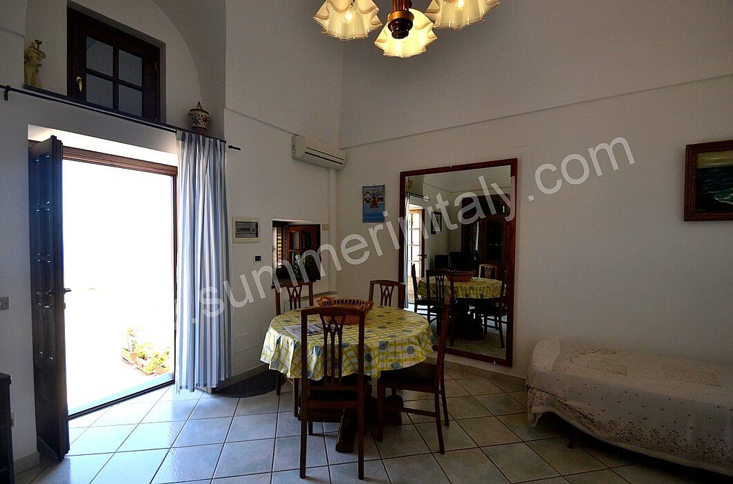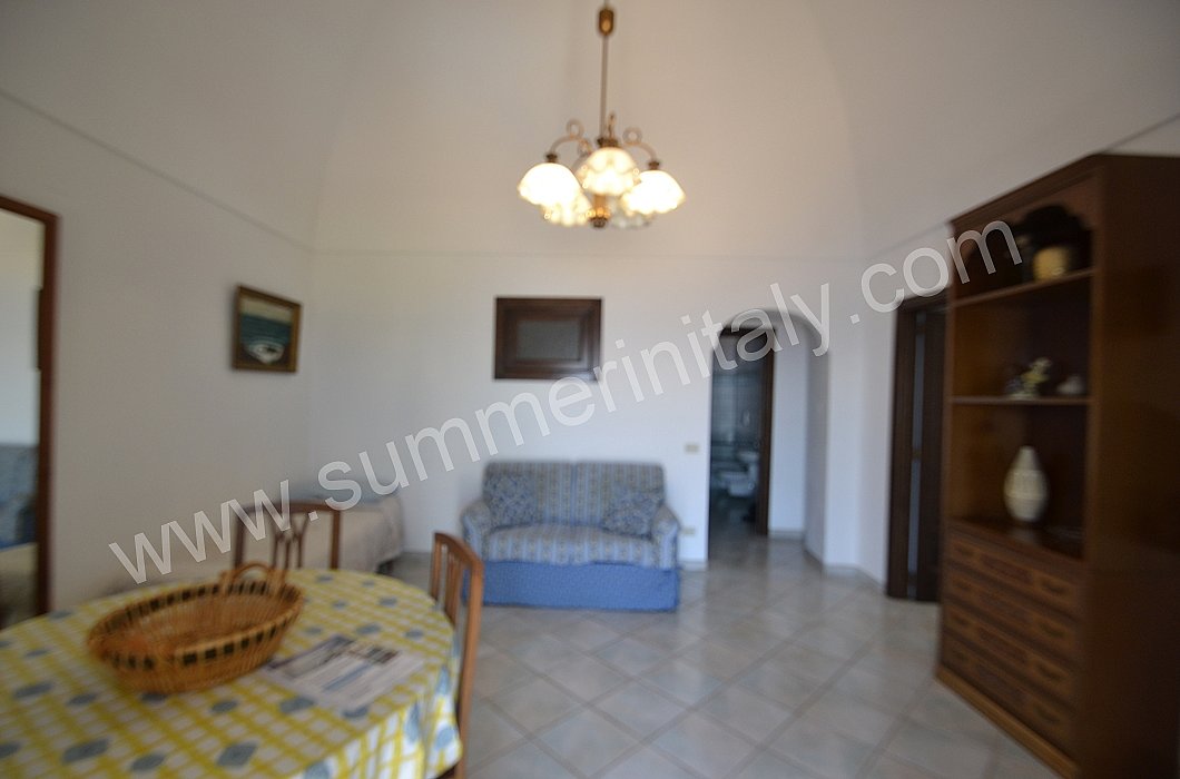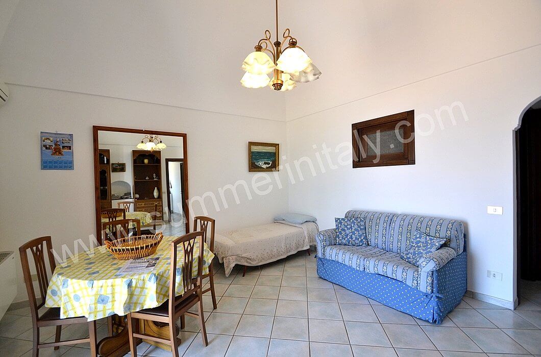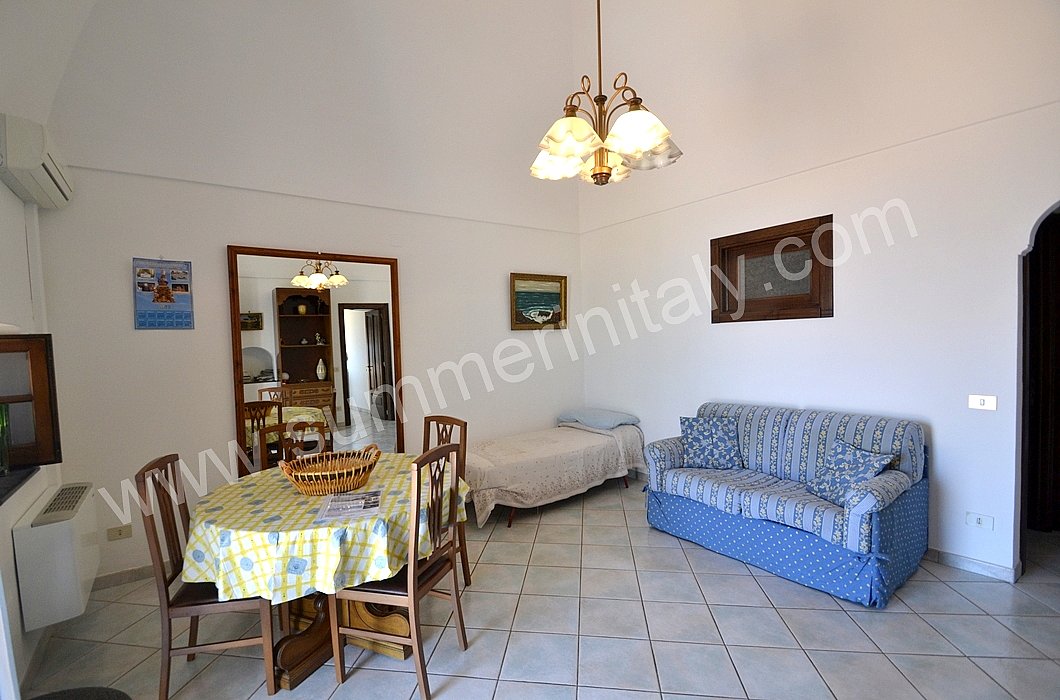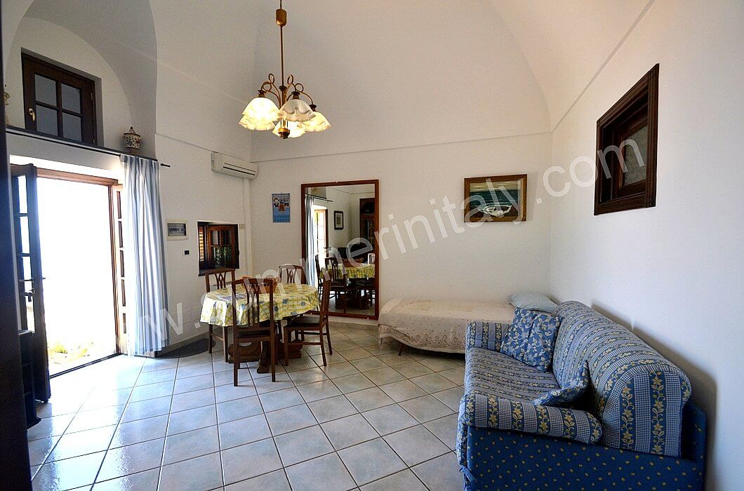 The furnishings of the living room are simple. The furnishings include a sofa. The dining table can accommodate four guests. In this room you will find a television (local channels). From the living room you will be able to enter the terrace with a view of the sea and of the coast of Amalfi through a French door. The room also has a small window overlooking the terrace. It is equipped with an air conditioning/heating unit.