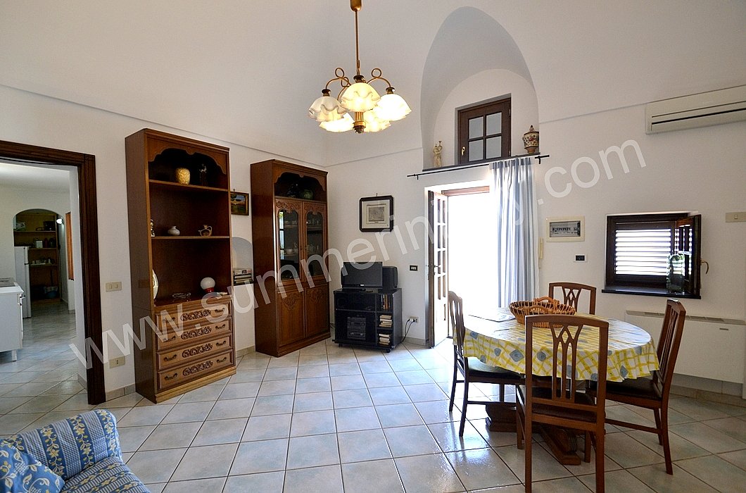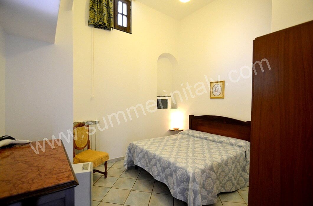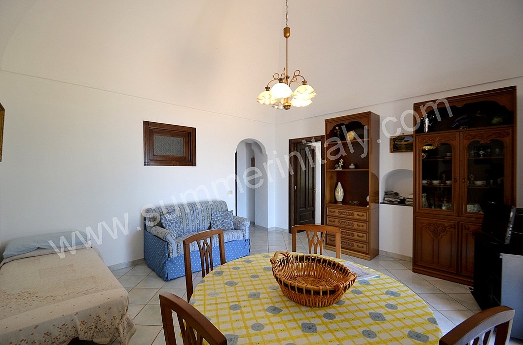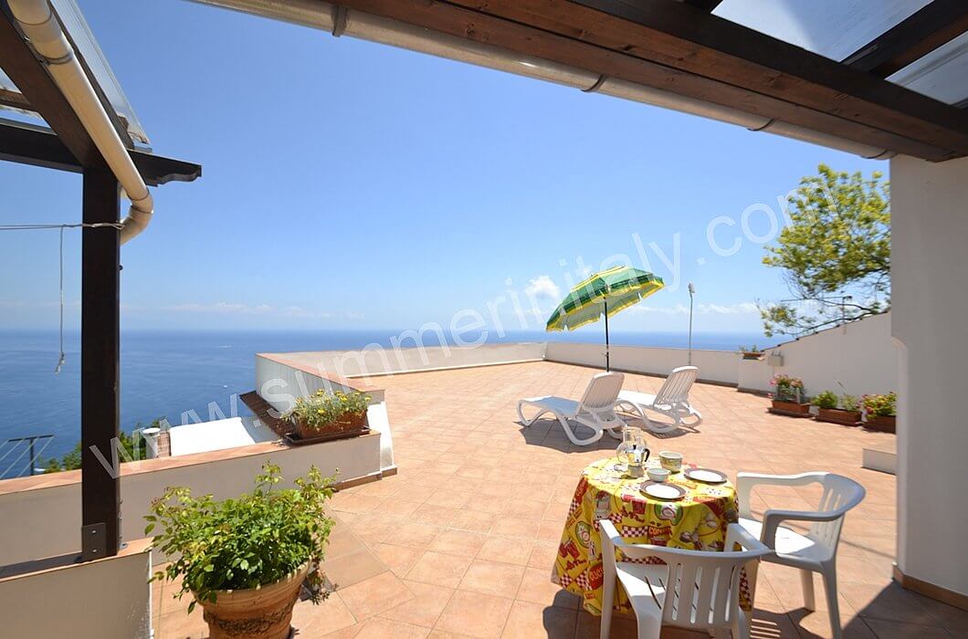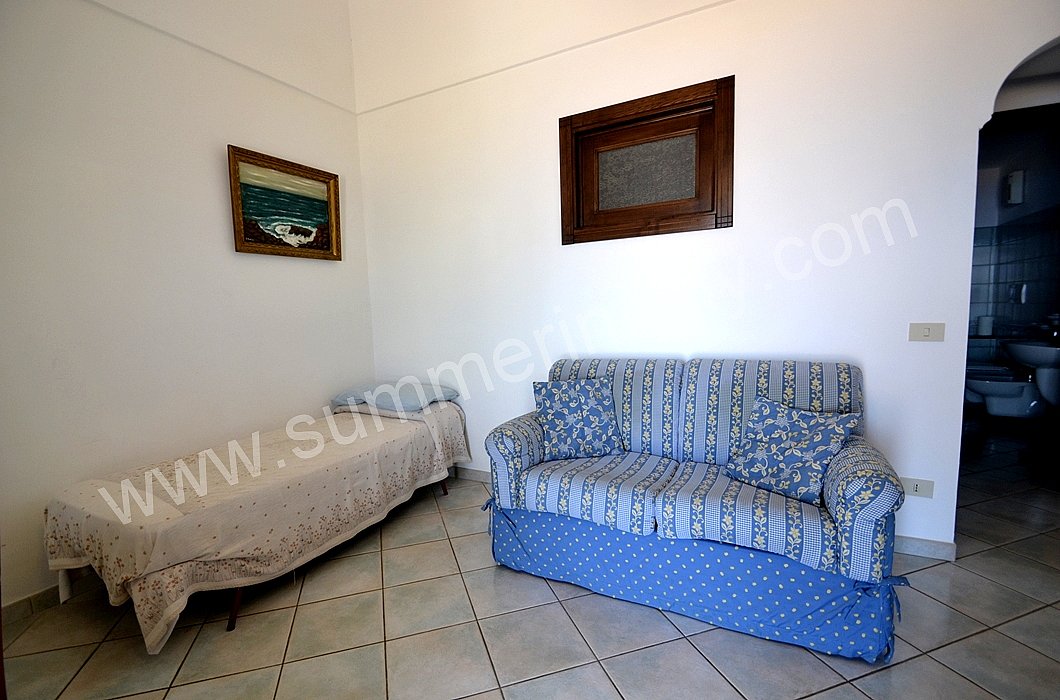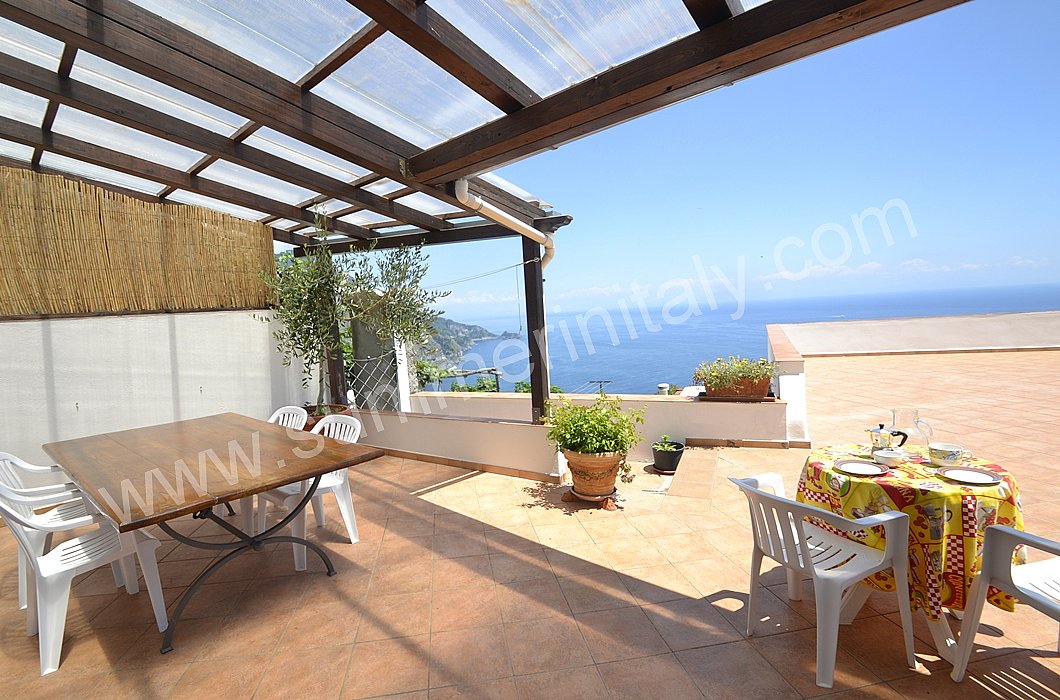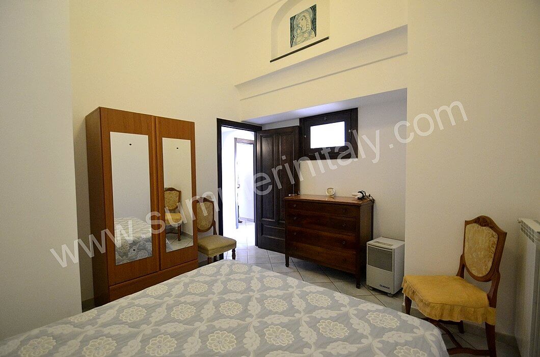 The furnishings of the living room are simple. The furnishings include a sofa. The dining table can accommodate four guests. In this room you will find a television (local channels). From the living room you will be able to enter the terrace with a view of the sea and of the coast of Amalfi through a French door. The room also has a small window overlooking the terrace. It is equipped with an air conditioning/heating unit.