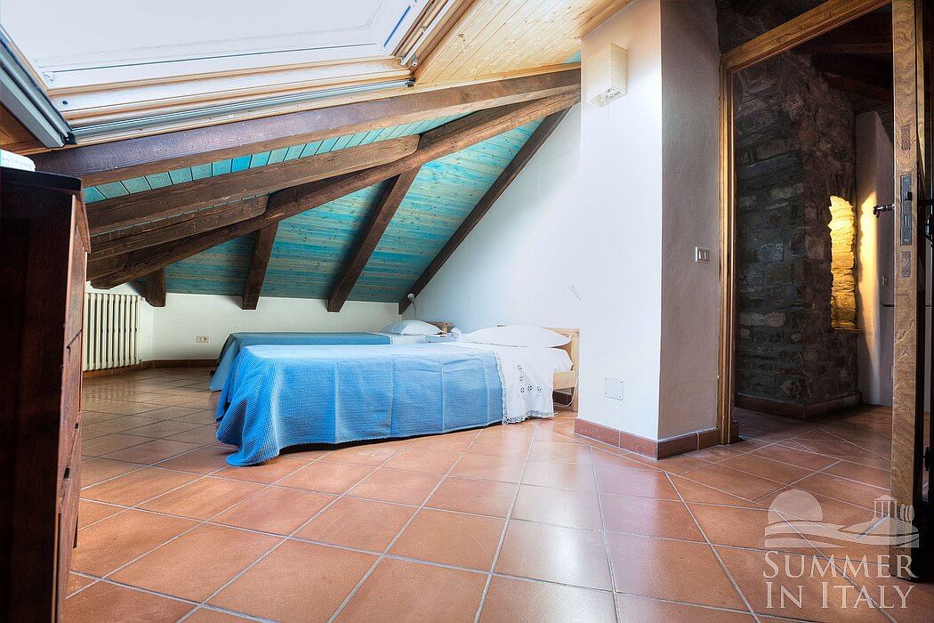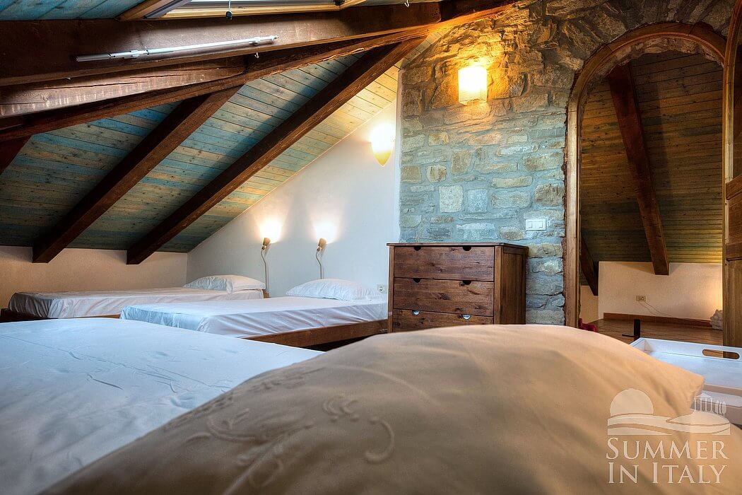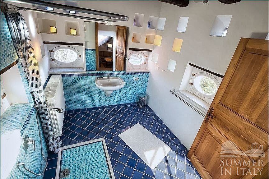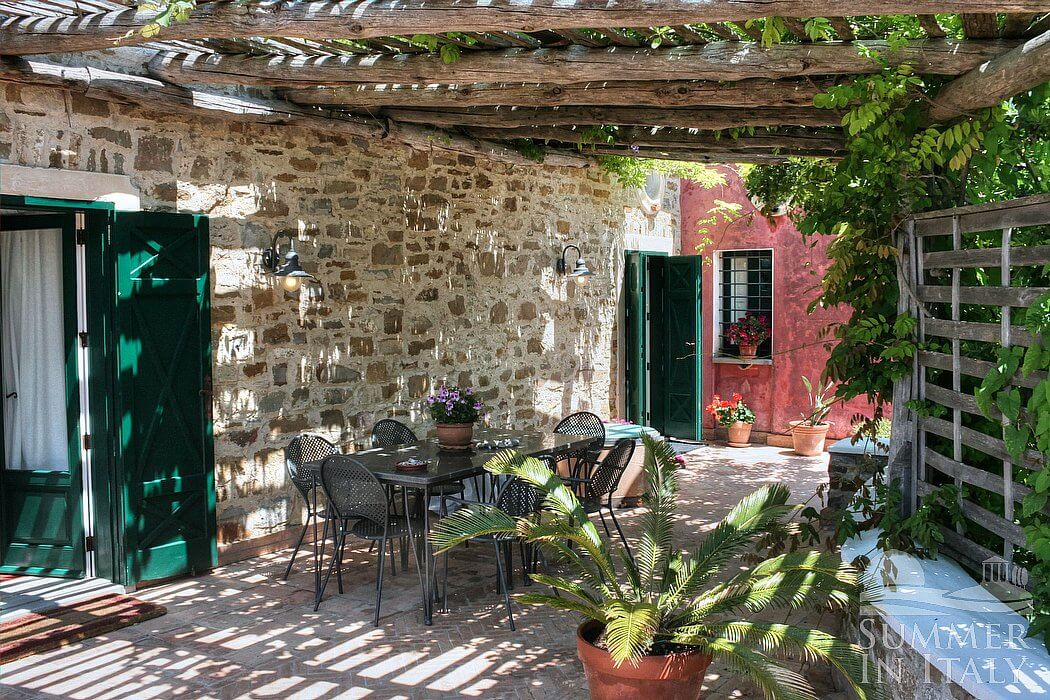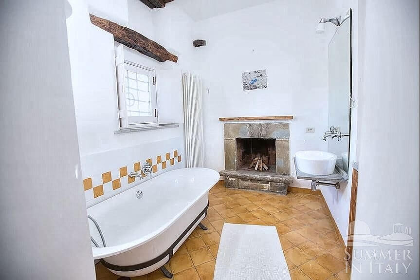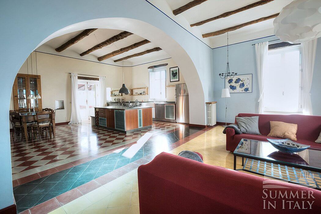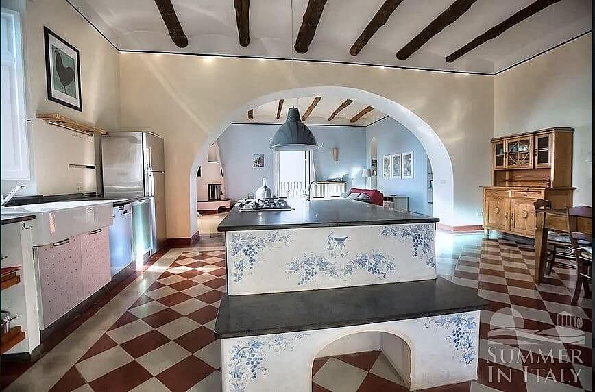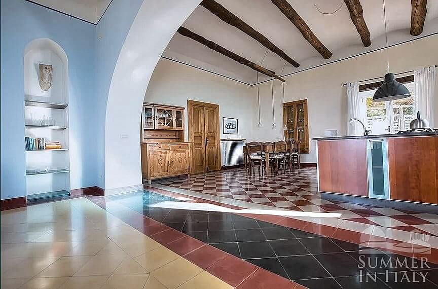 You will be able to enter the kitchen from the corridor. The floor is paved with checkered red and white tiles. The ceiling has characteristic exposed wood beams. It is equipped with a six-burner gas cooker, an electric oven, a refrigerator with freezer, a dishwasher and an Italian-style coffee-maker. The dining table can accommodate eight guests. From the kitchen a French door will take you to the patio. The room also has a window.