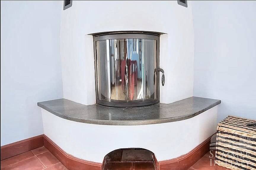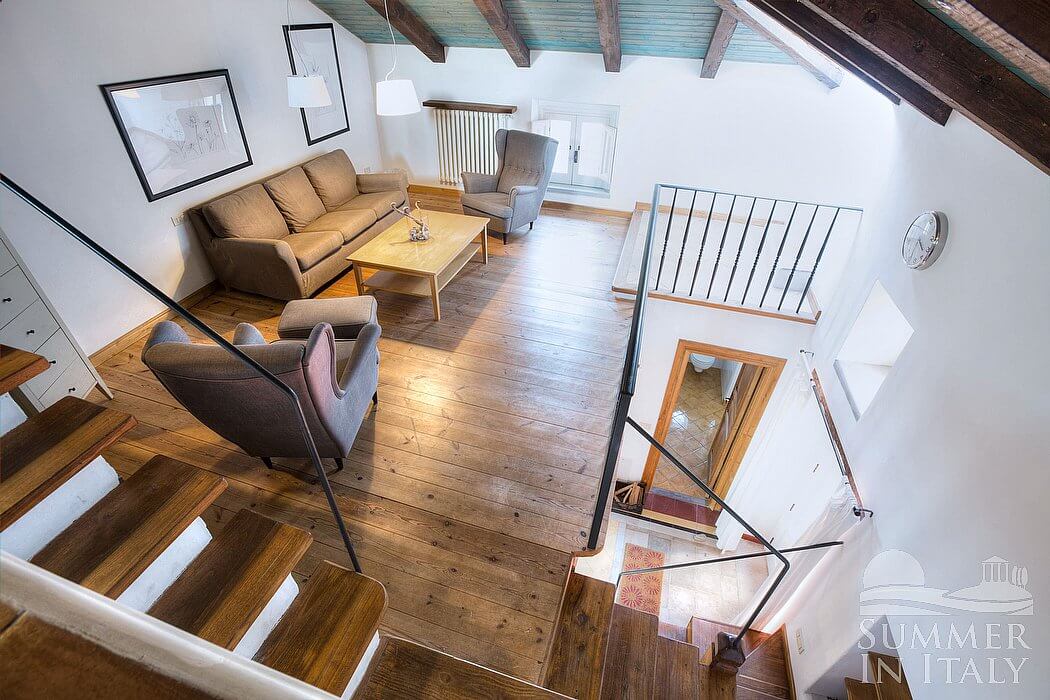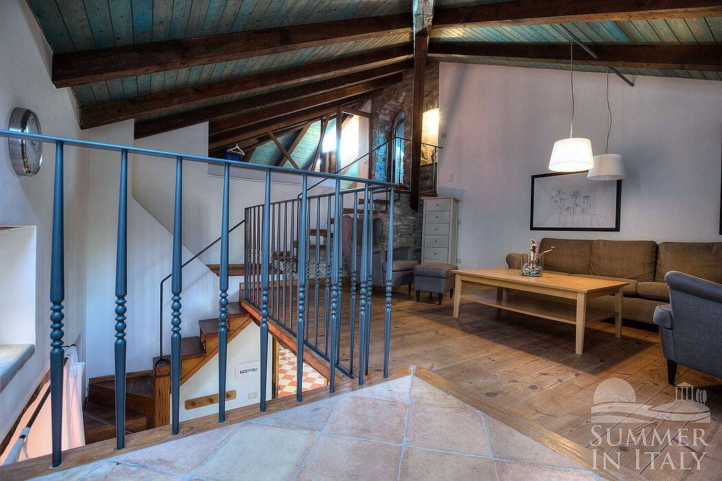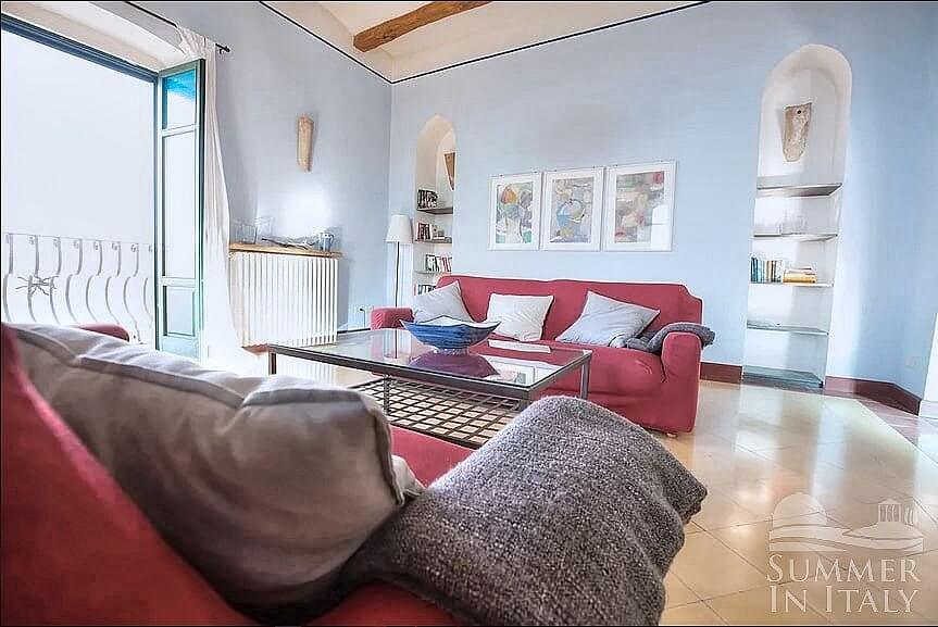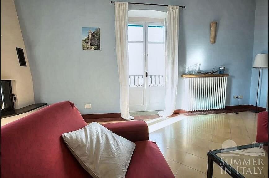 You will be able to enter the living room from the kitchen through an arched opening. The ceiling has characteristic exposed wood beams. The furnishings are cozy and comfortable. The furnishings include two sofas. There is a practical fireplace. From the living room you will be able to enter a small balcony through a French door. The room also has a large window with a view of the sea.