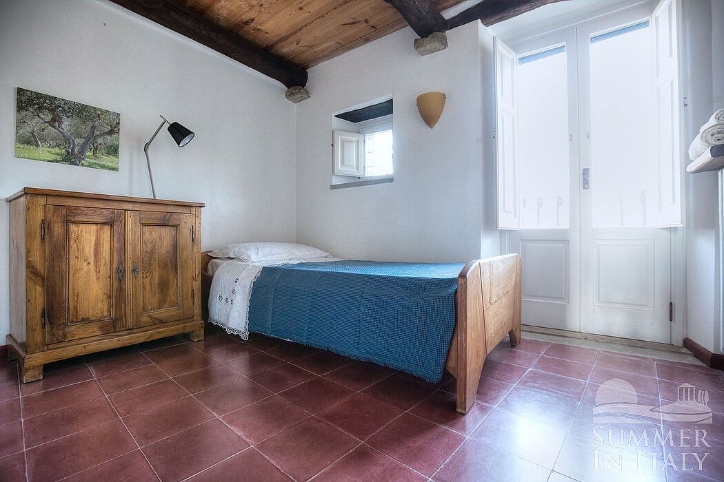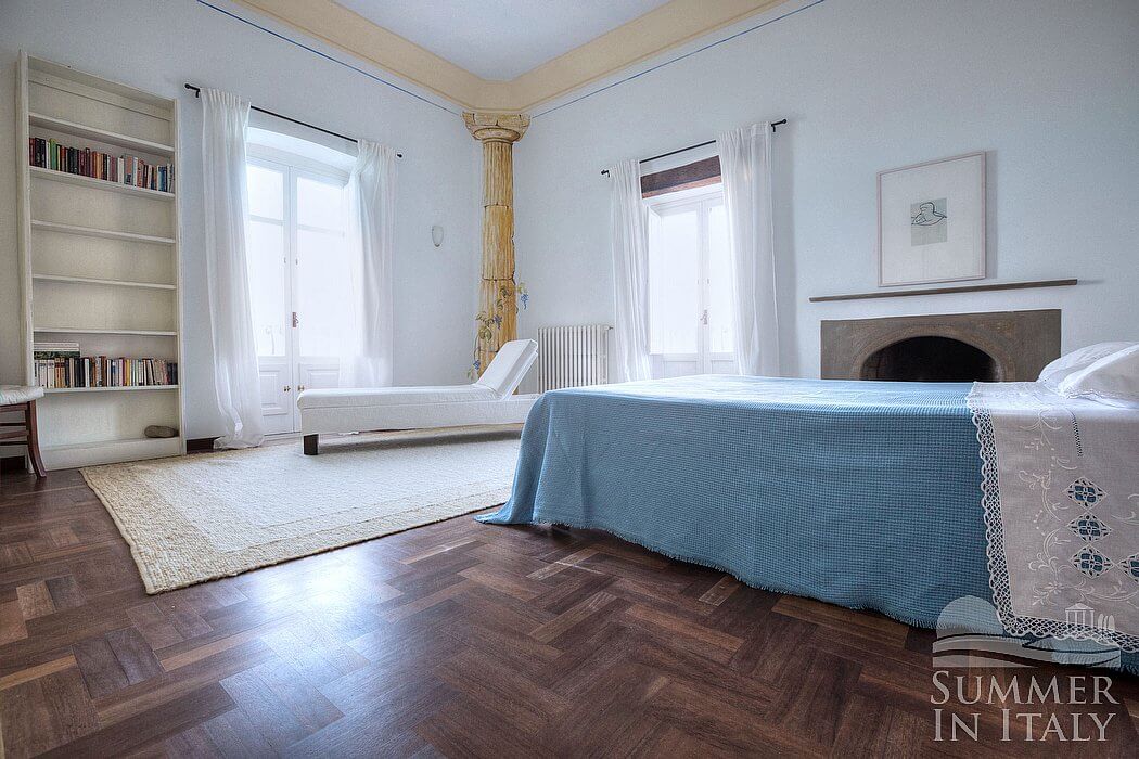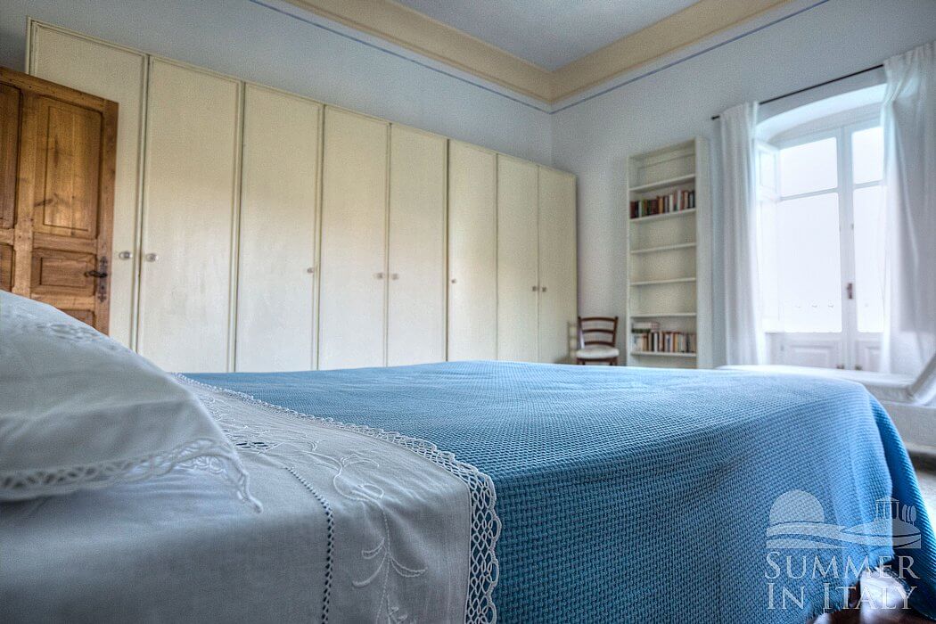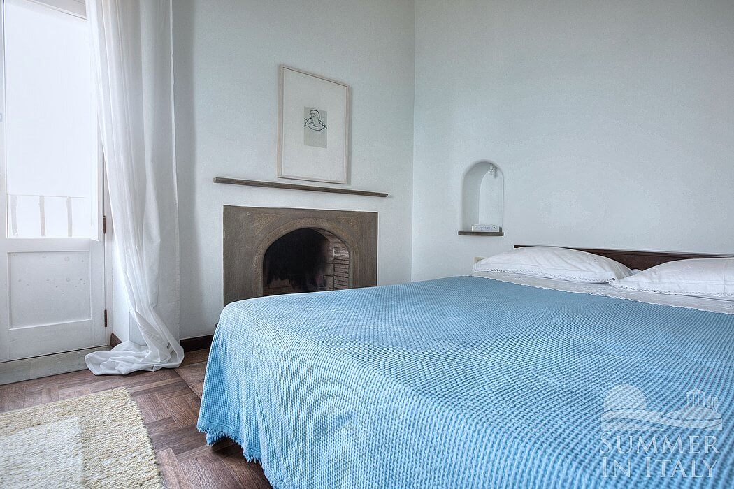 You will be able to enter the first bedroom through a corridor. The floor is paved with wood. The room has a matrimonial bed (160 cm/63 inches, wider than a queen-size bed). There is a small fireplace. The furnishings include a chaise longue. From the bedroom you will be able to enter two small balconies with a view of the sea through two French doors.