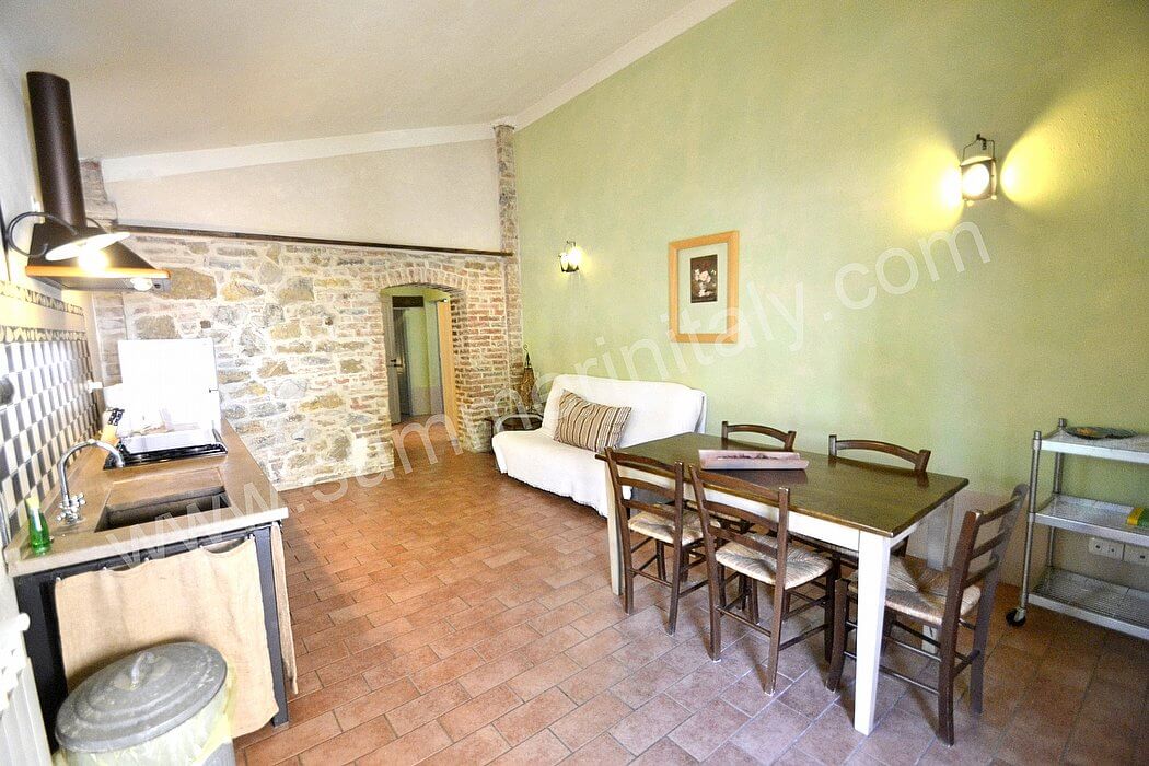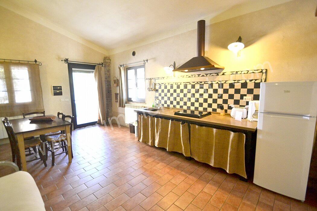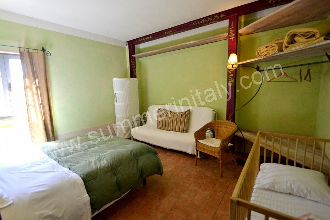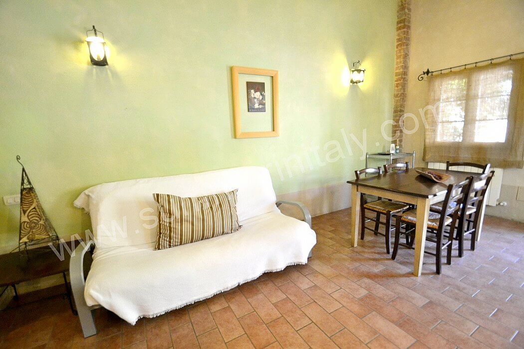 The living room is paved with terracotta tiles. The furnishings are simple and comfortable. The furnishings include a divan that unfolds into a double bed. In the living room you will also find a cooking area. The kitchenette is equipped with a four-burner gas cooker, a refrigerator with freezer, an Italian-style coffee-maker and a kettle. The dining table can accommodate six guests. From the living room you will be able to enter the patio through a French door. The room has a window with a view of the greenery.