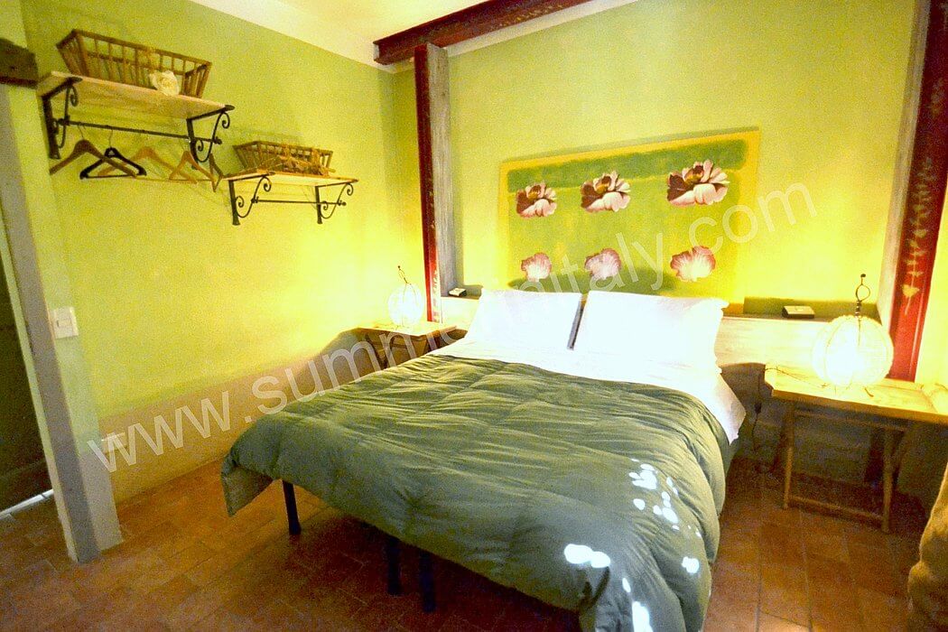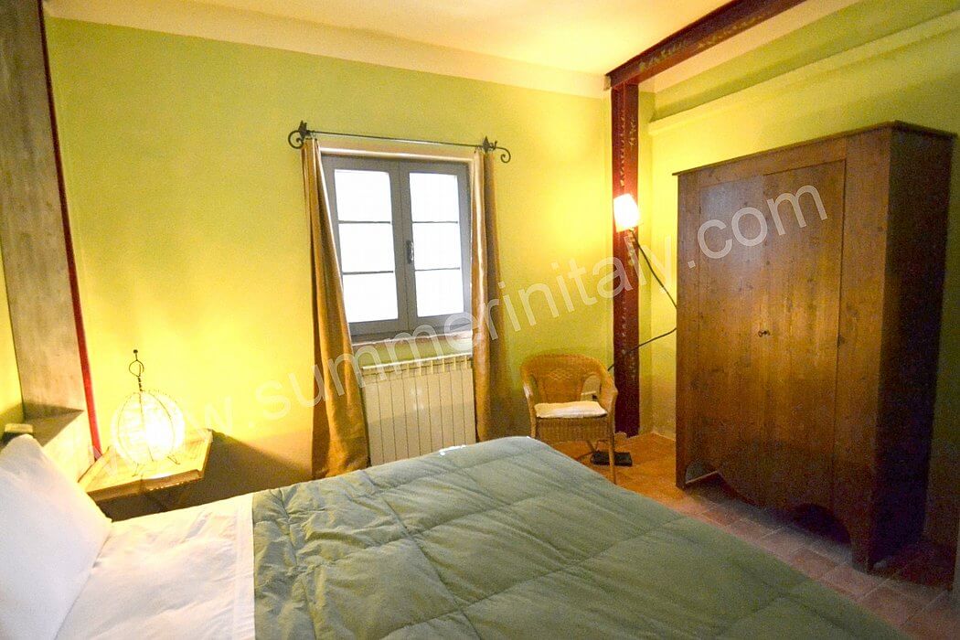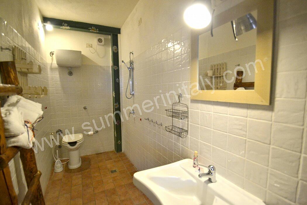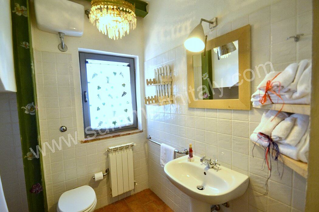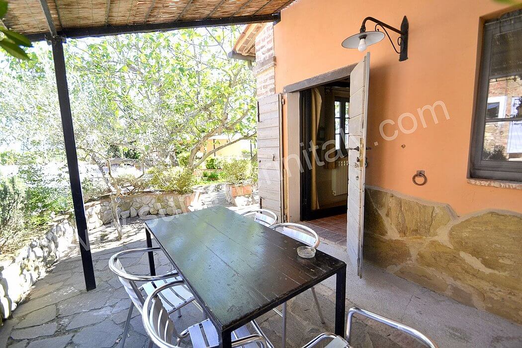 The living room is paved with terracotta tiles. The furnishings are simple and comfortable. The furnishings include a divan that unfolds into a double bed. In the living room you will also find a cooking area. The kitchenette is equipped with a four-burner gas cooker, a refrigerator with freezer, an Italian-style coffee-maker and a kettle. The dining table can accommodate six guests. From the living room you will be able to enter the patio through a French door. The room has a window with a view of the greenery.