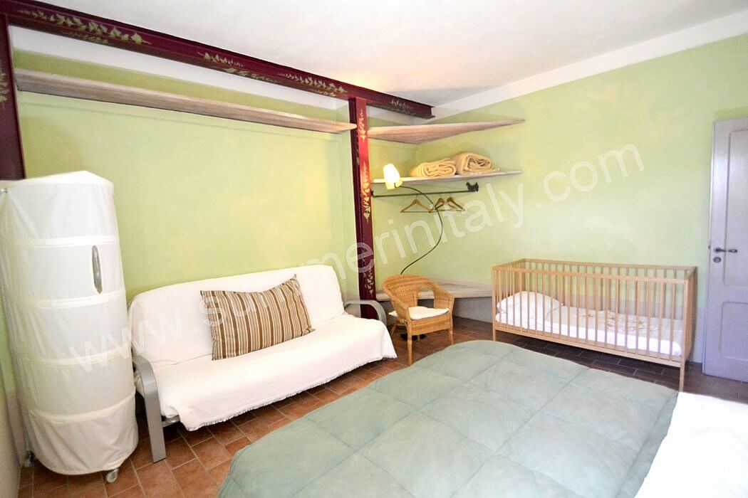 You will be able to enter the family room from the garden. In the family room you will also find a cooking area. The kitchenette is equipped with a four-burner gas cooker, an electric oven, a refrigerator with freezer and an Italian-style coffee-maker. The two dining tables can accommodate 16 guests. From the family room you will be able to enter the garden through a French door. The room also has three windows with a view of the greenery.