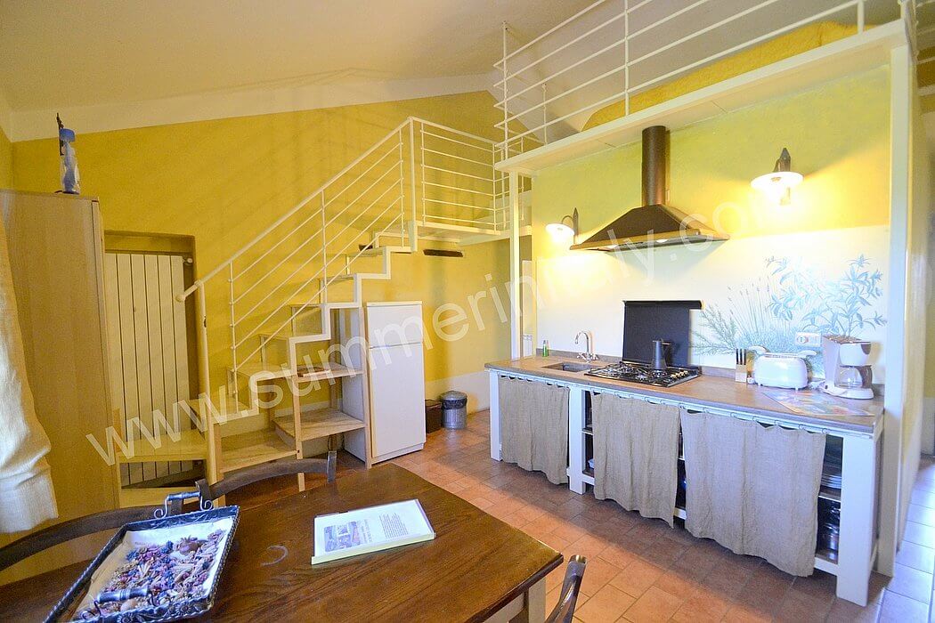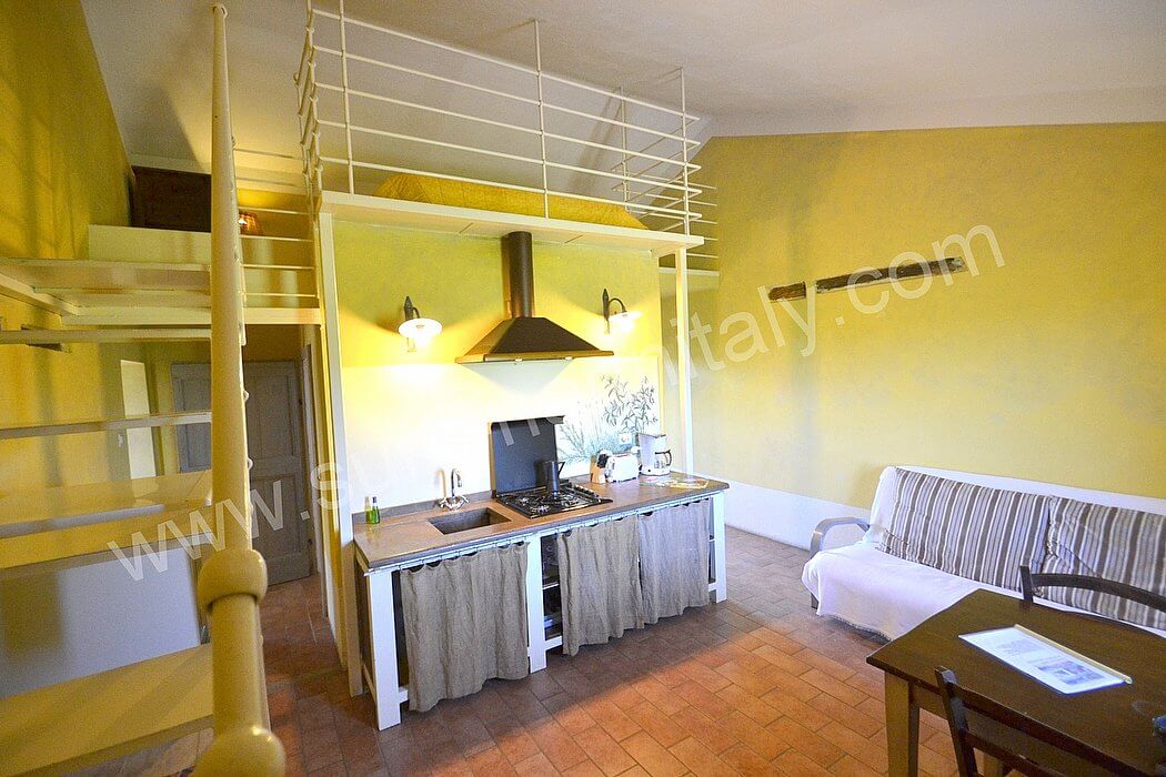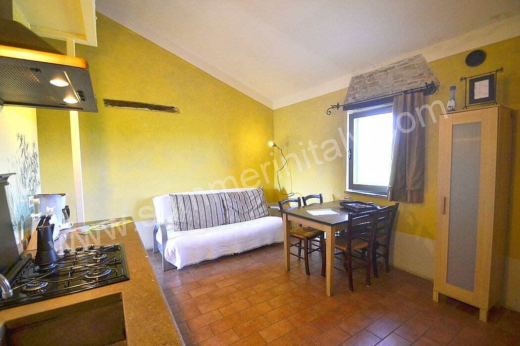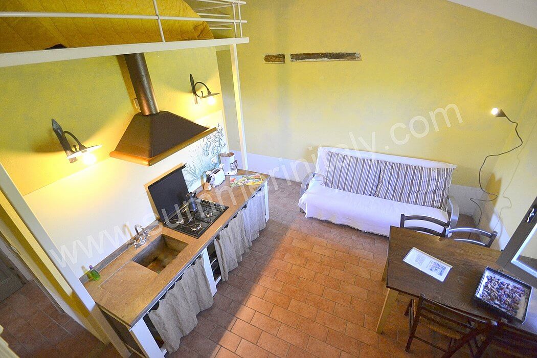 The living room is paved with terracotta tiles. The furnishings are simple and comfortable. Here you will find a matrimonial bed (160 cm/62 inches, wider than a queen-size bed), located on the mezzanine level. The furnishings include a sofa. In the living room you will also find a cooking area. The kitchenette is equipped with a four-burner gas cooker, a refrigerator with freezer, an Italian-style coffee-maker and a kettle. The dining table can accommodate four guests. The room has a window with a view of the hill.