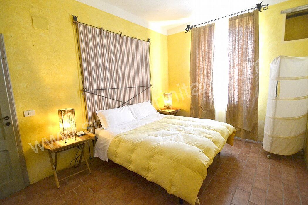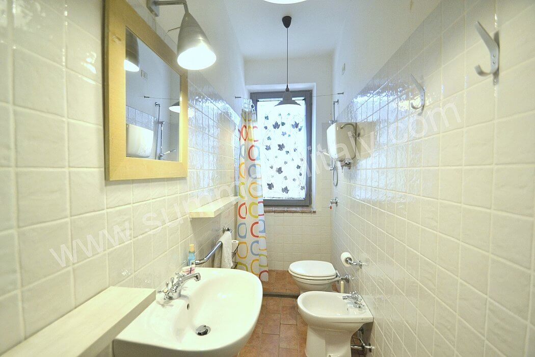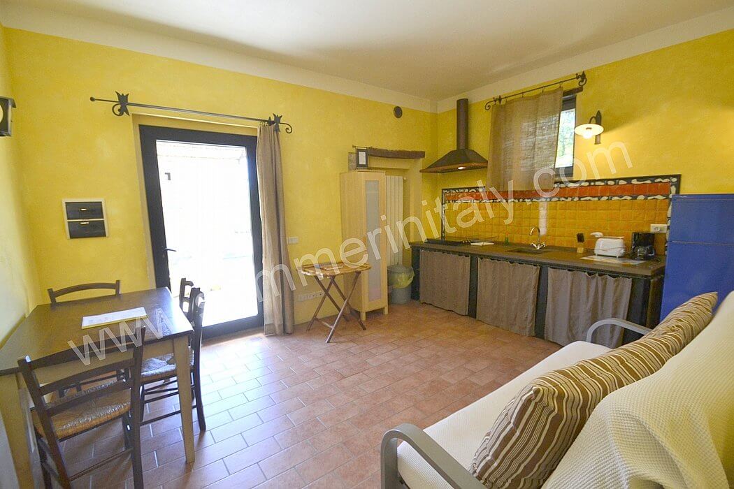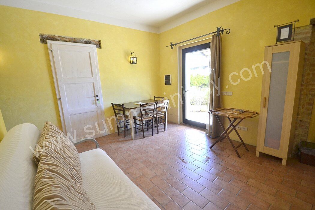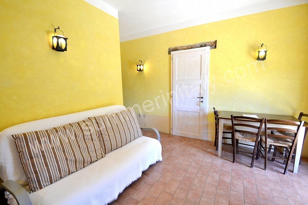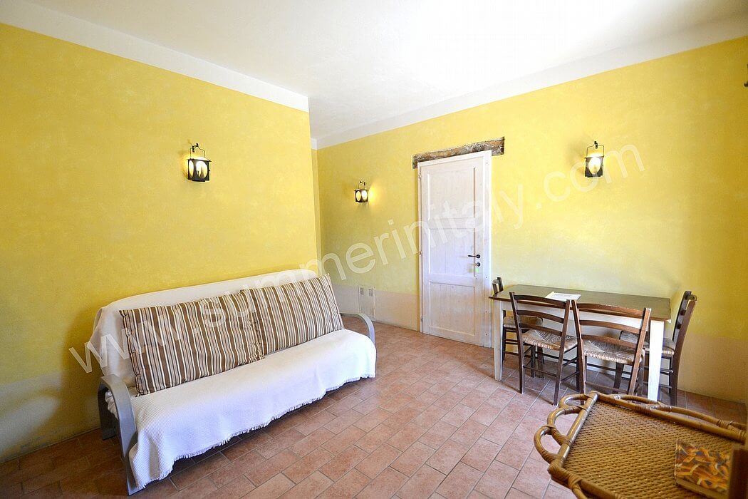 The living room is paved with terracotta tiles. The furnishings are simple and comfortable. The furnishings include a divan that unfolds into a double bed. In the living room you will also find a cooking area. The kitchenette is equipped with a four-burner gas cooker, a refrigerator with freezer, an Italian-style coffee-maker and a kettle. The dining table can accommodate four guests. From the living room you will be able to enter the patio through a French door. The room has a window with a view of the greenery.