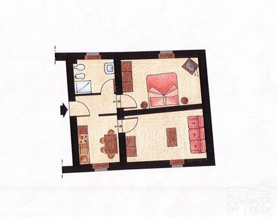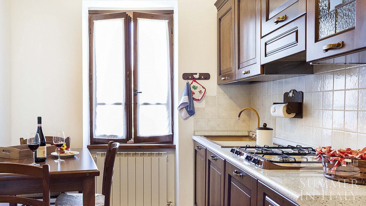 The kitchen is paved with terracotta tiles. The furnishings are simple. It is equipped with a four-burner gas cooker, a small refrigerator without freezer and an Italian-style coffee-maker. Here you will also find an iron and an ironing board. The dining table can accommodate four guests. The kitchen has a window.