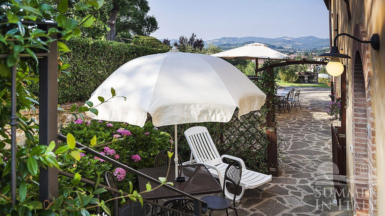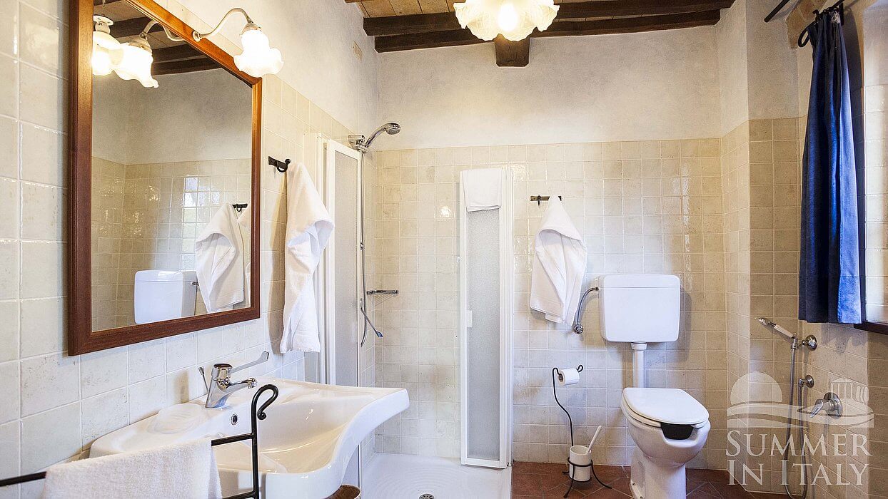 The swimming pool is 12 meters (39 feet) large by 20 meters (65 feet) long, from 60 centimeters (2 feet) to 1.80 meters (6 feet) deep. It is filled with sea water. The area is equipped with sun umbrellas, sun loungers and an external shower. From the swimming pool you will enjoy a charming view of the Umbrian hills and of Umbertide. You will share the pool with guests staying at 4 other apartments. The swimming pool is open from mid-May until mid-September.
