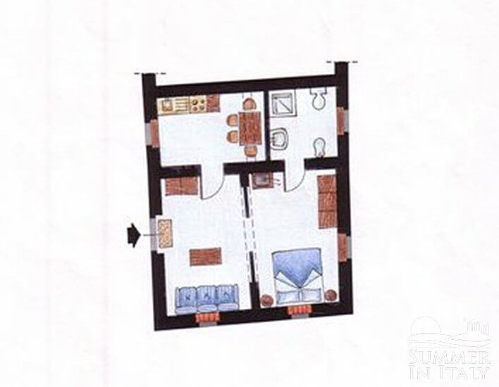 You will be able to enter the kitchen from the bedroom. The floor is paved with terracotta tiles. The ceiling has characteristic exposed wood beams and terracotta tiles. The furnishings are simple. It is equipped with a four-burner gas cooker, a small refrigerator without freezer and an Italian-style coffee-maker. Here you will also find an iron and an ironing board. The dining table can accommodate four guests. The kitchen has a window.