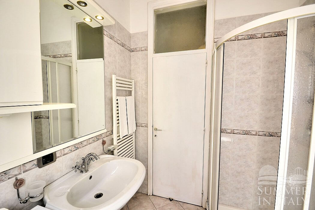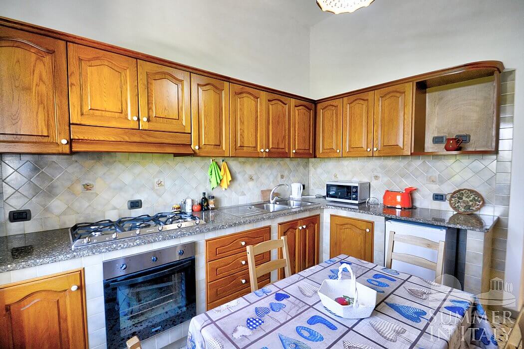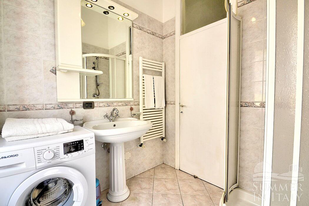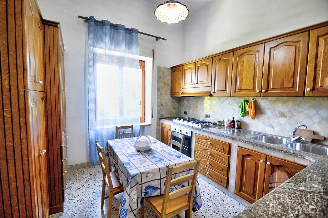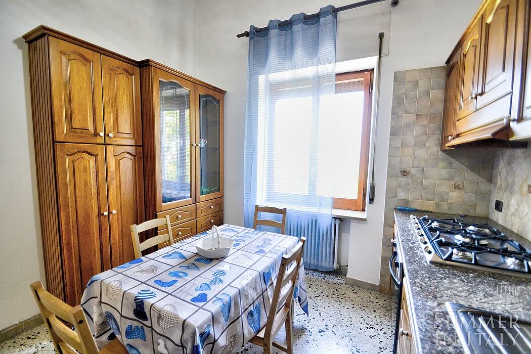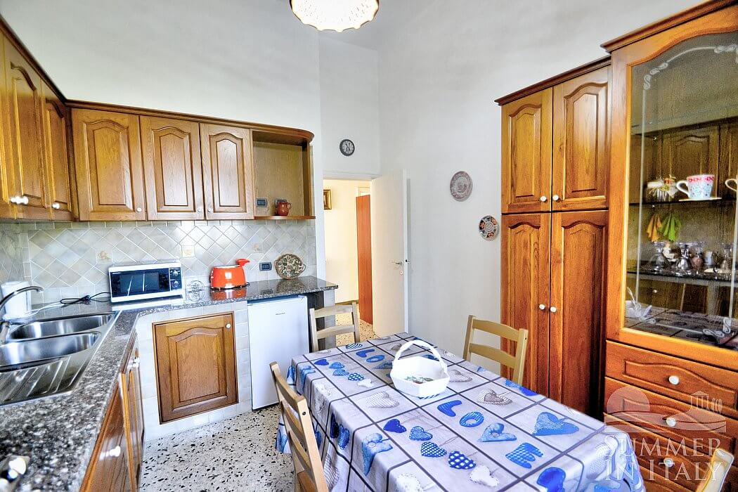 You will be able to enter the kitchen from the corridor. The furnishings are cozy and comfortable. It is equipped with a five-burner gas cooker, an electric oven, a refrigerator with freezer, a microwave oven, an Italian-style coffee-maker, an American-style coffee-maker (bring your filters!), a toaster and a kettle. The dining table can accommodate four guests. The kitchen has a window with a view of the greenery.