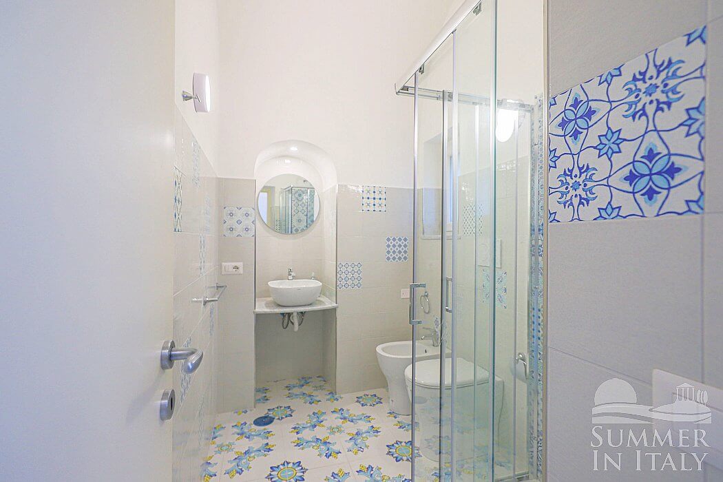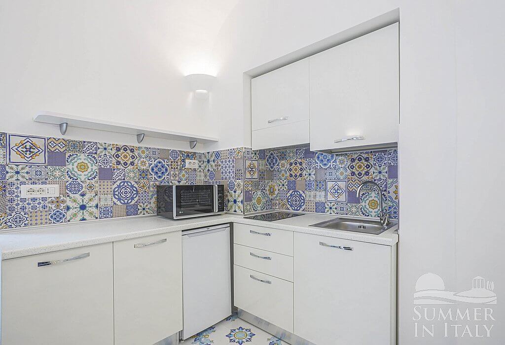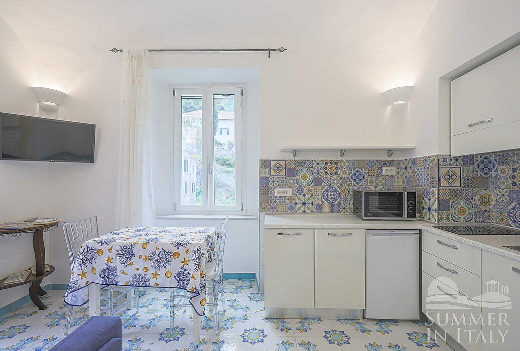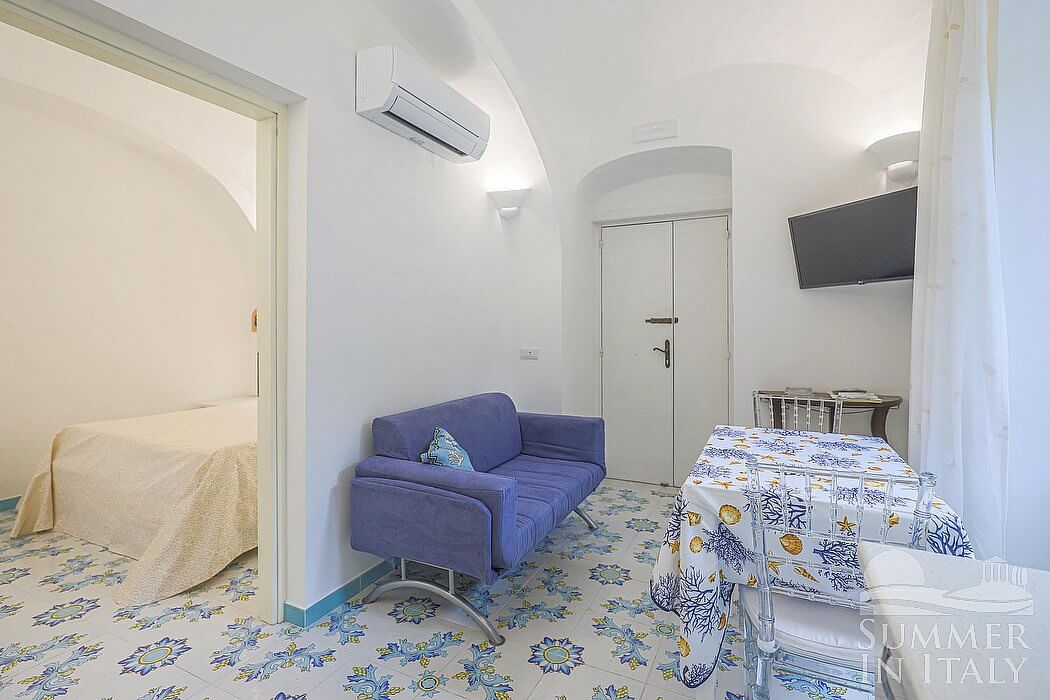The kitchen is paved with handmade majolica tiles, in the characteristic style of the Amalfi Coast. The ceiling is vaulted. The furnishings are simple and comfortable. It is equipped with a two-burner induction cooker, a small refrigerator without freezer, a microwave oven and an Italian-style coffee-maker. The dining table can accommodate two guests. The furnishings of the kitchen include a divan bed for one guest (available upon request with an additional cost -- please contact our staff in advance). The kitchen is also equipped with a satellite smart TV. The kitchen has a window, and is equipped with an air conditioning/heating unit.