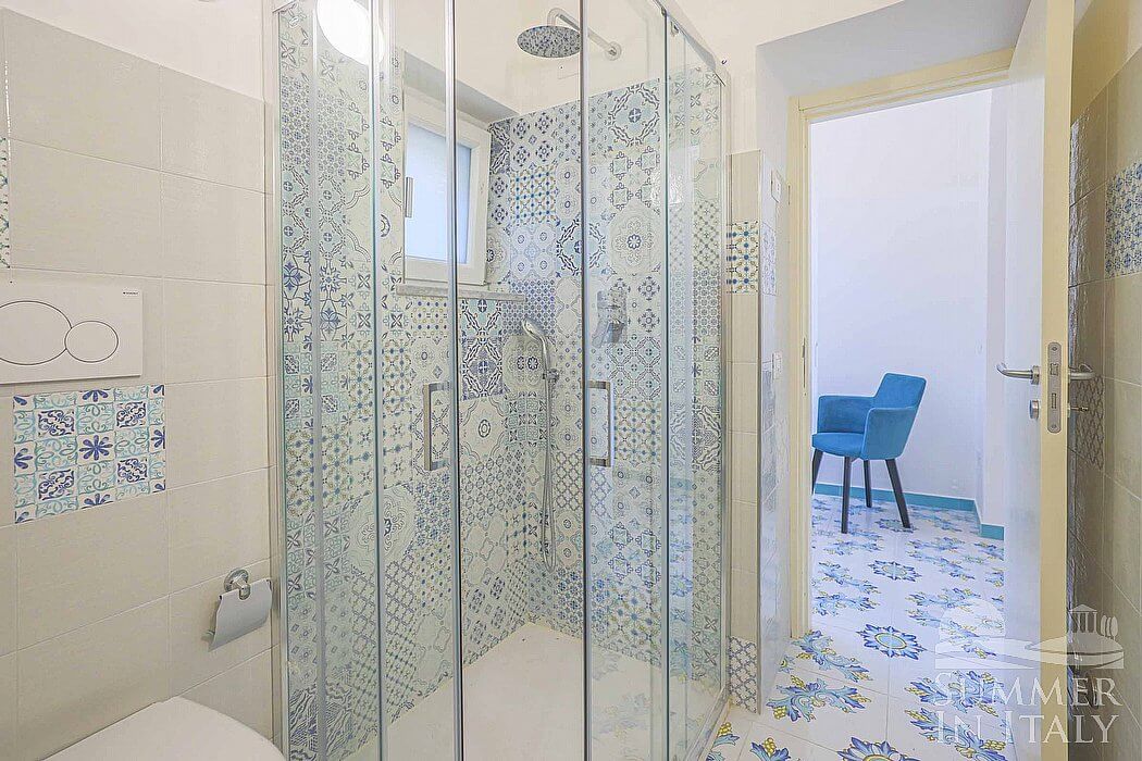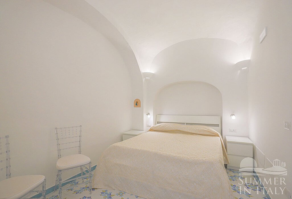 You will be able to enter the bedroom from the kitchen. The bedroom has a matrimonial bed (160 cm/63 inches, wider than a queen-size bed). The furnishings include a bedroom chair. The room has a large panoramic arched window, and it's equipped with an air conditioning/heating unit. This bedroom has an en-suite bathroom, decorated with majolica tiles and equipped with a washbasin, a toilet, a fully enclosed shower and a hairdryer.