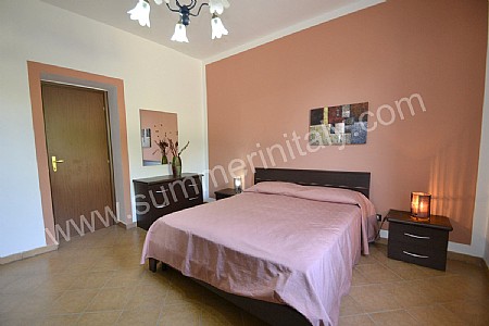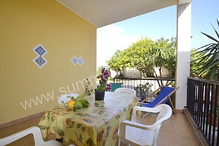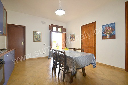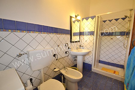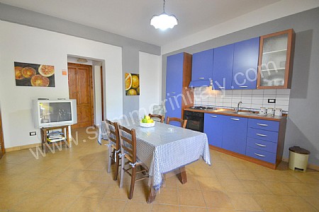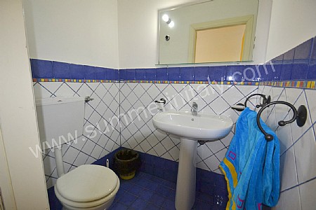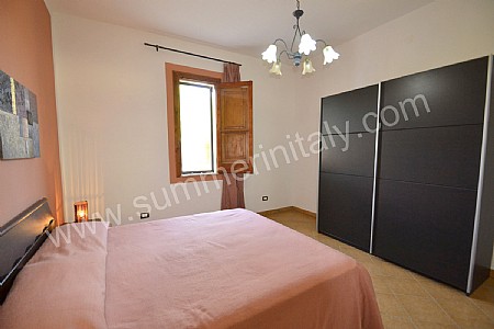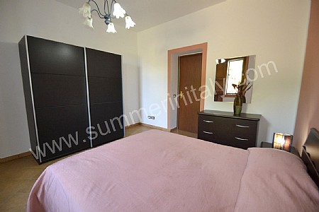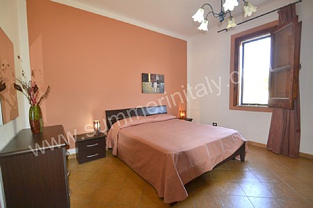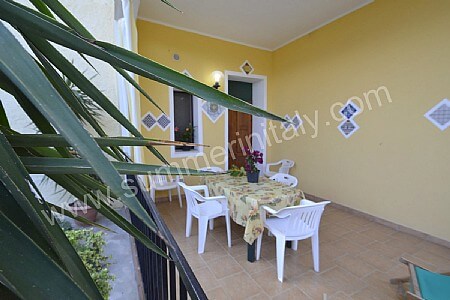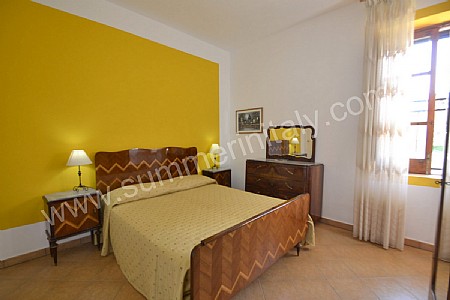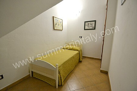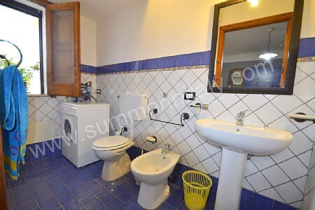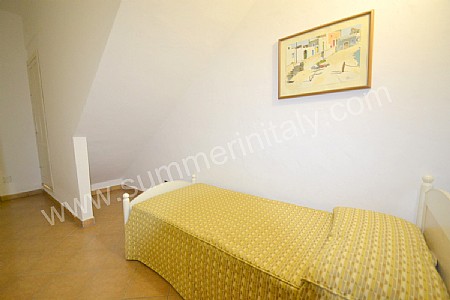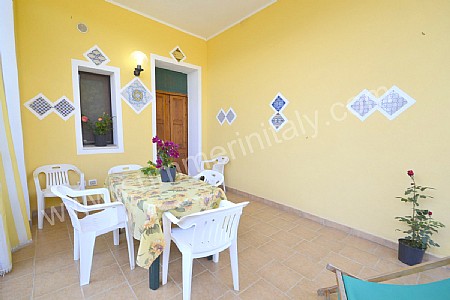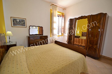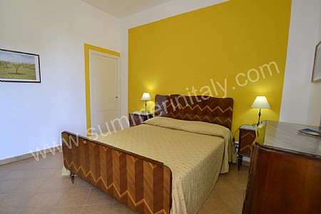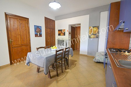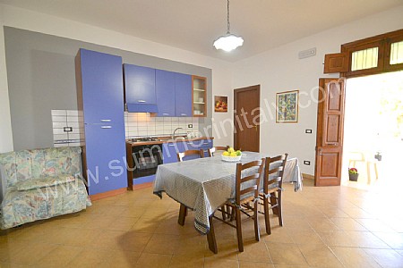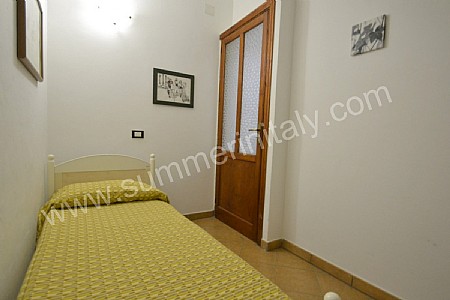 The furnishings of the living room are simple and comfortable. The furnishings include an armchair. In the living room you will also find a cooking area. The kitchenette is equipped with a four-burner gas cooker, an electric oven, a refrigerator with freezer and an Italian-style coffee-maker. The dining table can accommodate six guests. In this room you will find a television (local channels). From the living room you will be able to enter the patio through a French door.