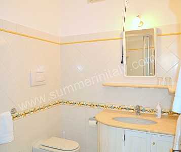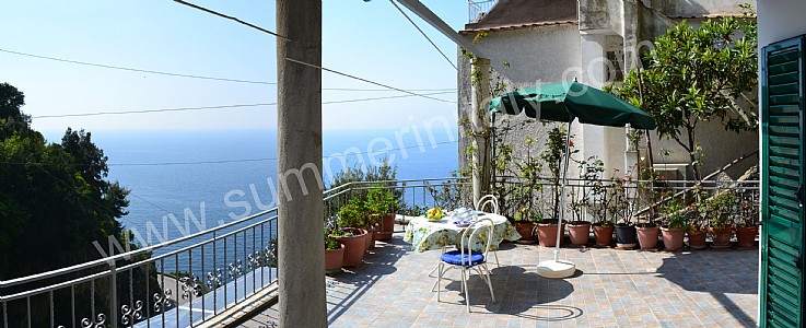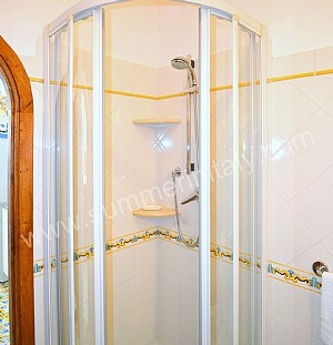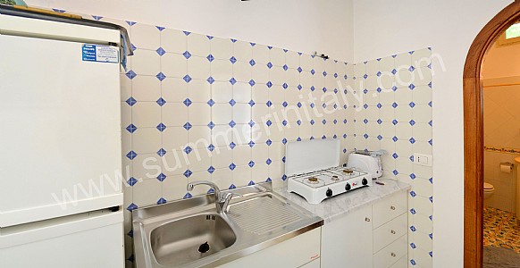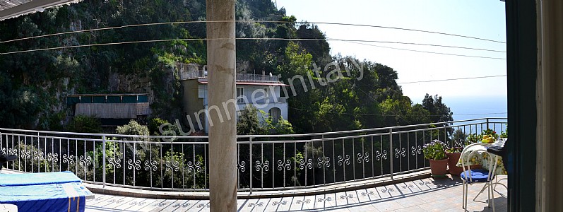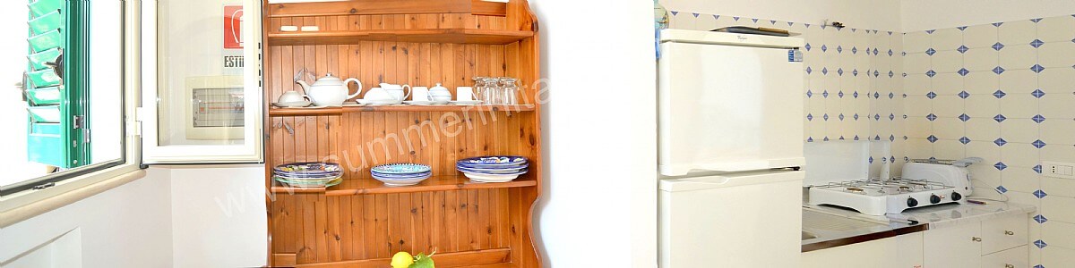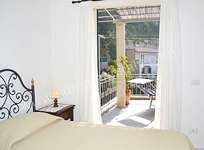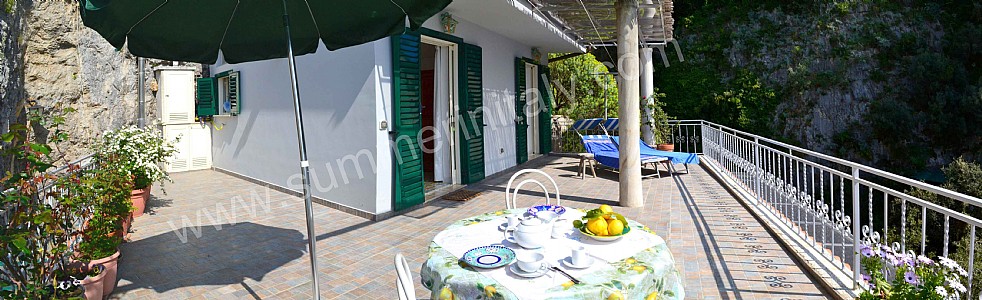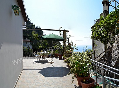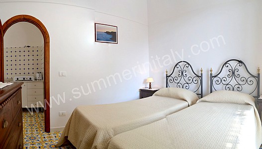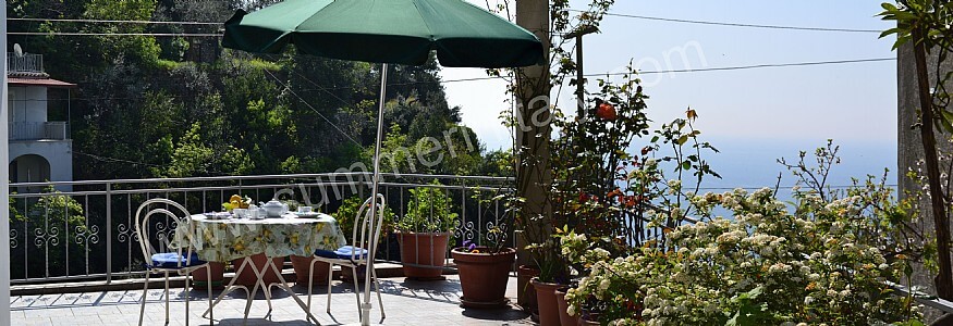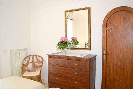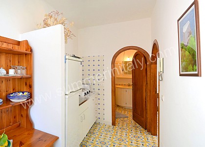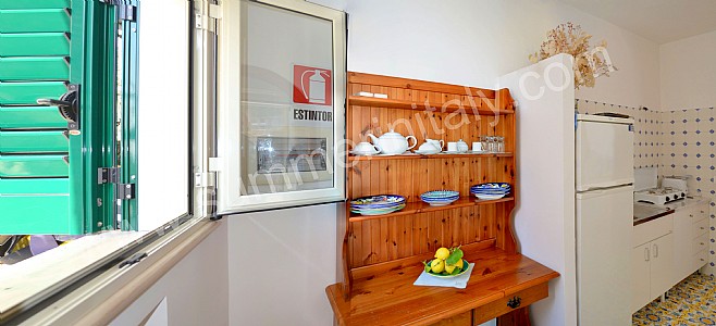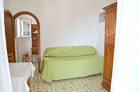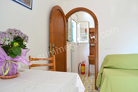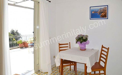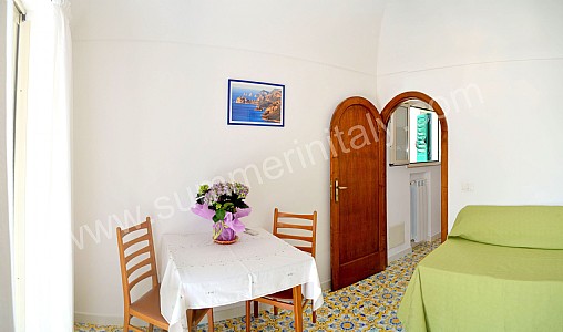 The living room is paved with tiles with inlaid handmade mayolica tiles, in the characteristic style of the Amalfi Coast. The ceiling is high and vaulted. The furnishings are bright and cheerful. The furnishings include a sofa. The dining table can accommodate four guests. In this room you will find a satellite television (local channels). From the living room you will be able to enter the terrace through a French door.