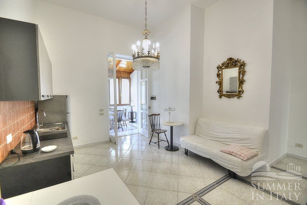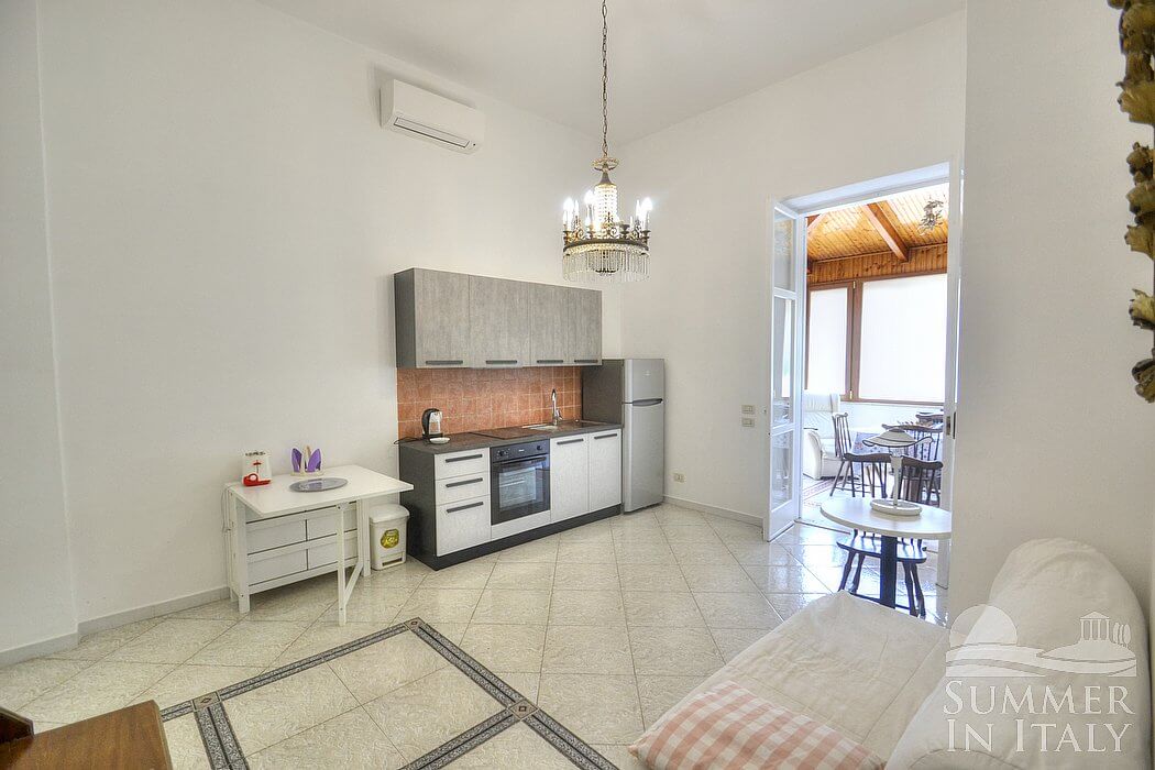 You will be able to enter the living room from the verandah through a French door. The furnishings are simple, and include a sofa. In this room an additional single bed (80 cm/32 inches) is available (if requested in advance with an additional cost -- please enquire with our staff) to make it a single room. In the living room you will also find a cooking area. The kitchenette is equipped with a two-burner induction cooker, an electric oven, a refrigerator with freezer, a dishwasher, an Italian-style coffee-maker, a toaster and a kettle. The dining table is a wall mounted table, and can accommodate two guests. The room is equipped with an air conditioning/heating unit.